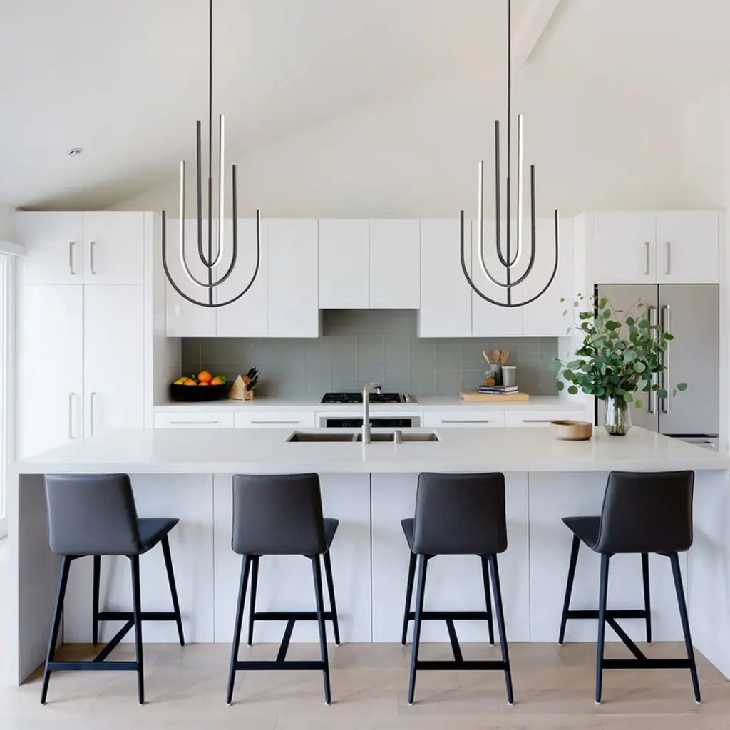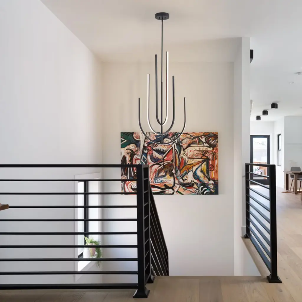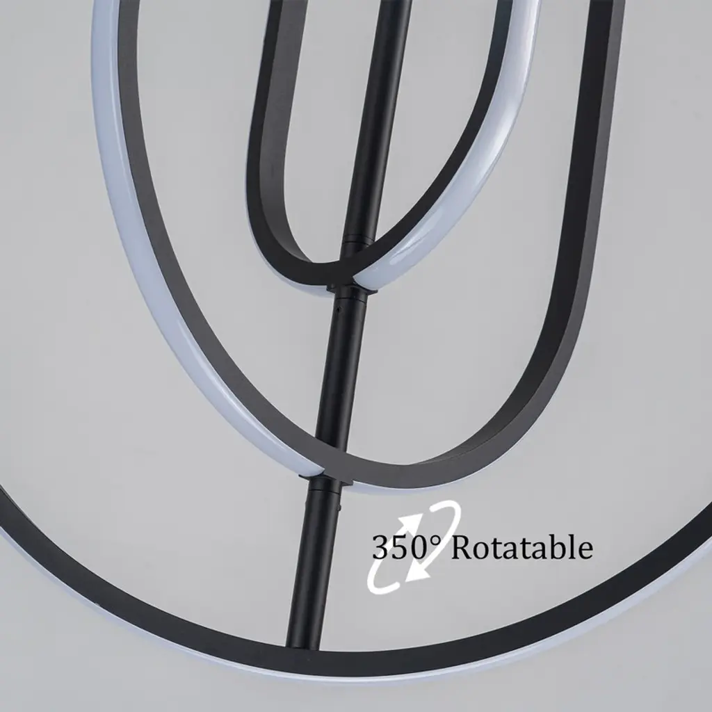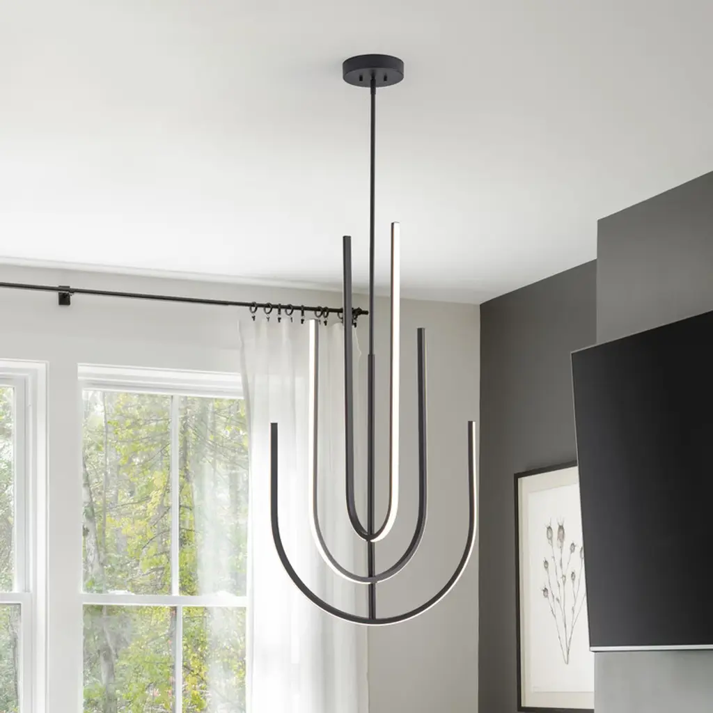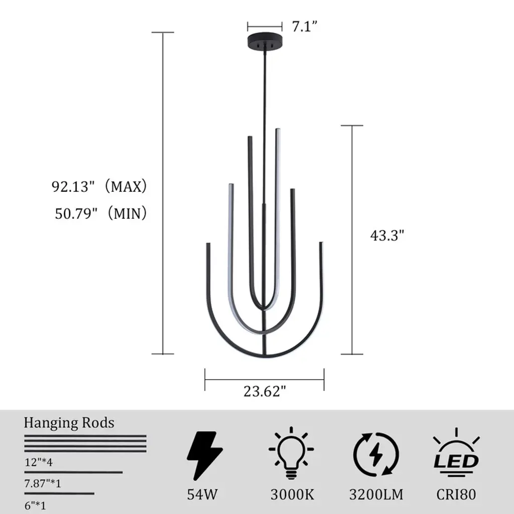 Elevate your space with a bold and sculptural statement¡ªthis 3-tier U-shaped LED chandelier combines modern form with functional elegance. Constructed with three gracefully curved aluminum light tubes in descending sizes (D23 3/5", D 16 9/10", D10"), each ring emits a soft, even glow through integrated LED strips and silicone diffusers. Delivering a total of 54 watts of warm 3000K light at 3200 lumens with a high color rendering index (CRI 80+), it bathes your space in natural, flattering illumination. The chandelier¡¯s total height adjusts from 50 2/5" to 92 1/10" with included rod combinations and universal connector, making it ideal for both standard and high ceilings. Finished in sleek black with minimalist lines, it blends seamlessly into modern dining rooms, double-height foyers, or open-plan living areas.