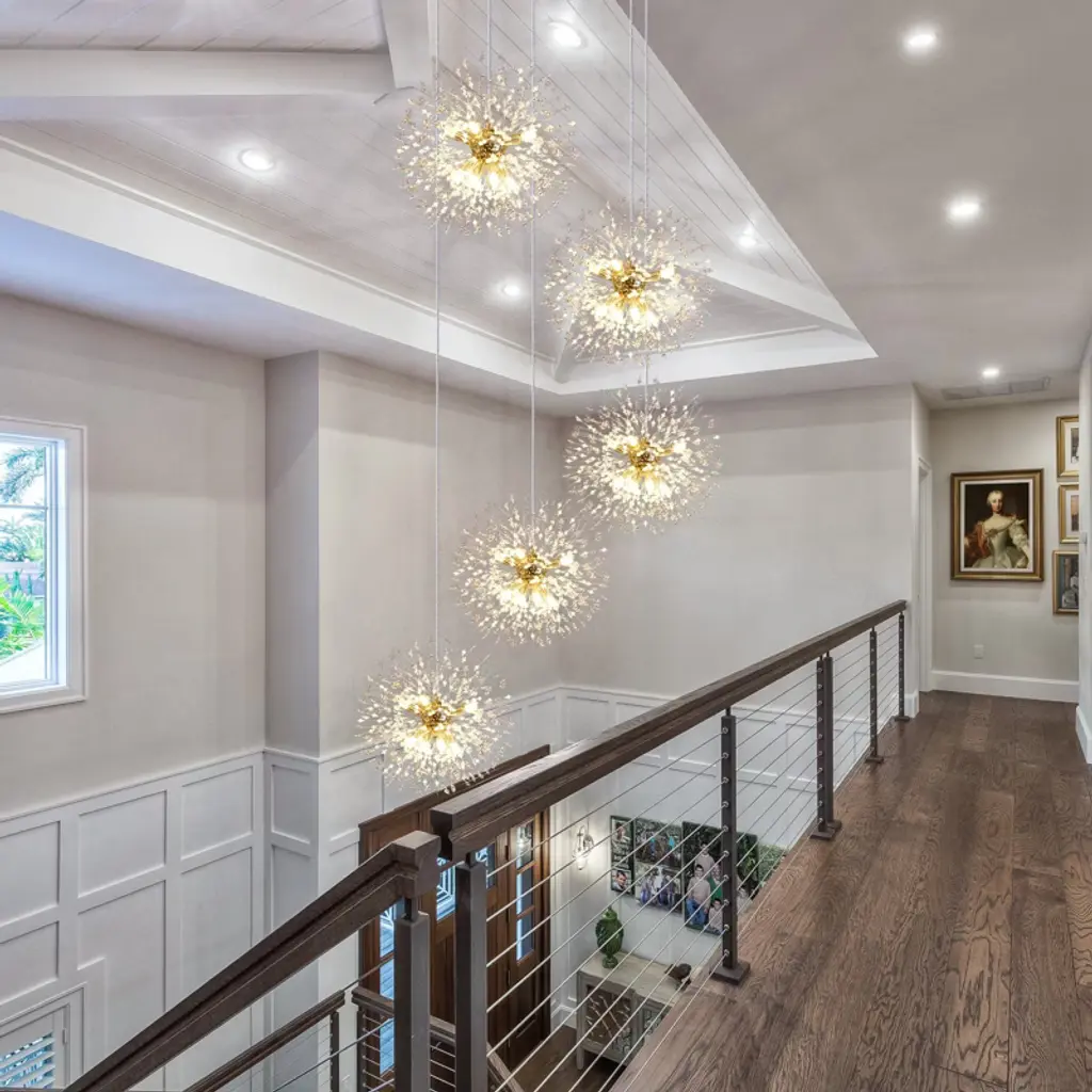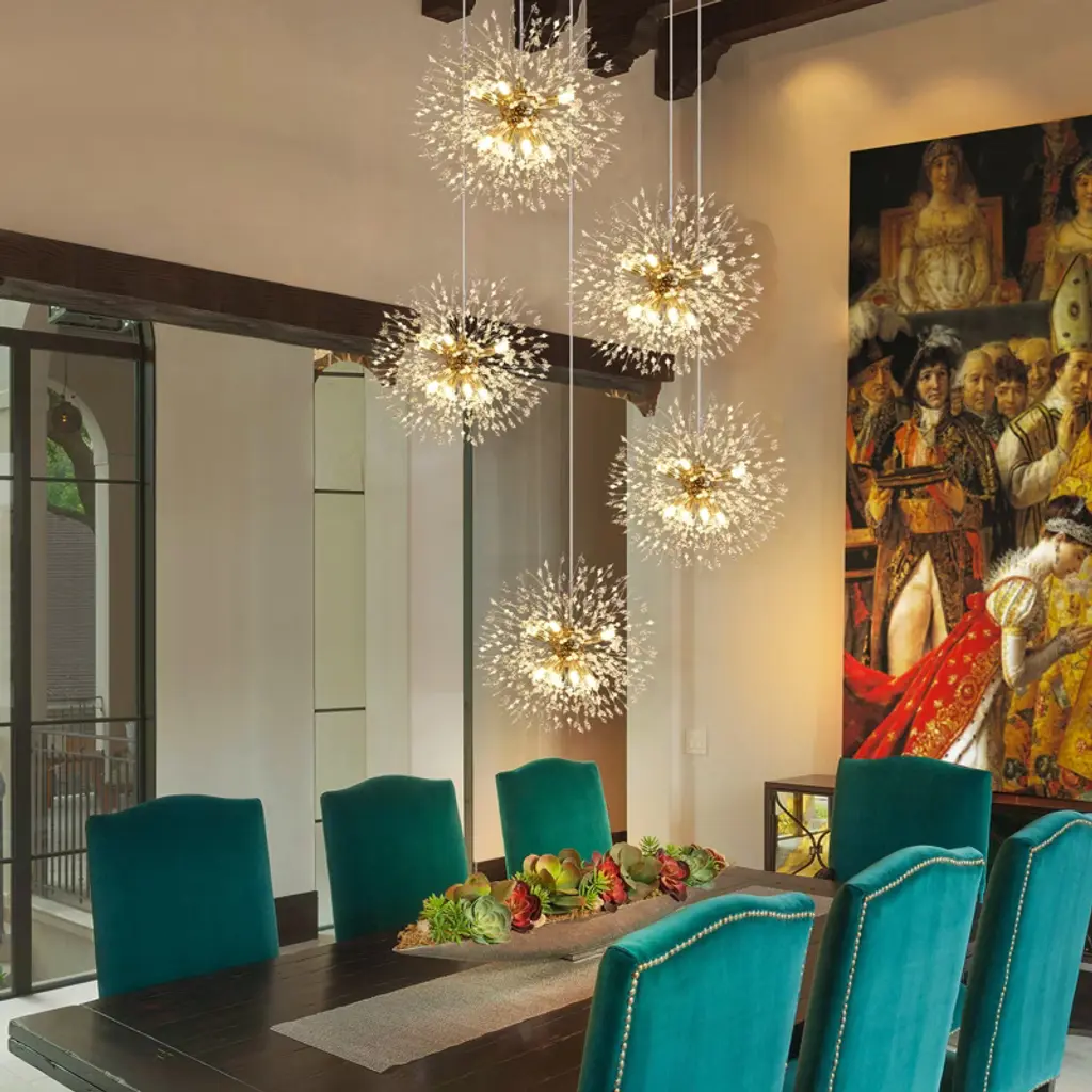 This modern 5-globe dandelion pendant light enhances any space with its artistic design. The fixture includes 40 G9 LED bulbs, providing bright and energy-efficient lighting. Perfect for dining areas, living rooms, and high-ceiling spaces, it’s easy to install and elevates any décor with elegance.