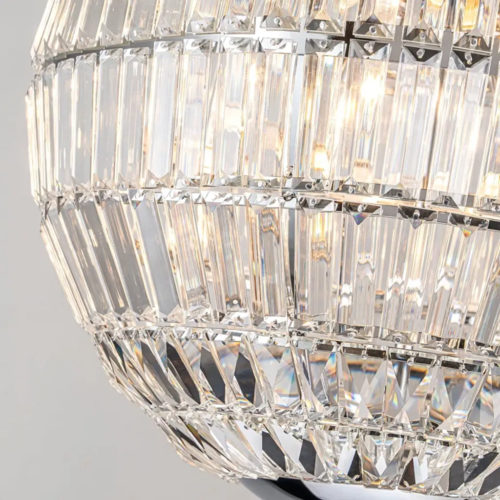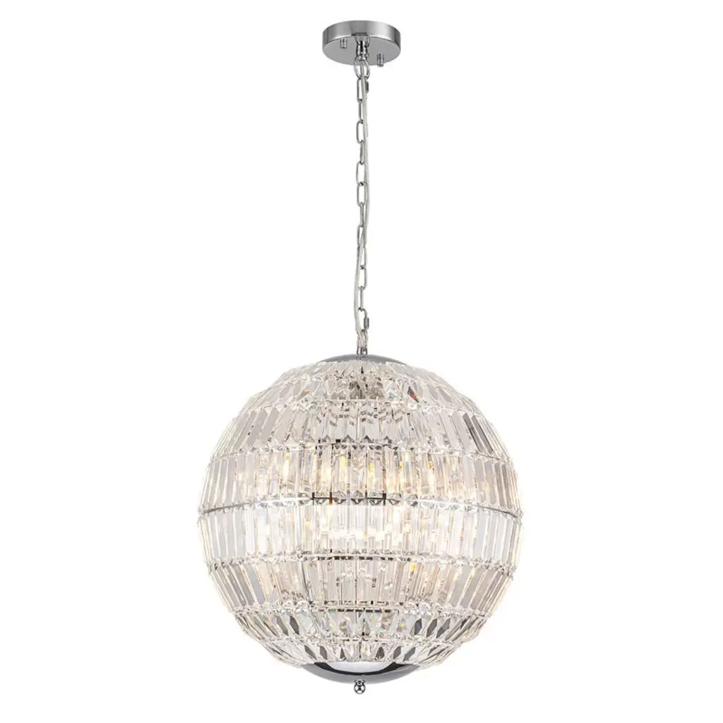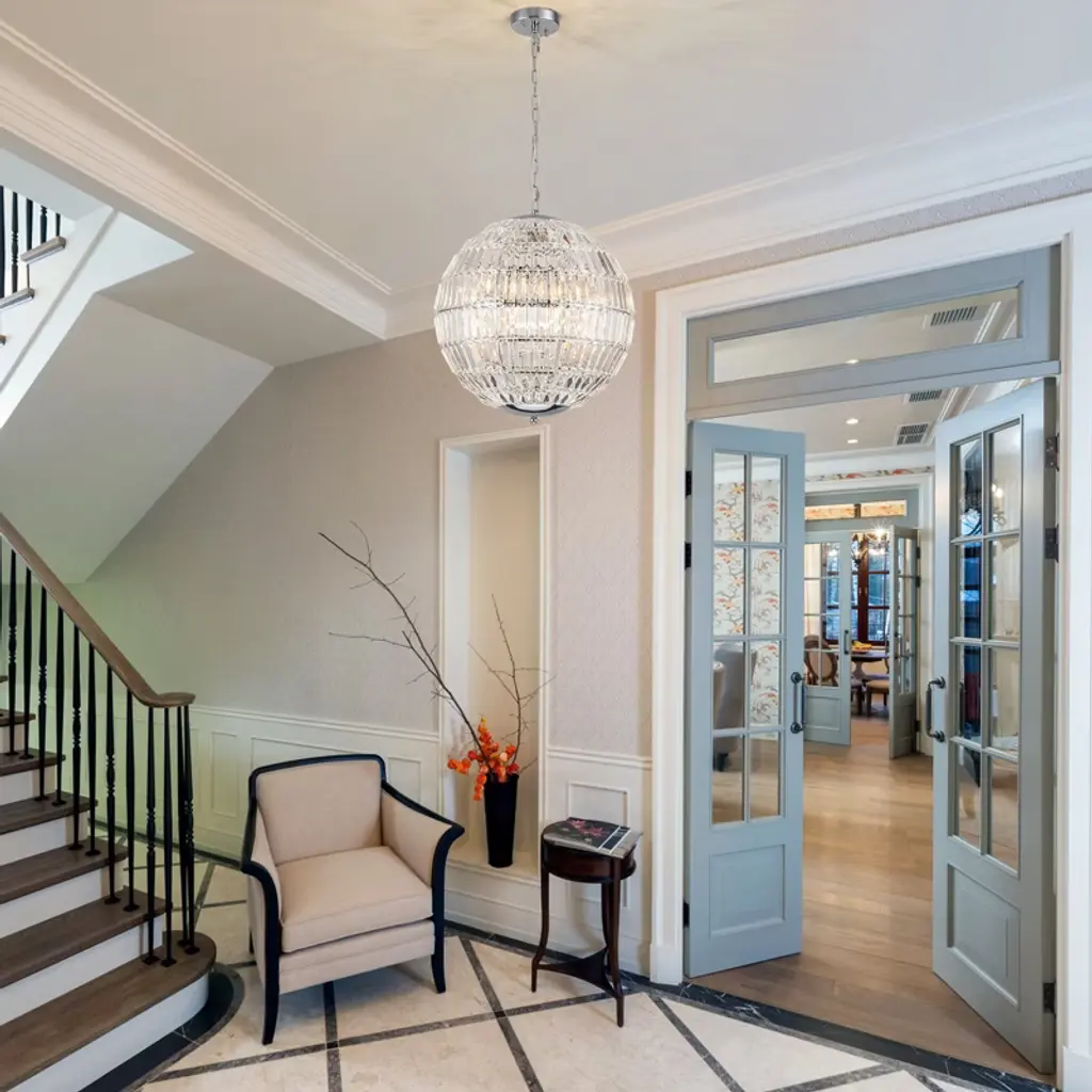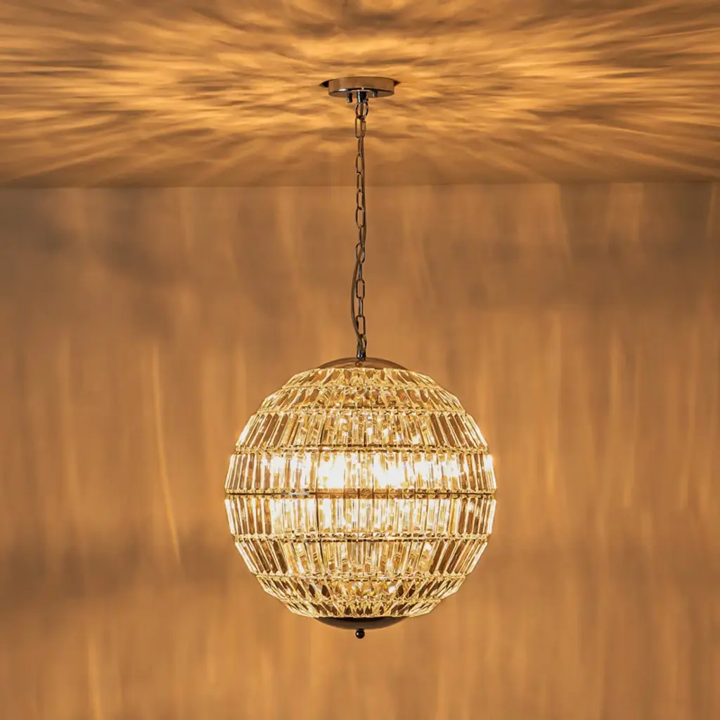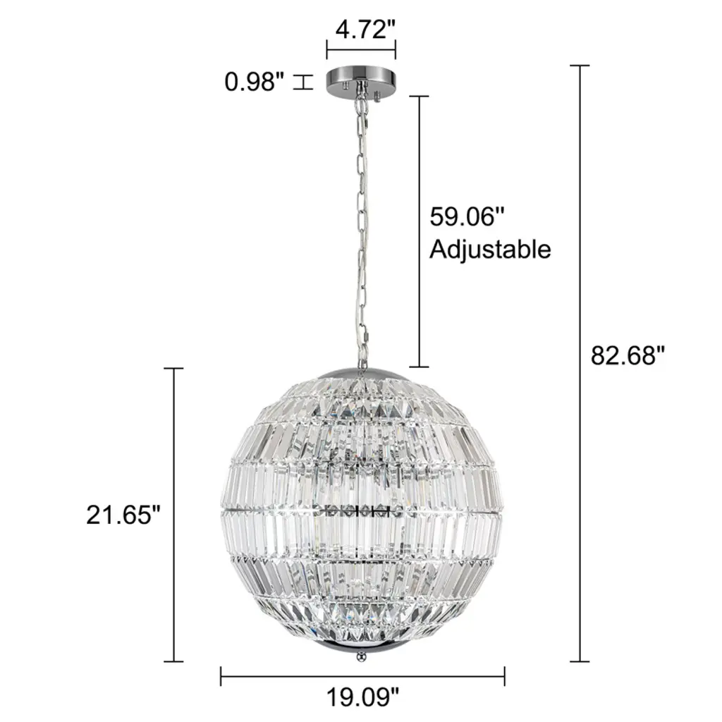 Add vintage charm and luxury to your home with this stunning crystal globe chandelier. Featuring exquisite hand-bound crystal beads and a solid metal frame, it seamlessly combines post-modern design with glamorous French elegance. Each high-quality crystal is meticulously placed to maximize light refraction, creating a dazzling centerpiece for dining rooms, foyers, or living areas. The adjustable chain and sloped ceiling-compatible canopy offer versatile installation options. Fully dimmable when used with compatible dimmer bulbs and switches (not included), it allows you to customize the lighting ambiance. Includes all USA standard mounting hardware for easy hardwired installation.