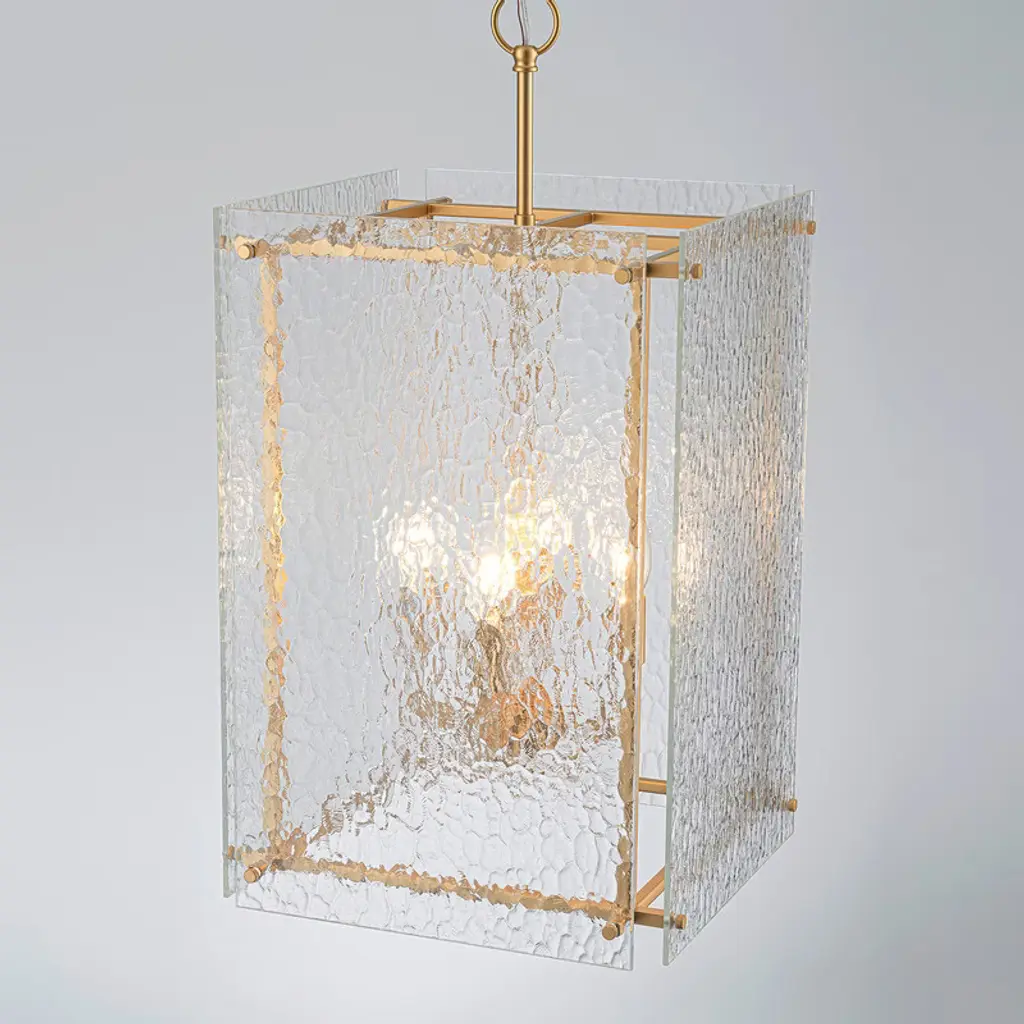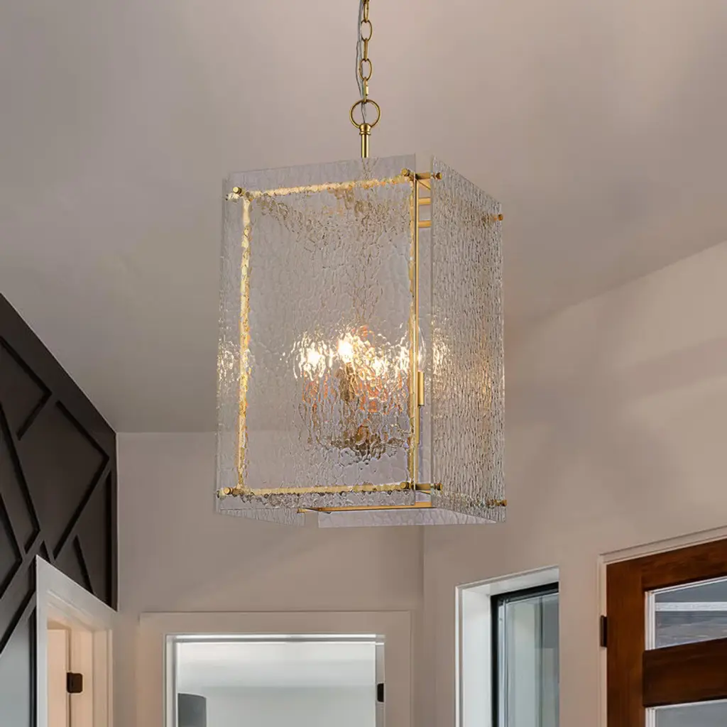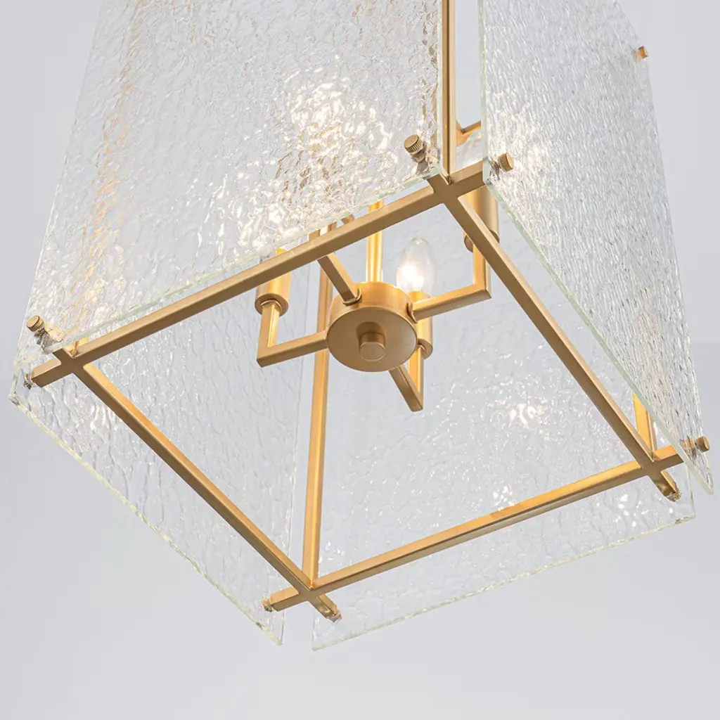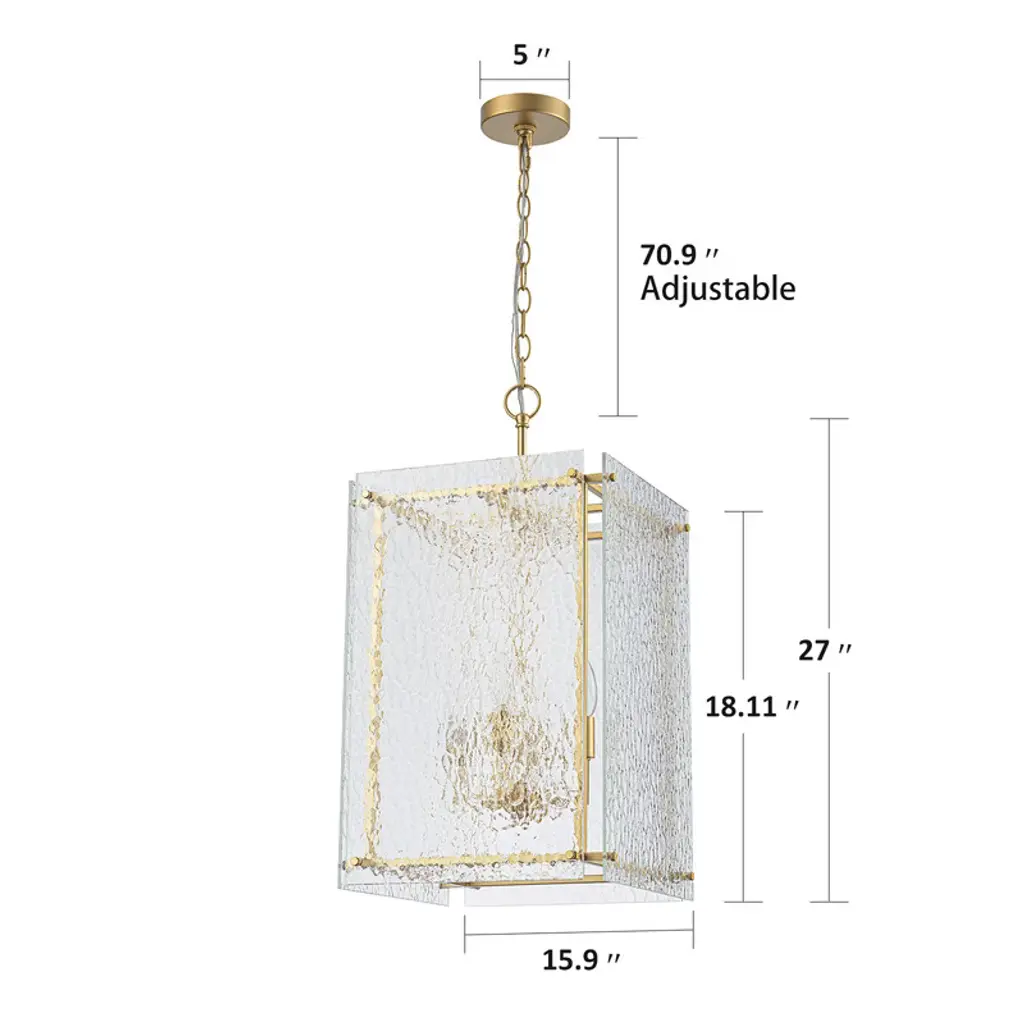 This 4-light pendant chandelier offers striking architectural charm with its lantern-style kitchen window design, built from four oversized ultra-hammered glass panels. Measuring 15 9/10" W x 18 1/10"H, the crisp iron frame is finished in matte gold and detailed with a crystal finial hook, swinging rod, and structured top loop. Inside are 4 E12 sockets (bulbs not included), ideal for LED or vintage filament bulbs. ETL certification label is provided to meet safety standards. This lantern-style fixture is perfect for grand foyers, kitchen islands, or stairwells needing statement lighting with refined transparency.
