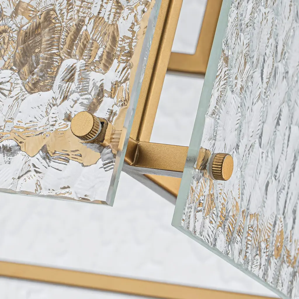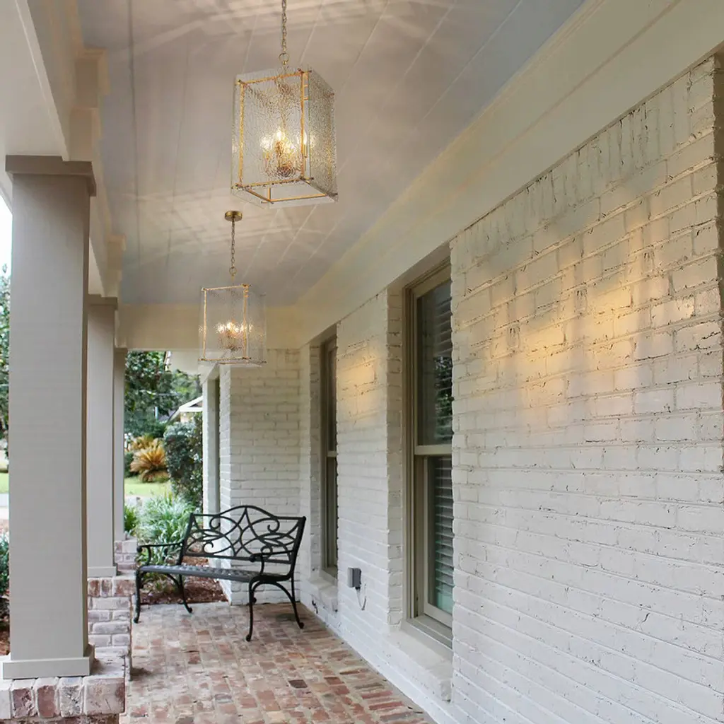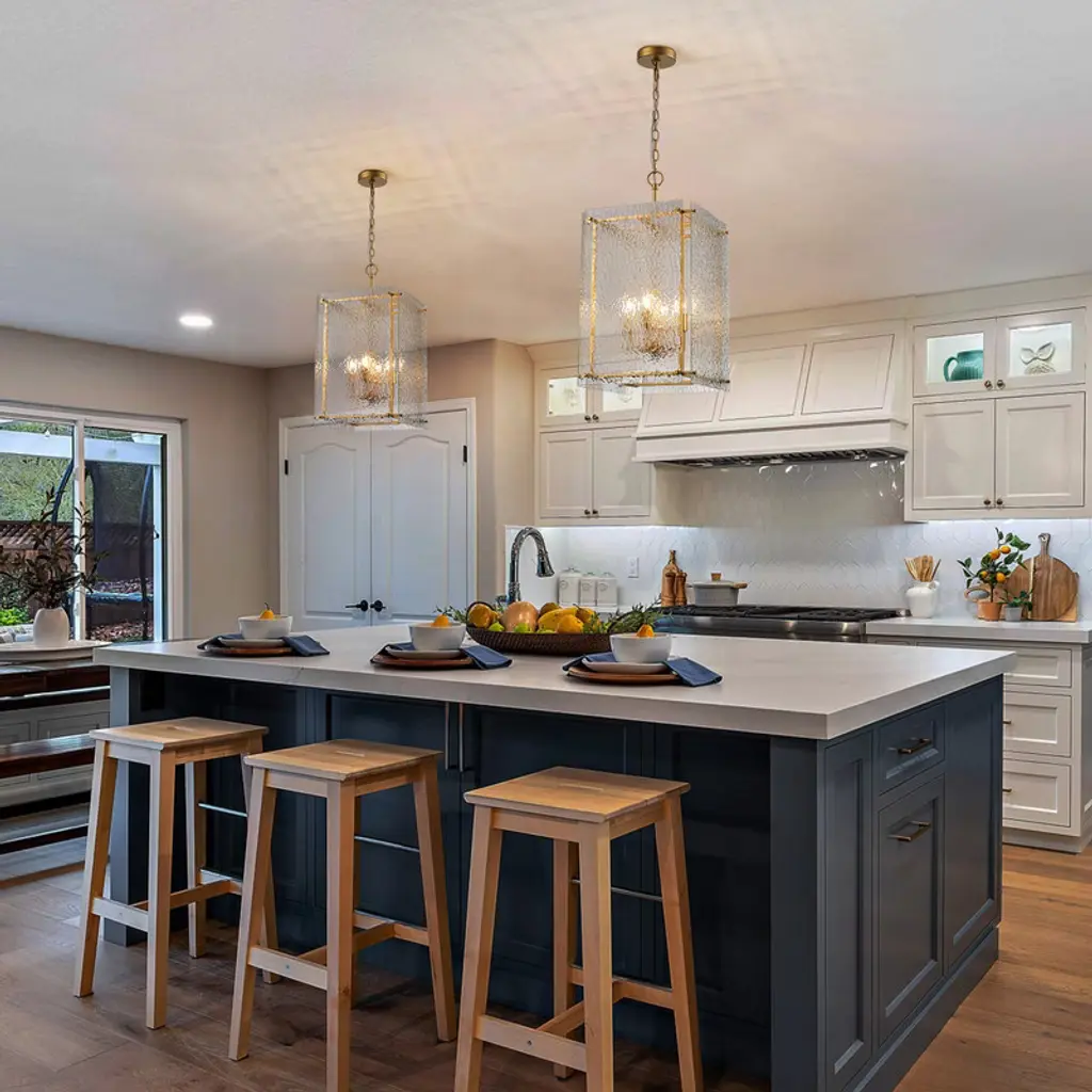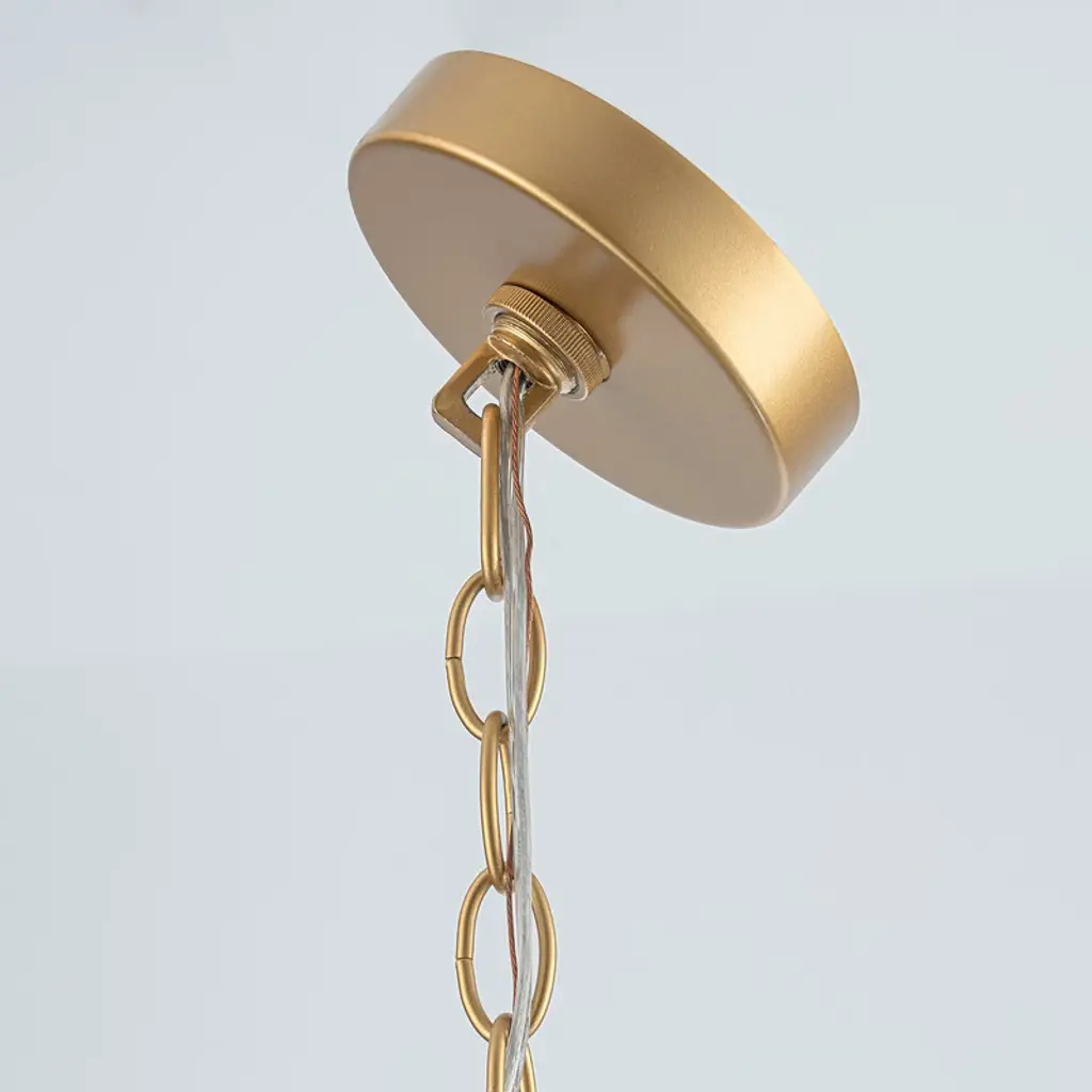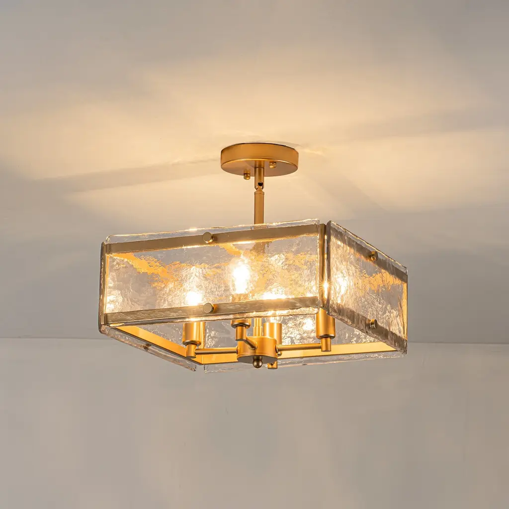 This 4-light pendant chandelier offers striking architectural charm with its lantern-style kitchen window design, built from four oversized ultra-hammered glass panels. Measuring 15 9/10" W x 18 1/10"H, the crisp iron frame is finished in matte gold and detailed with a crystal finial hook, swinging rod, and structured top loop. Inside are 4 E12 sockets (bulbs not included), ideal for LED or vintage filament bulbs. ETL certification label is provided to meet safety standards. This lantern-style fixture is perfect for grand foyers, kitchen islands, or stairwells needing statement lighting with refined transparency.