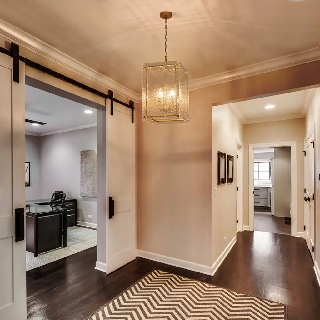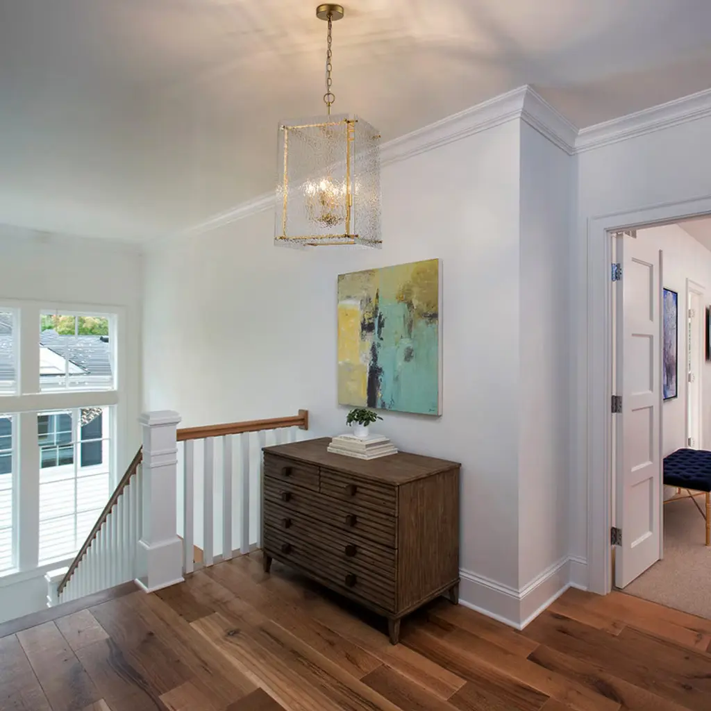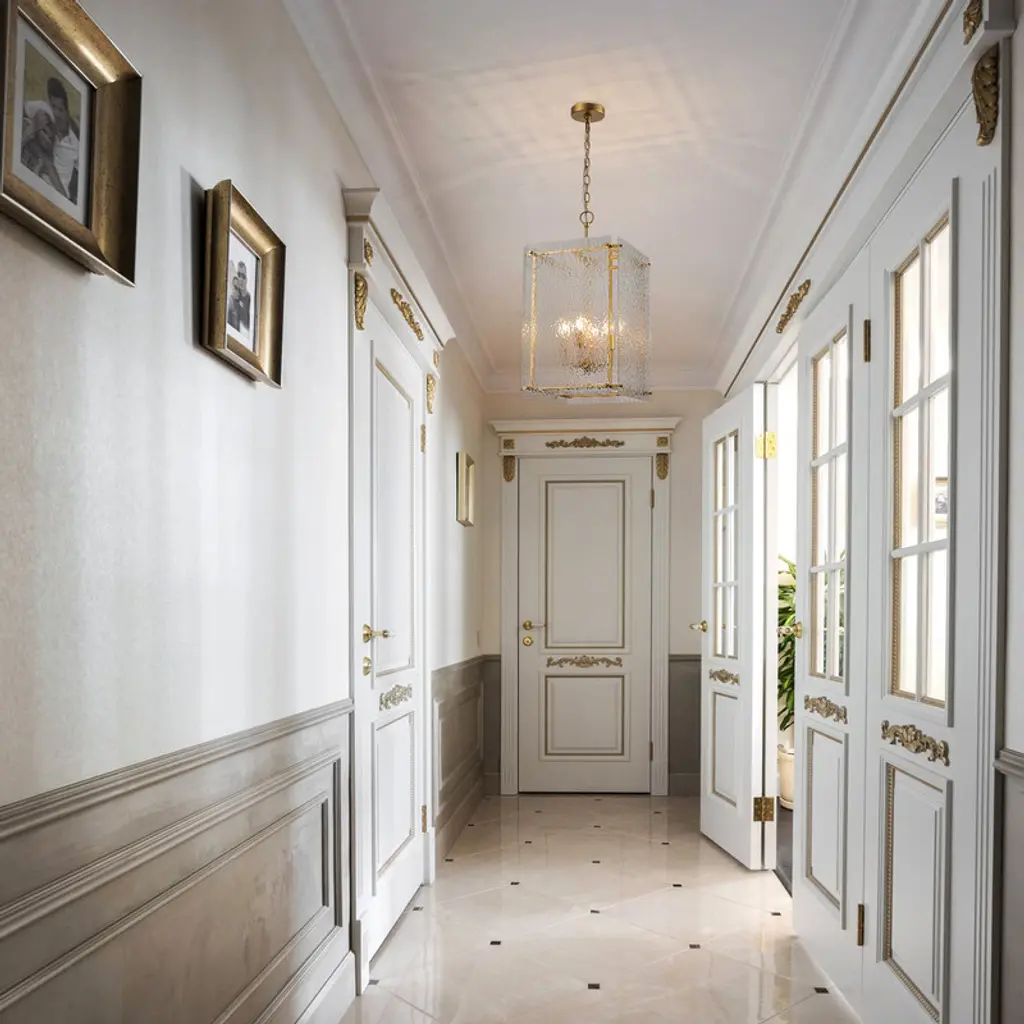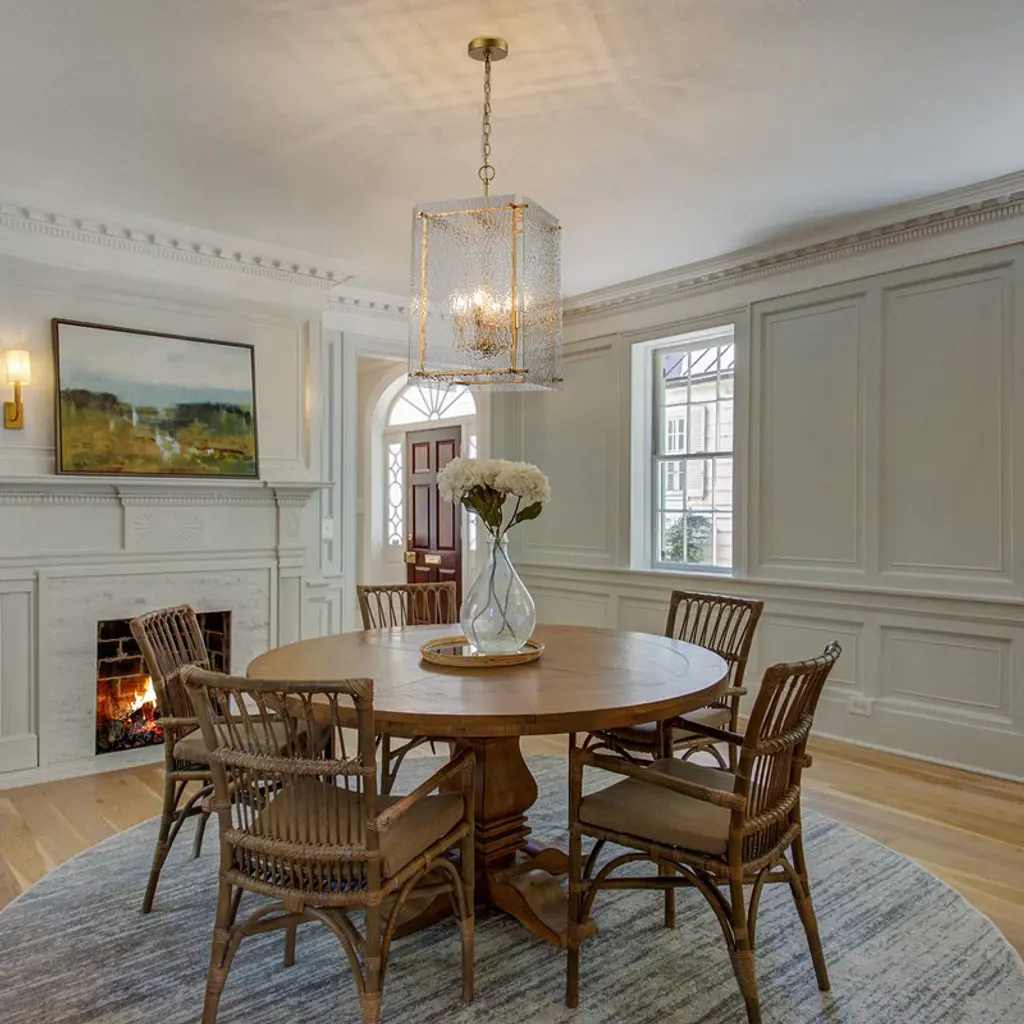 This 4-light pendant chandelier offers striking architectural charm with its lantern-style kitchen window design, built from four oversized ultra-hammered glass panels. Measuring 15 9/10" W x 18 1/10"H, the crisp iron frame is finished in matte gold and detailed with a crystal finial hook, swinging rod, and structured top loop. Inside are 4 E12 sockets (bulbs not included), ideal for LED or vintage filament bulbs. ETL certification label is provided to meet safety standards. This lantern-style fixture is perfect for grand foyers, kitchen islands, or stairwells needing statement lighting with refined transparency.