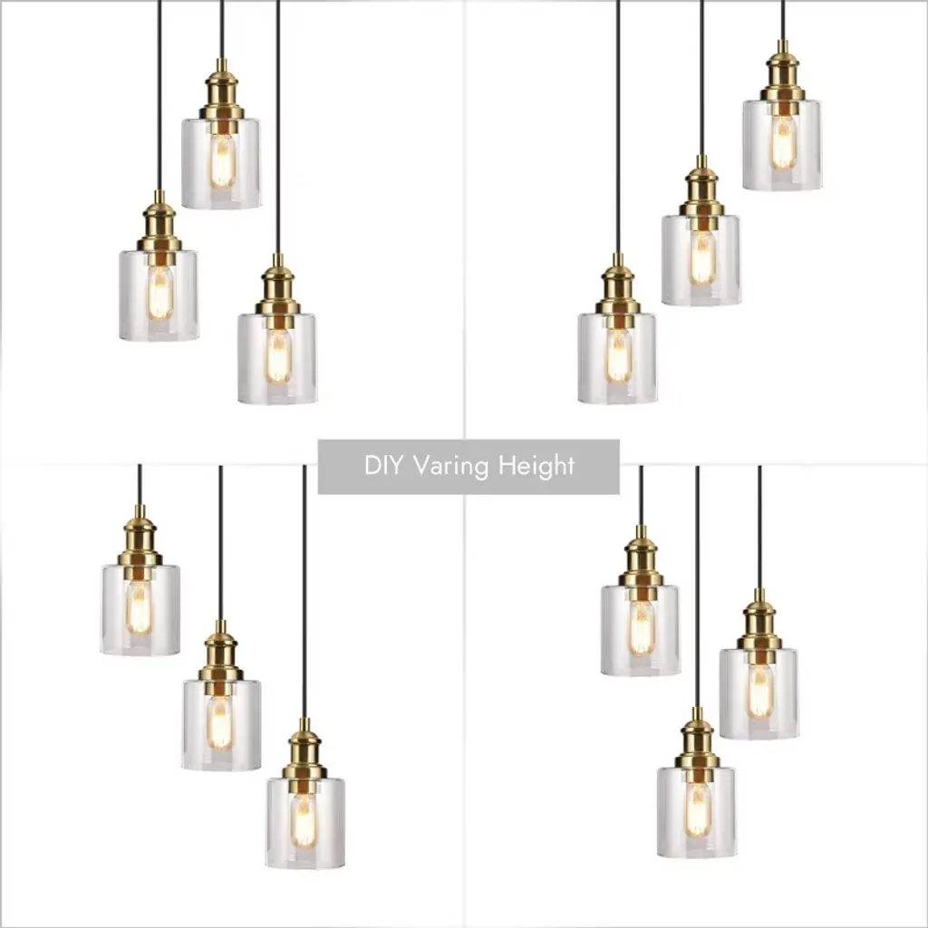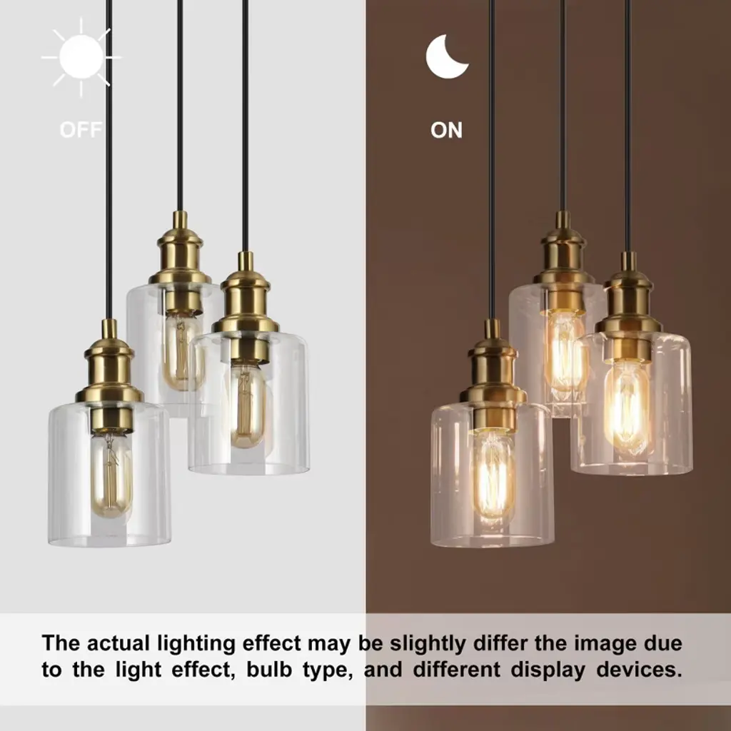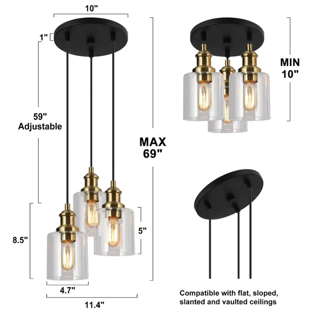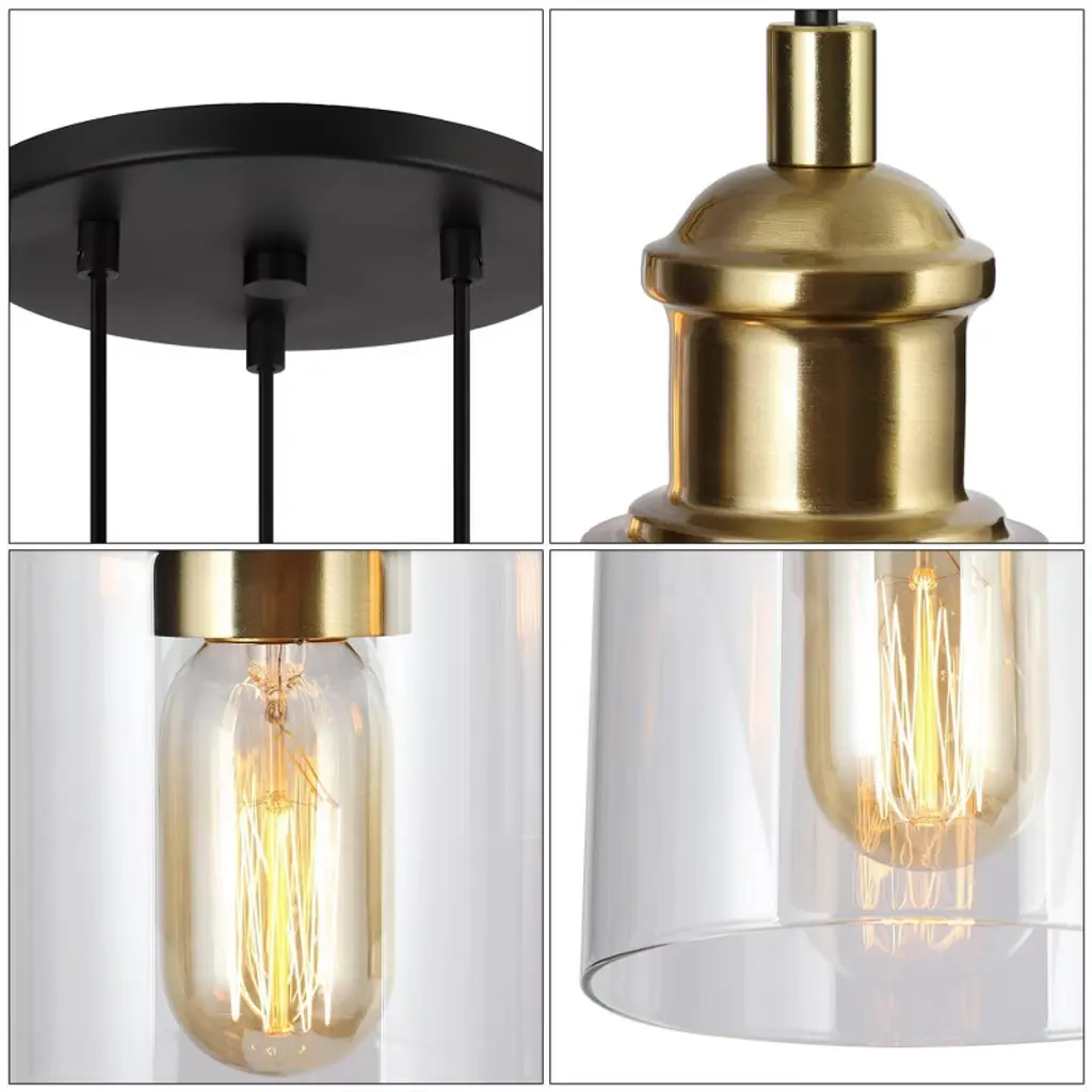 Add a sophisticated glow to your kitchen island, entryway, or stairwell with this 3-light cluster pendant from LNC. Featuring a sleek matte black canopy paired with polished brass accents, each light is suspended by an adjustable cord up to 59" long for a customizable hanging height (11.5"–69"). The trio of clear cylindrical glass shades softly frames exposed bulbs, offering a modern-industrial vibe with warm, ambient illumination. Designed to work seamlessly with flat, sloped, or vaulted ceilings, this compact yet striking fixture adds layered light and contemporary character to any setting. Bulbs not included.