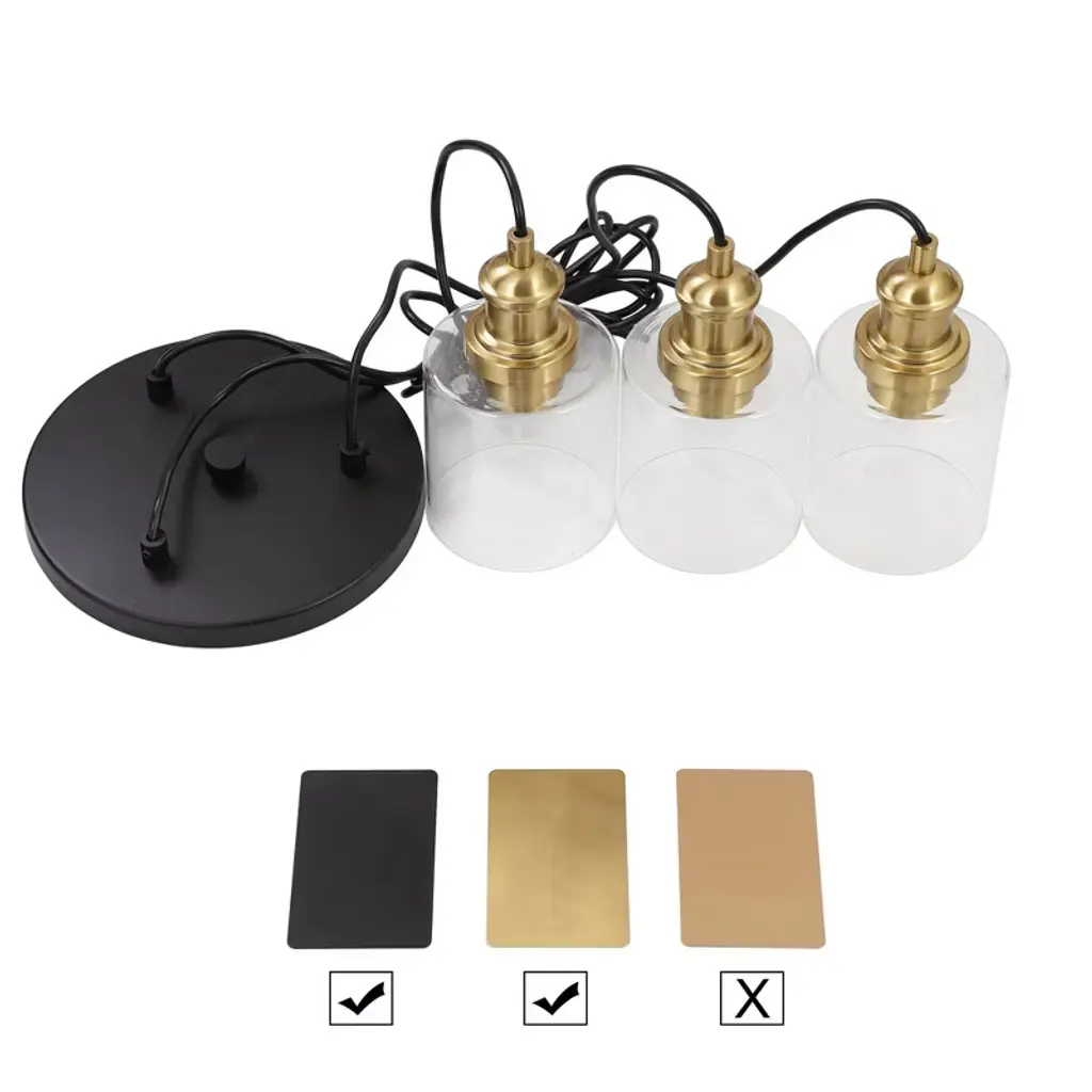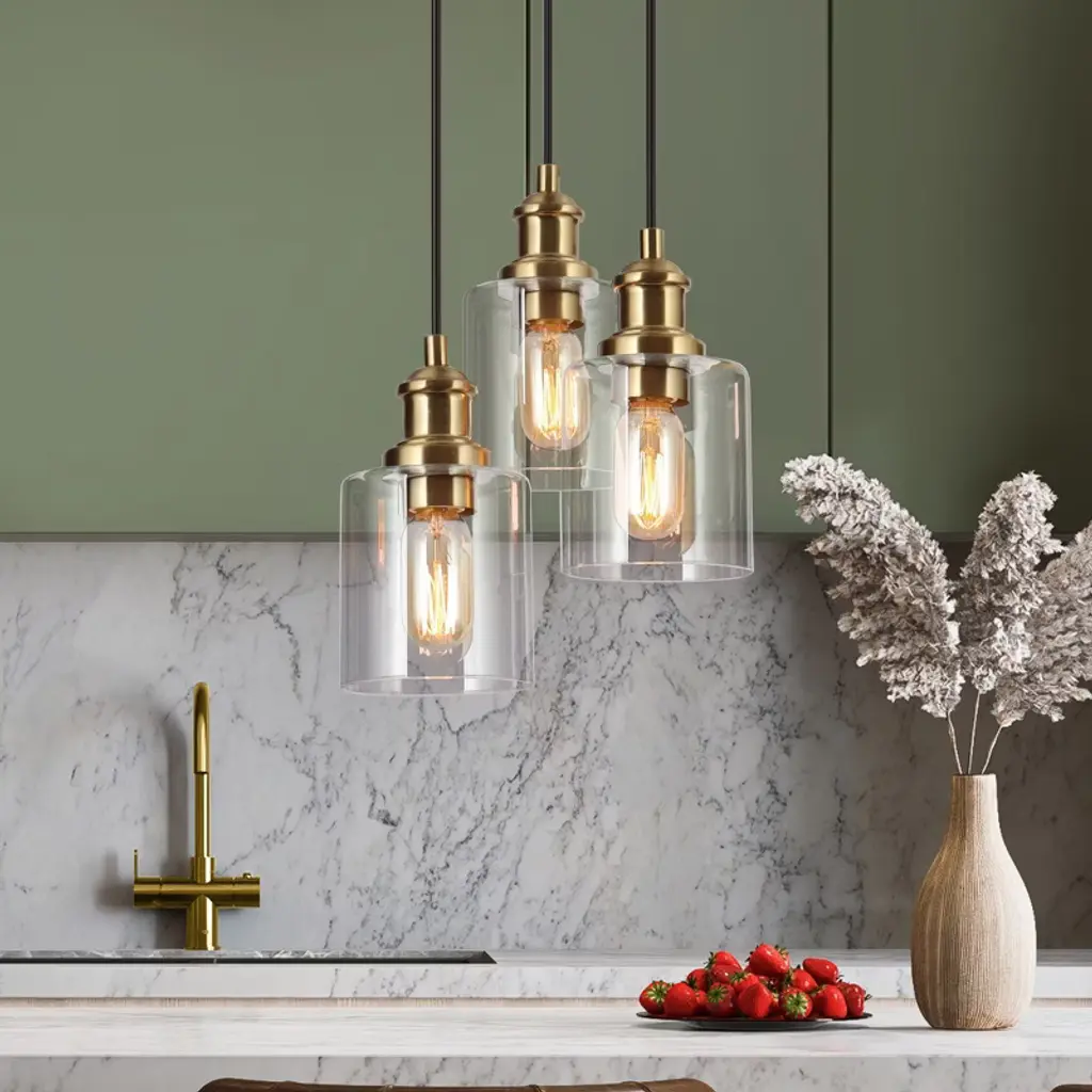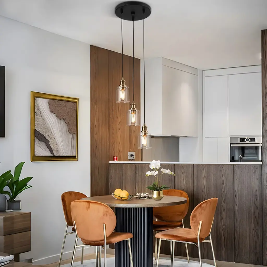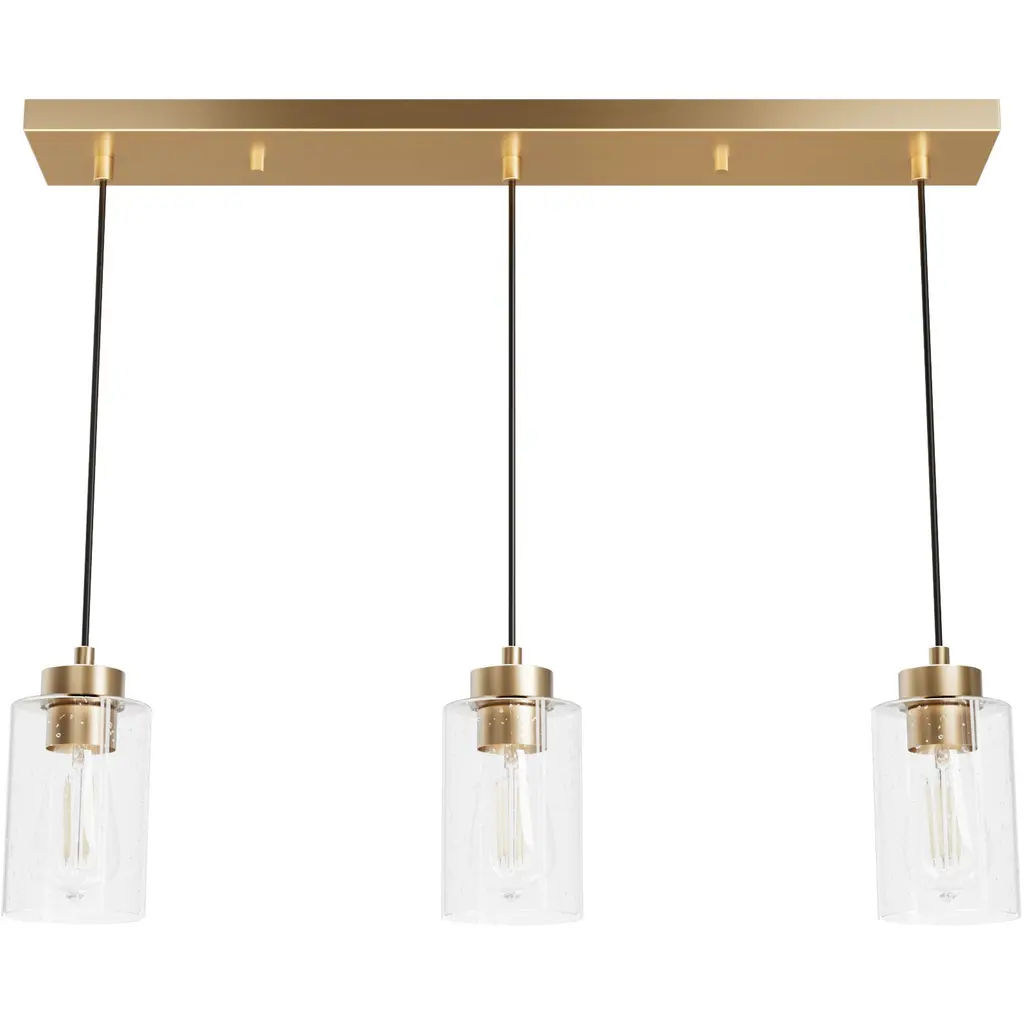 Add a sophisticated glow to your kitchen island, entryway, or stairwell with this 3-light cluster pendant from LNC. Featuring a sleek matte black canopy paired with polished brass accents, each light is suspended by an adjustable cord up to 59" long for a customizable hanging height (11.5"–69"). The trio of clear cylindrical glass shades softly frames exposed bulbs, offering a modern-industrial vibe with warm, ambient illumination. Designed to work seamlessly with flat, sloped, or vaulted ceilings, this compact yet striking fixture adds layered light and contemporary character to any setting. Bulbs not included.