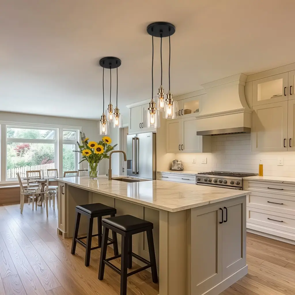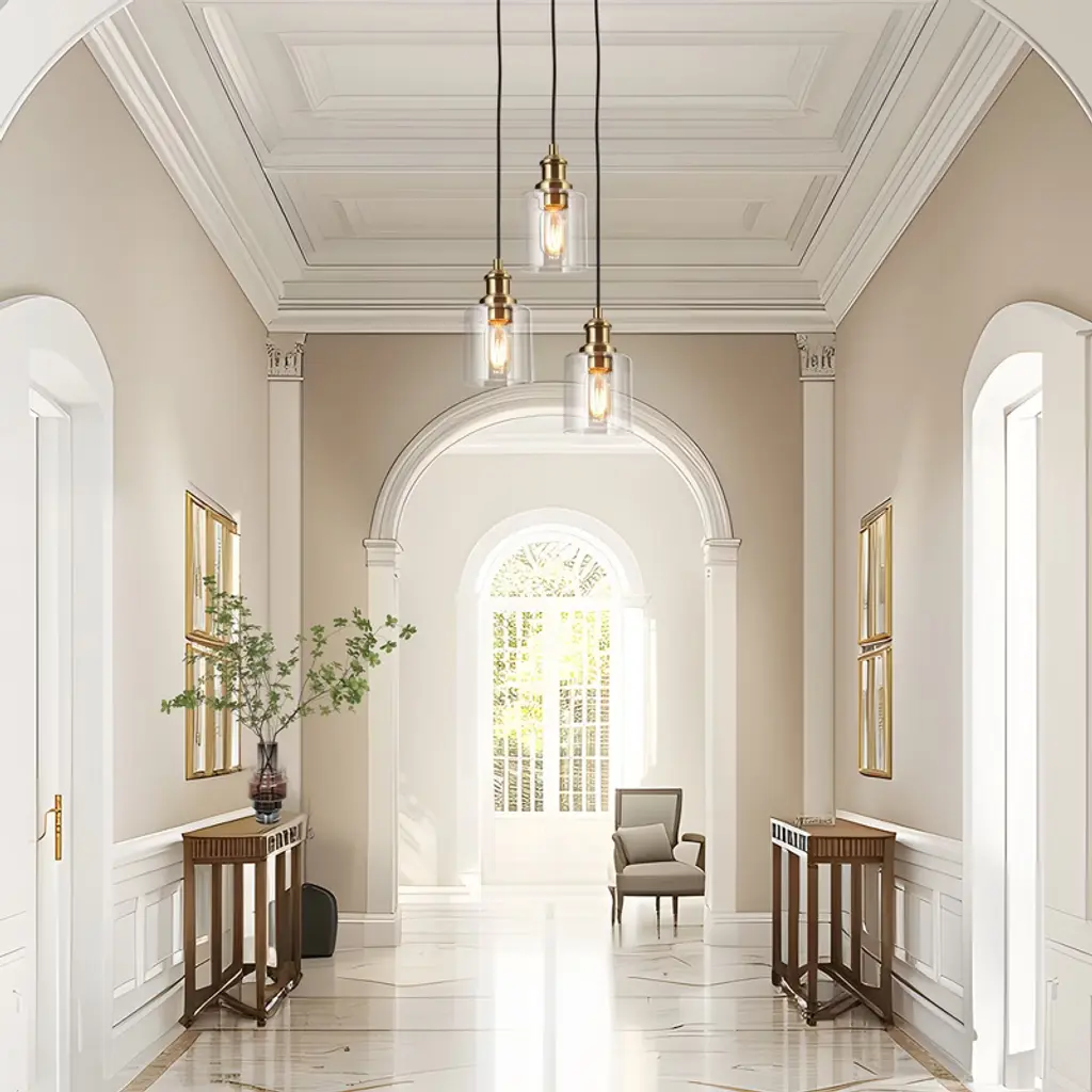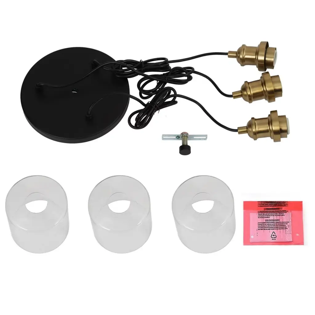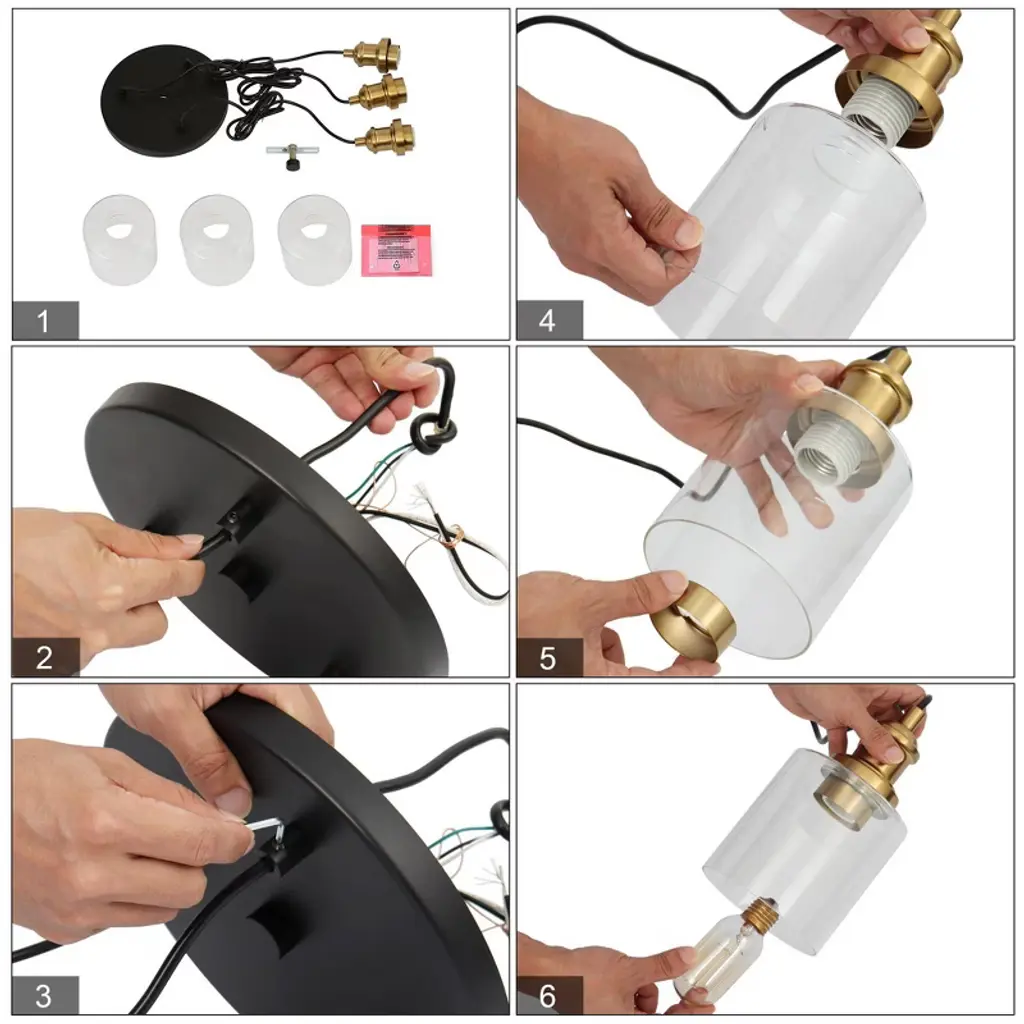 Add a sophisticated glow to your kitchen island, entryway, or stairwell with this 3-light cluster pendant from LNC. Featuring a sleek matte black canopy paired with polished brass accents, each light is suspended by an adjustable cord up to 59" long for a customizable hanging height (11.5"–69"). The trio of clear cylindrical glass shades softly frames exposed bulbs, offering a modern-industrial vibe with warm, ambient illumination. Designed to work seamlessly with flat, sloped, or vaulted ceilings, this compact yet striking fixture adds layered light and contemporary character to any setting. Bulbs not included.