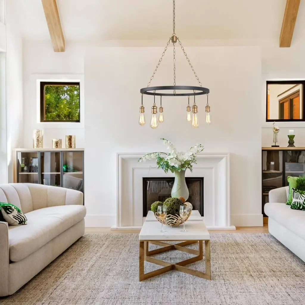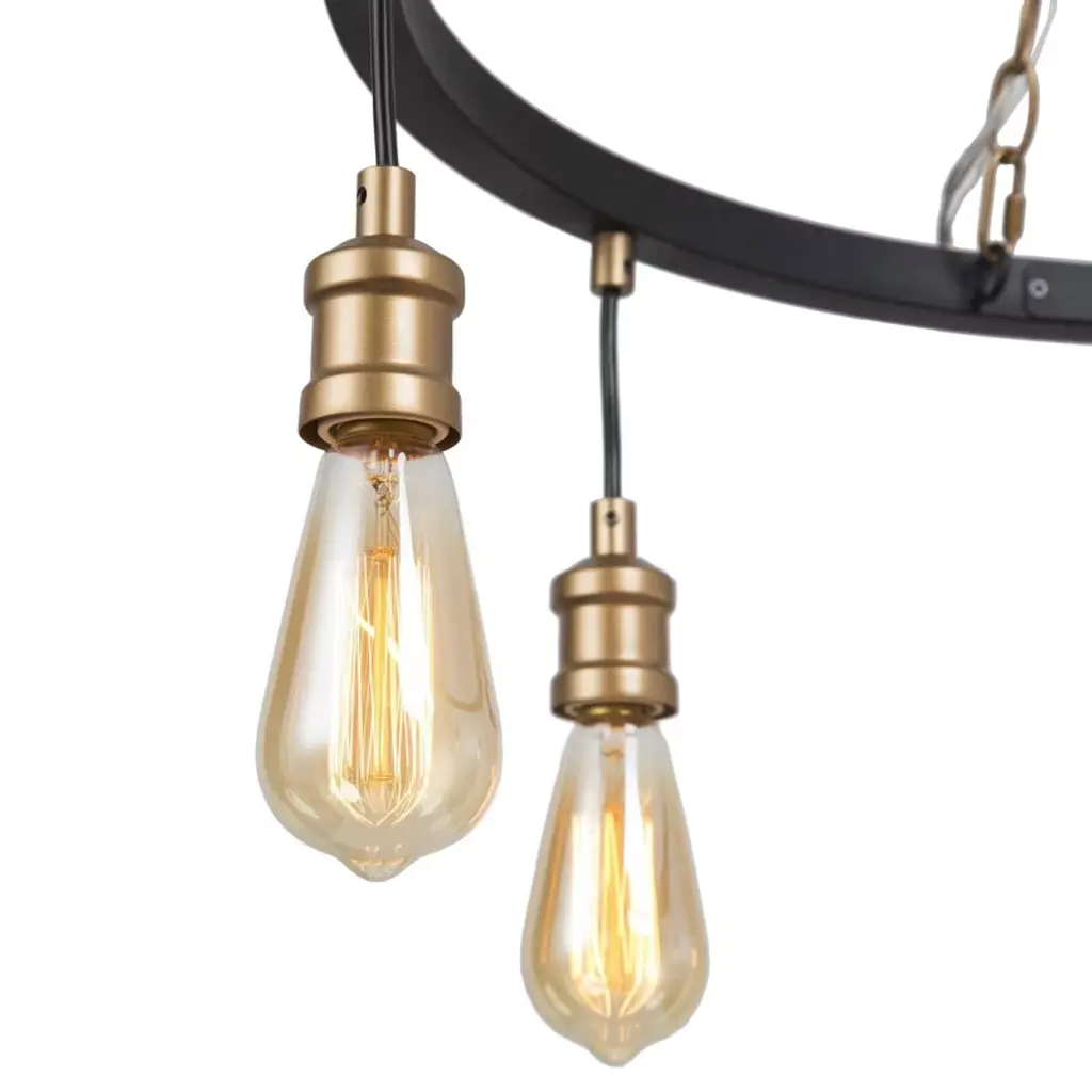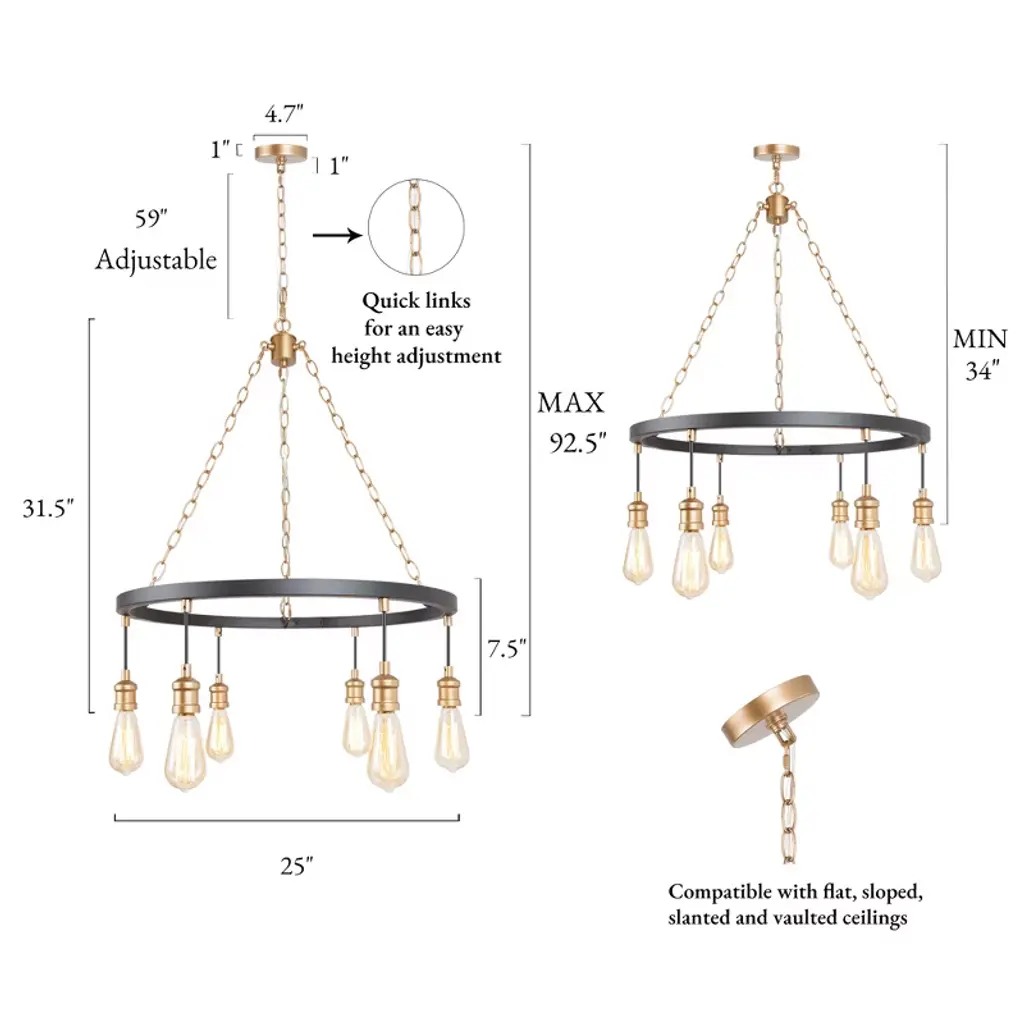 Make a bold statement with this 6-light round chandelier, blending industrial character with modern elegance. Featuring a matte black ring frame contrasted by gold accents and suspended by adjustable chains, this fixture showcases six exposed bulbs that deliver warm, ambient light. Perfect for illuminating dining rooms, foyers, or loft-style spaces, the open design enhances visual impact without overwhelming the room. With an adjustable height and sloped ceiling compatibility, this chandelier offers both drama and versatility for your home.