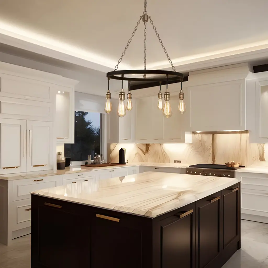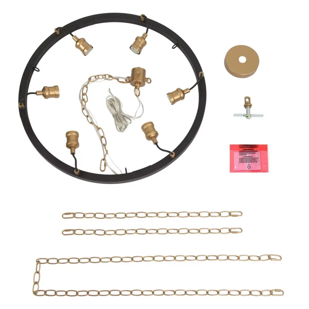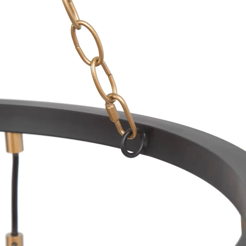 Make a bold statement with this 6-light round chandelier, blending industrial character with modern elegance. Featuring a matte black ring frame contrasted by gold accents and suspended by adjustable chains, this fixture showcases six exposed bulbs that deliver warm, ambient light. Perfect for illuminating dining rooms, foyers, or loft-style spaces, the open design enhances visual impact without overwhelming the room. With an adjustable height and sloped ceiling compatibility, this chandelier offers both drama and versatility for your home.