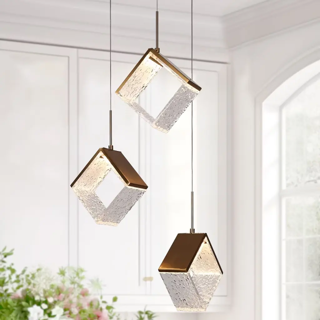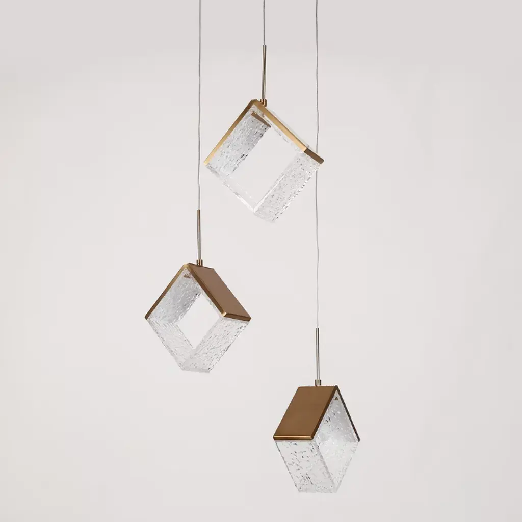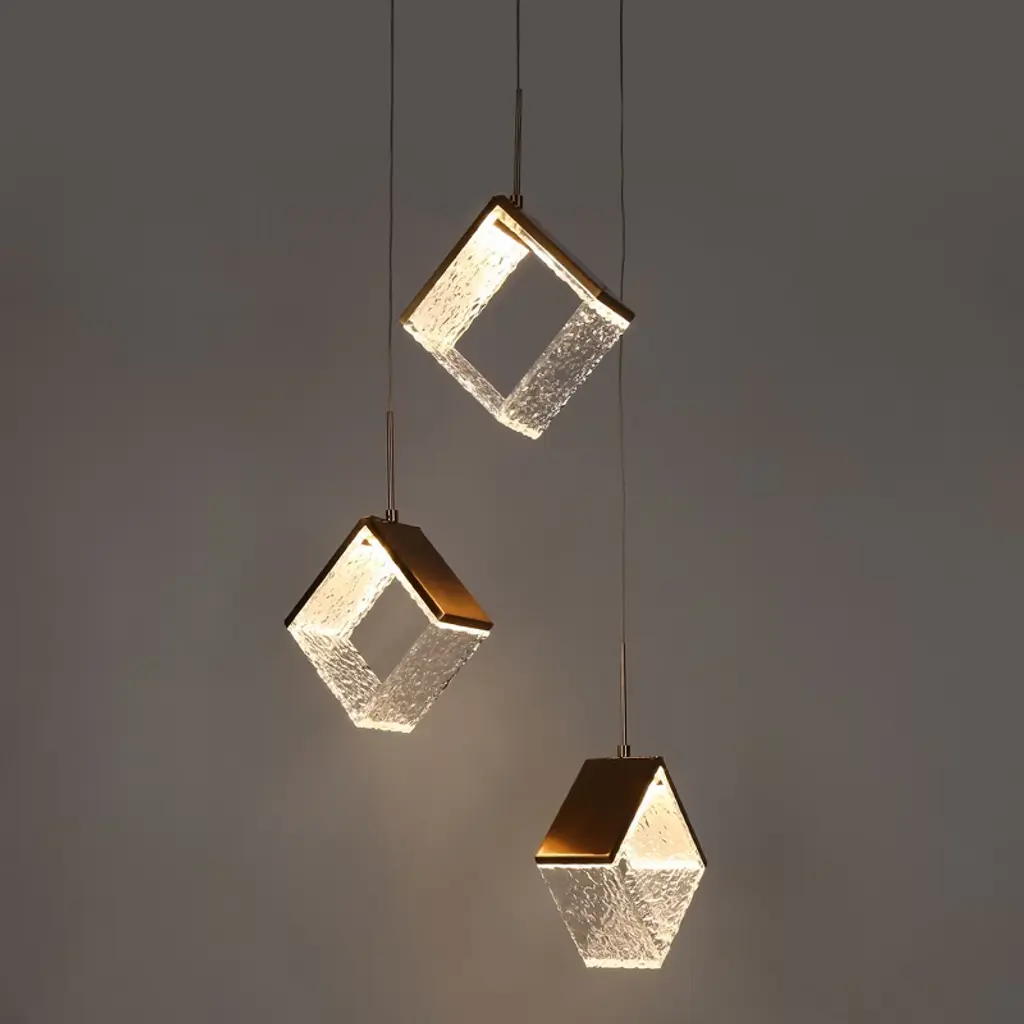 This 3-light pendant light presents a stunning visual display with its unique cluster shape, featuring three cubic acrylic lampshades that boast a textured surface reminiscent of cracked ice. The lampshades are designed to diffuse light softly, creating a warm and inviting atmosphere in any space they adorn. Each shade is suspended at varying lengths from a central canopy, lending a dynamic sense of movement and depth to the arrangement.