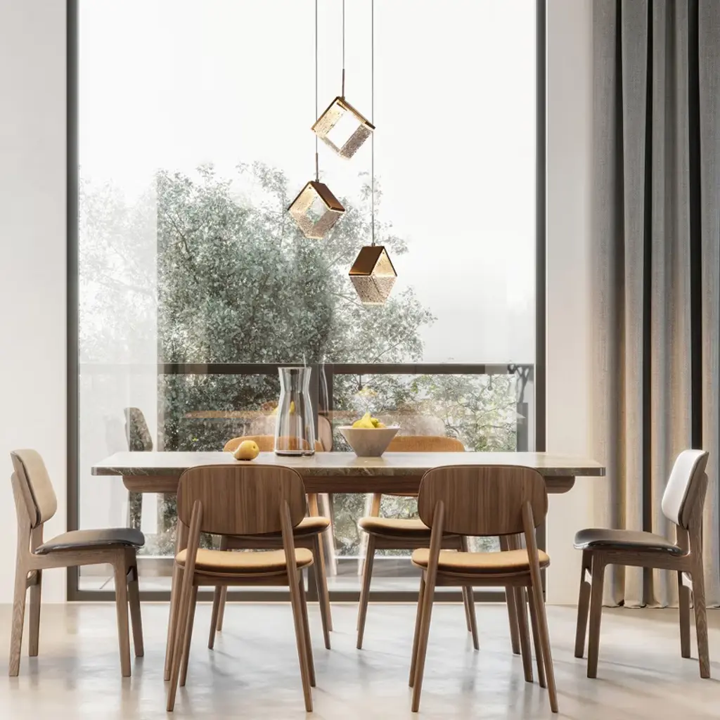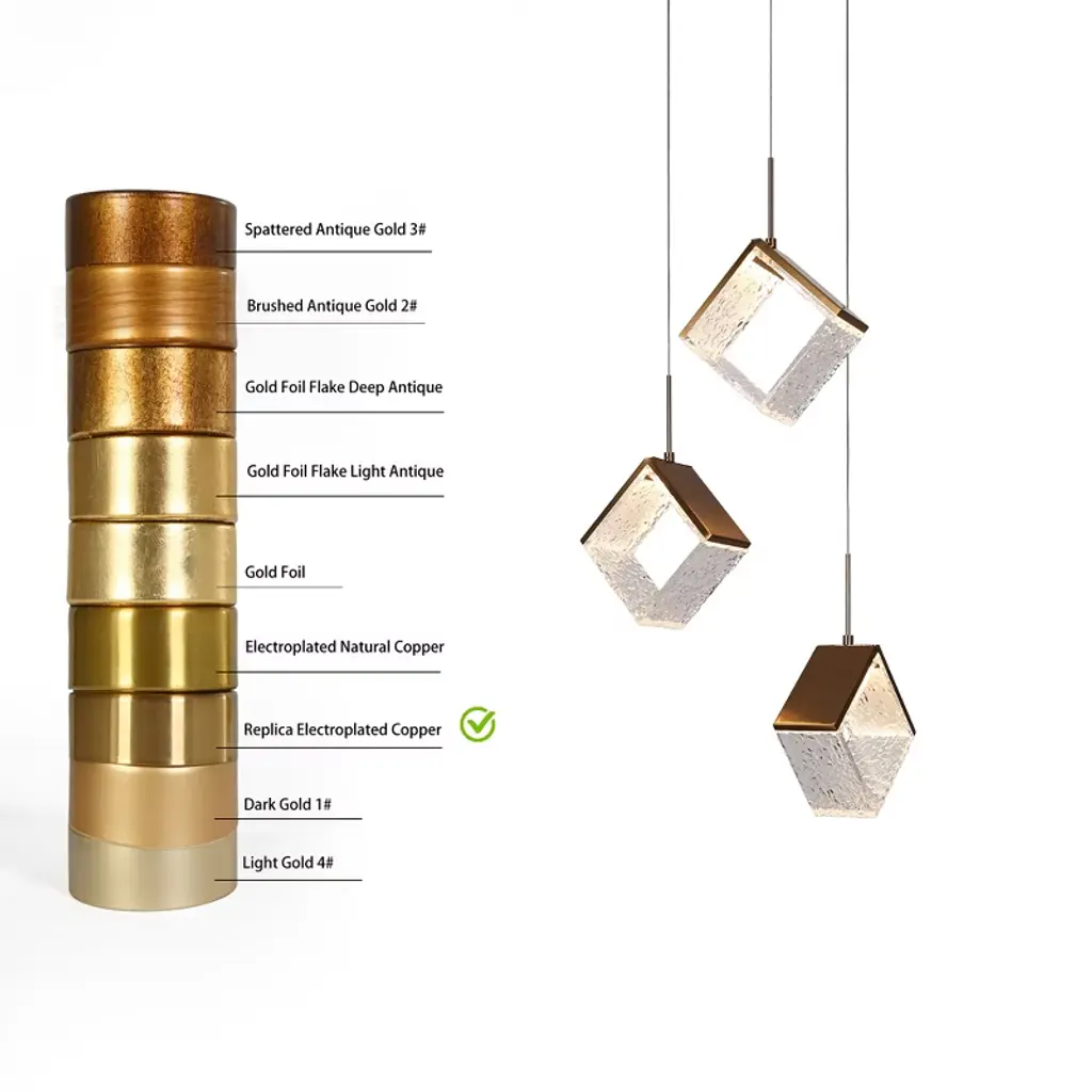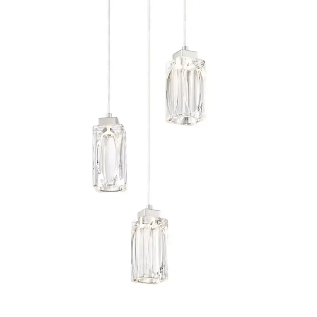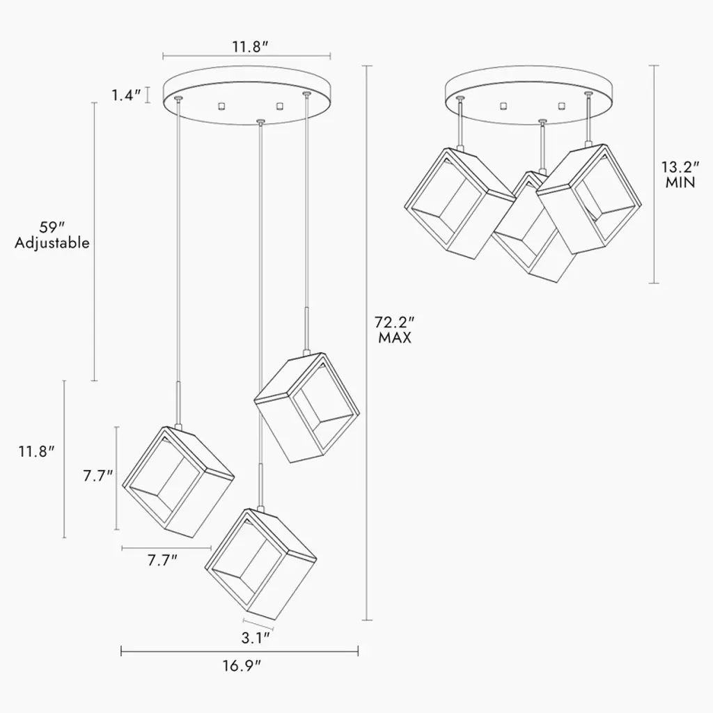 This 3-light pendant light presents a stunning visual display with its unique cluster shape, featuring three cubic acrylic lampshades that boast a textured surface reminiscent of cracked ice. The lampshades are designed to diffuse light softly, creating a warm and inviting atmosphere in any space they adorn. Each shade is suspended at varying lengths from a central canopy, lending a dynamic sense of movement and depth to the arrangement.