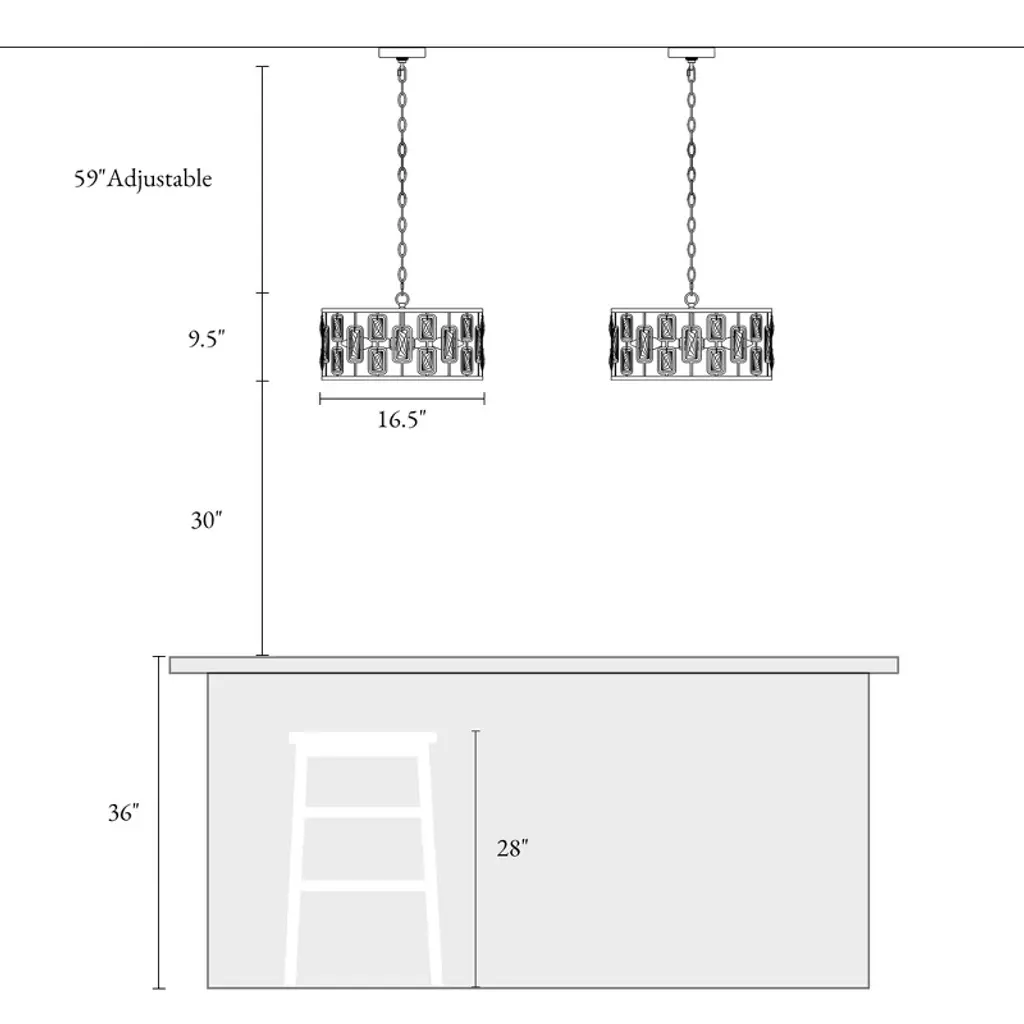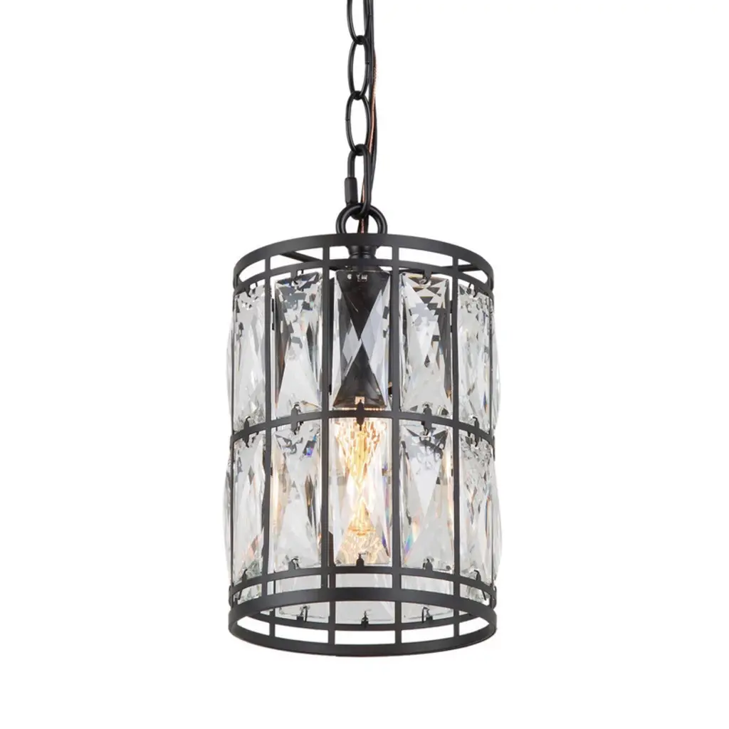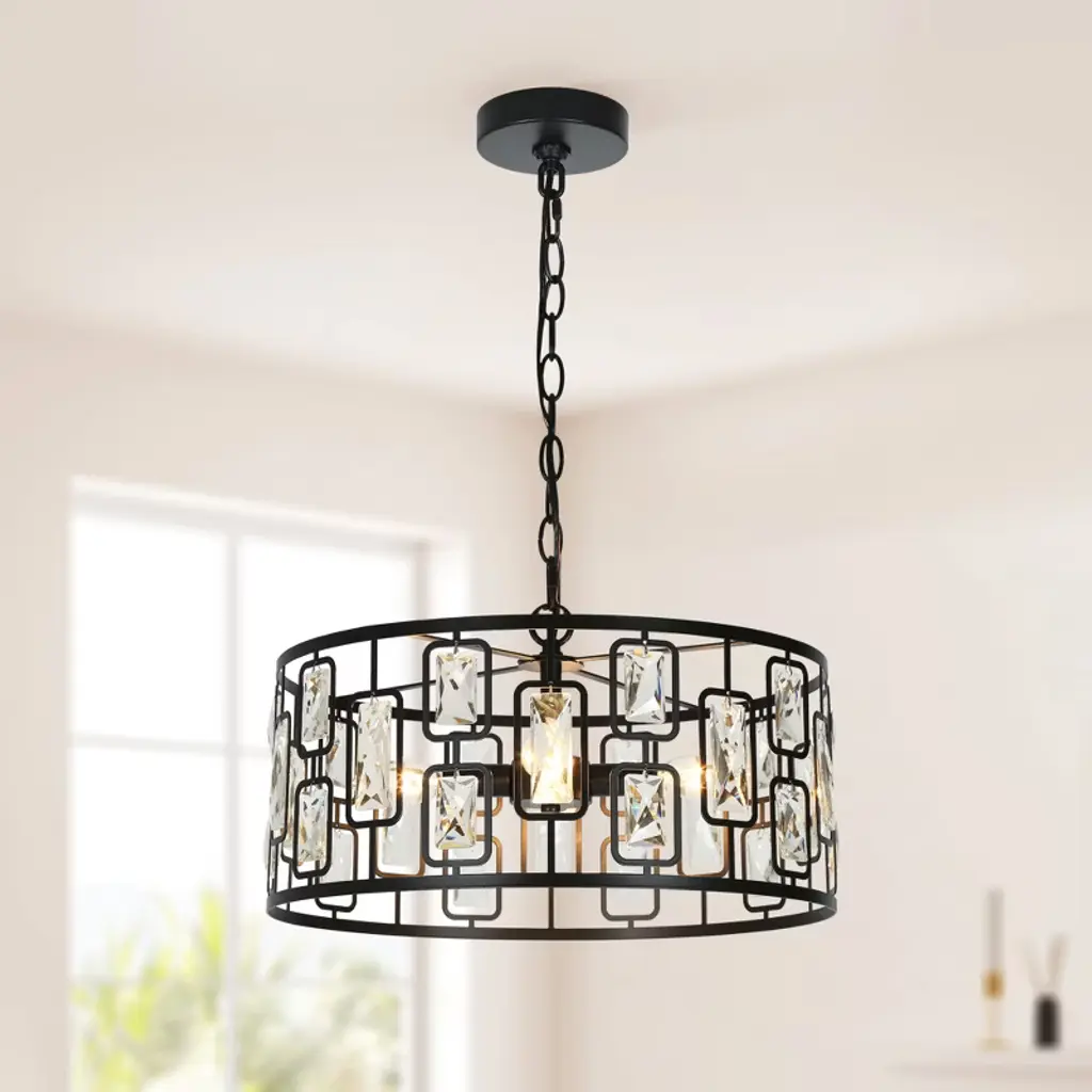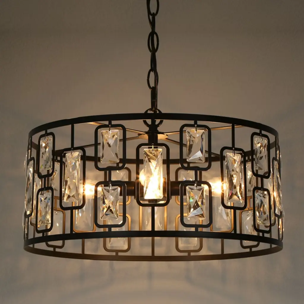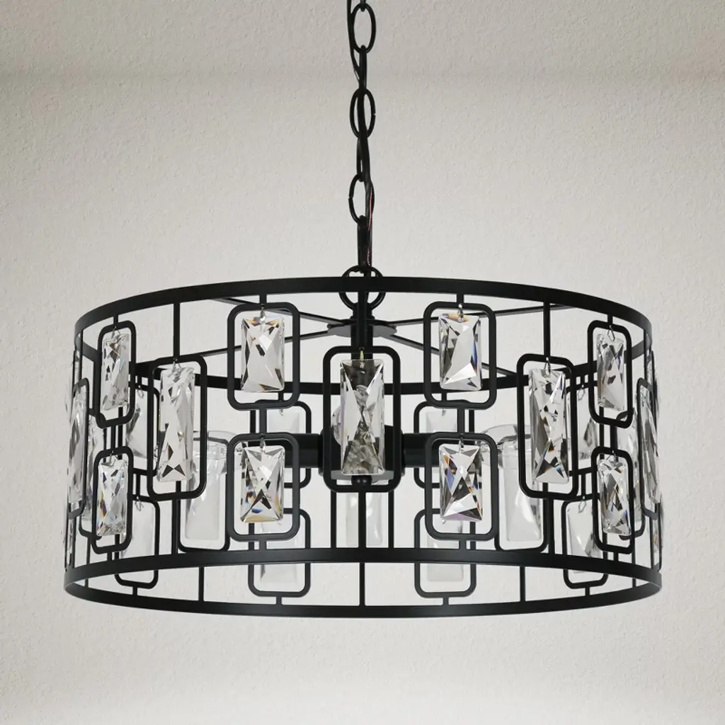 Create an unforgettable focal point in your kitchen or dining room with this drum shaped island chandelier, featuring a crystal shade that exudes elegance. This pendant of five lights features a black finish rectangular frame with rectangular cutouts on the sides for a geometric look. Each cutout interior is accented with a rectangular faceted crystal, creating a lovely sparkling effect when the chandelier is lit. 3 candelabra bulbs are positioned in the design for ample accent lighting. The crystal chandelier hangs from an adjustable chain, adding texture and dimension to any setting.