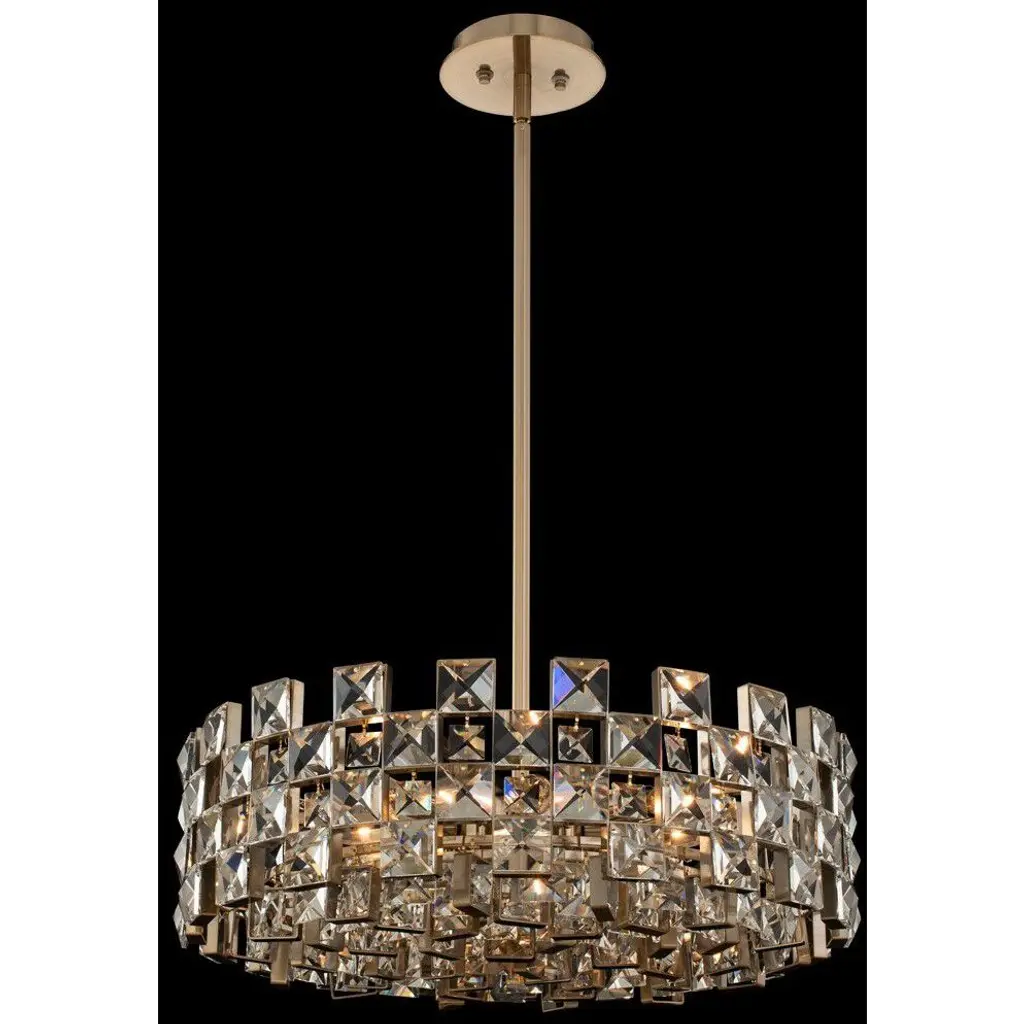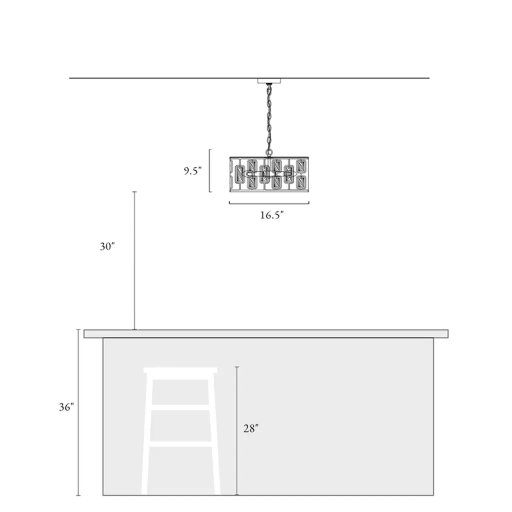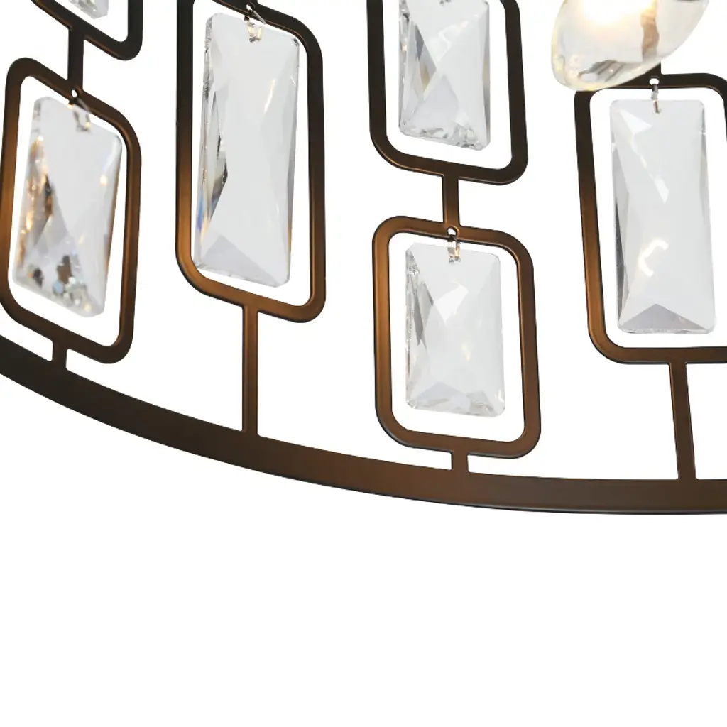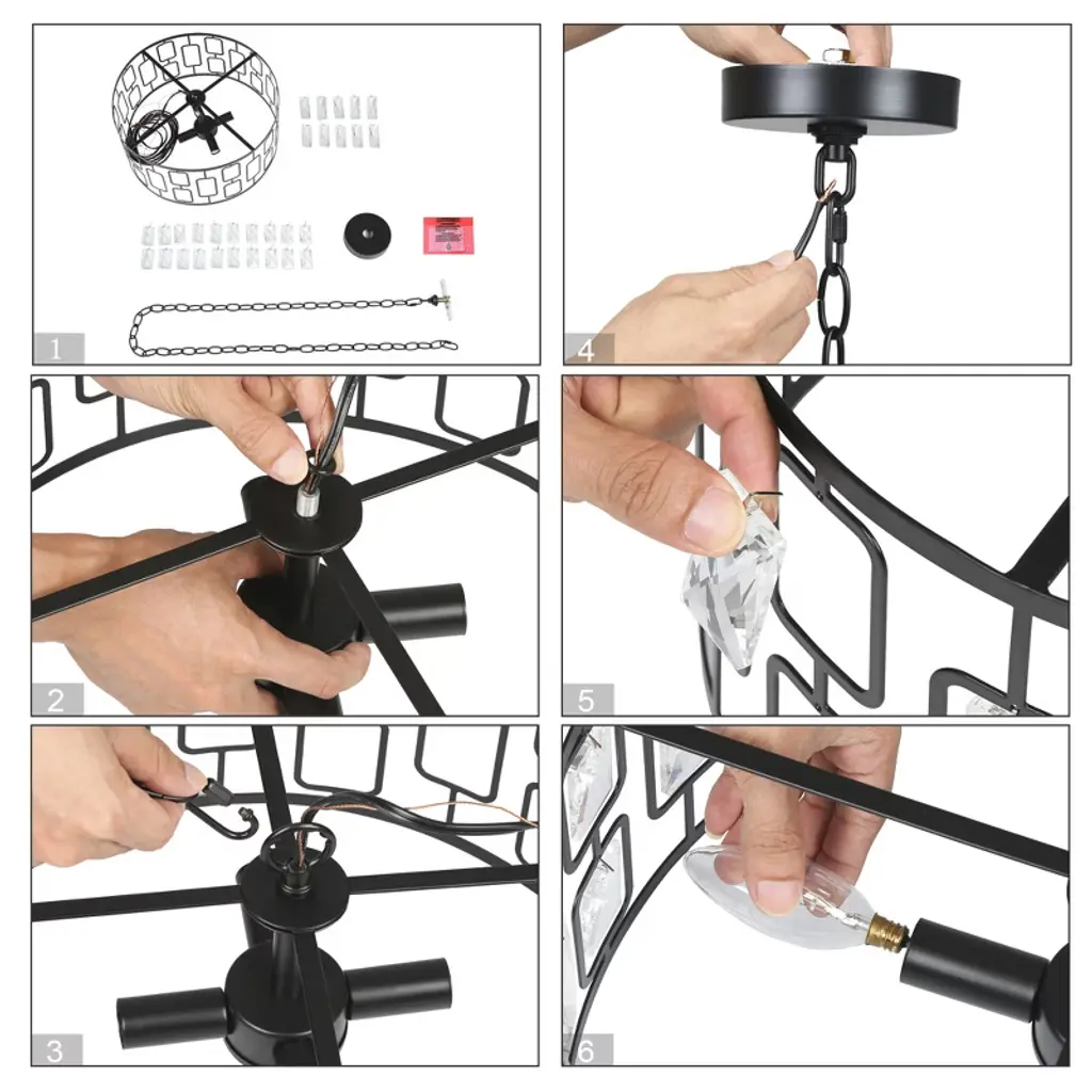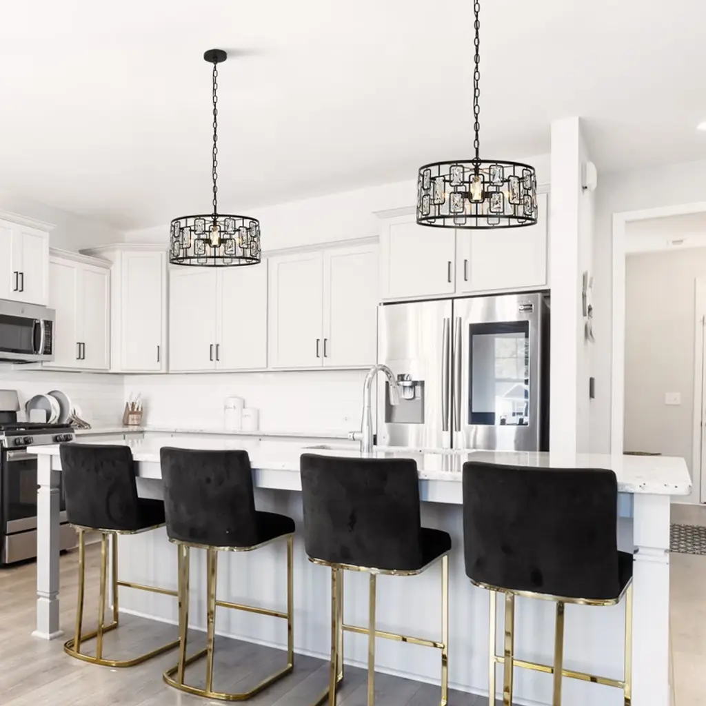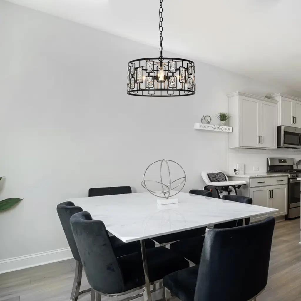 Create an unforgettable focal point in your kitchen or dining room with this drum shaped island chandelier, featuring a crystal shade that exudes elegance. This pendant of five lights features a black finish rectangular frame with rectangular cutouts on the sides for a geometric look. Each cutout interior is accented with a rectangular faceted crystal, creating a lovely sparkling effect when the chandelier is lit. 3 candelabra bulbs are positioned in the design for ample accent lighting. The crystal chandelier hangs from an adjustable chain, adding texture and dimension to any setting.