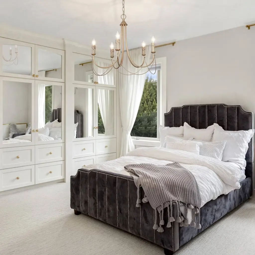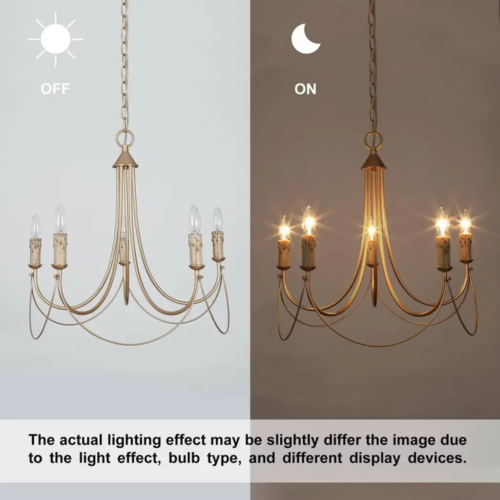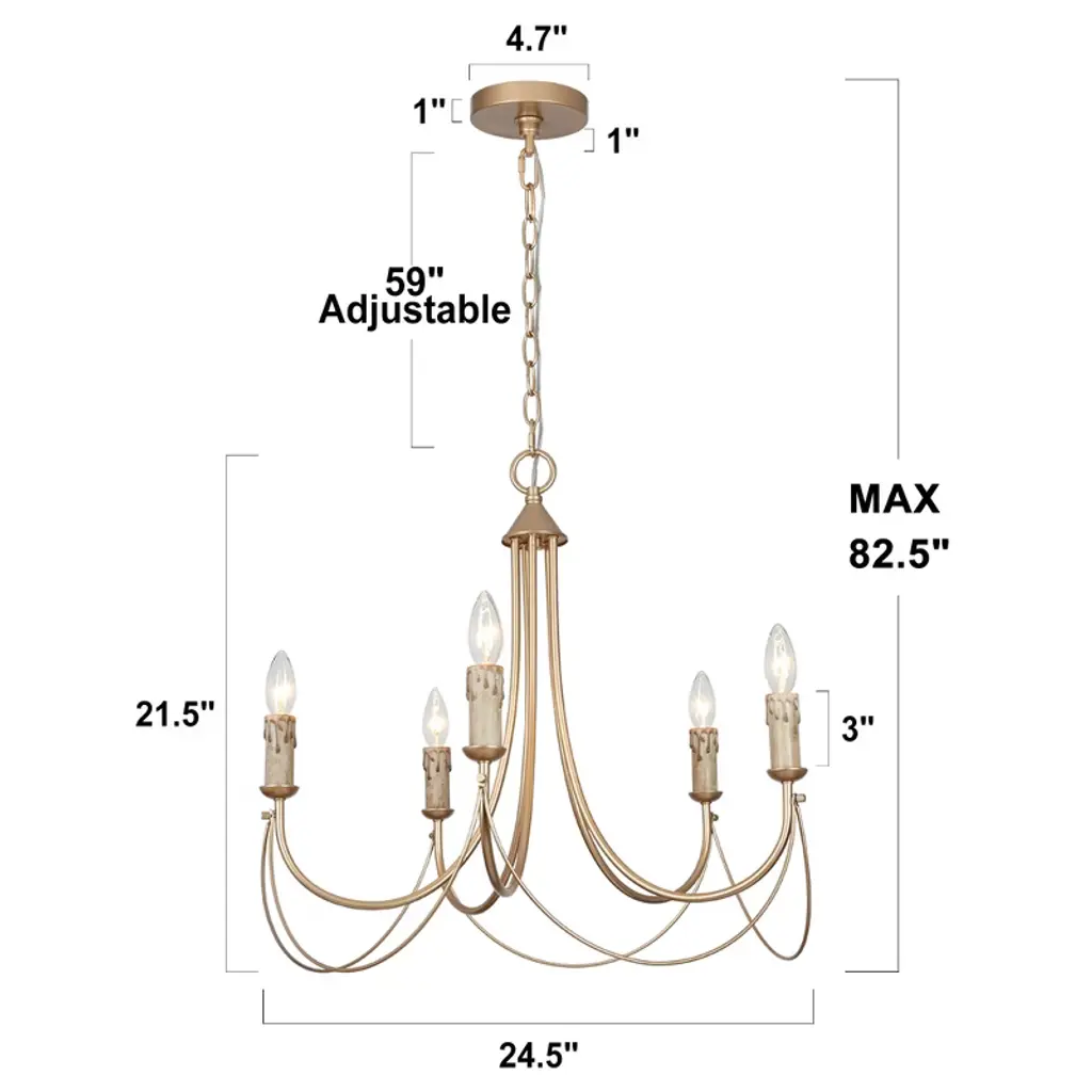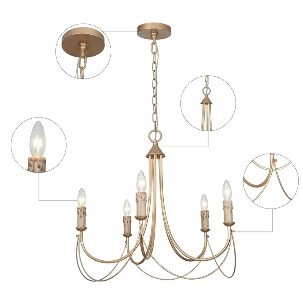 Add a touch of luxury to your home decor with this 5-light elegant and regal modern gold dining room chandelier. Perfect for gold chandelier for dining rooms, foyers, and kitchens, this chandelier features a stunning high-end metal gold finish that will complement any color scheme and can also be a chandelier for bedroom. Each candle extends upwards, casting a warm, flickering light that dances gracefully across the room. With its farmhouse-inspired look, this gold chandelier is sure to impress your guests and elevate your interior design. Invest in this modern farmhouse chandelier to achieve the perfect balance of form and function in your interior design!