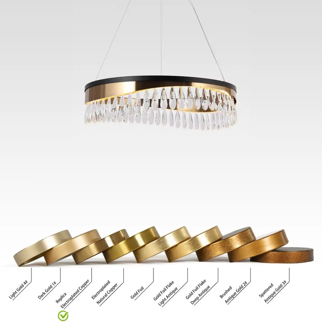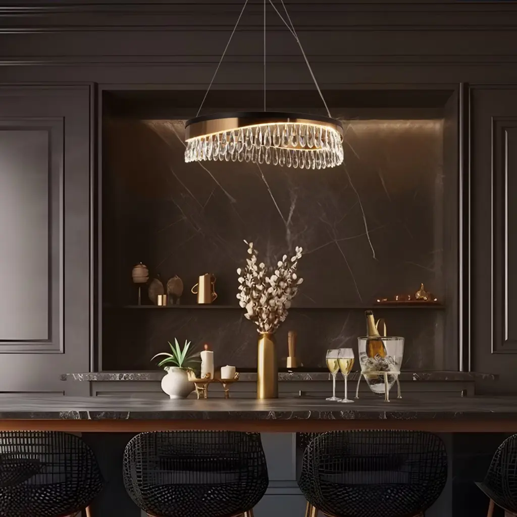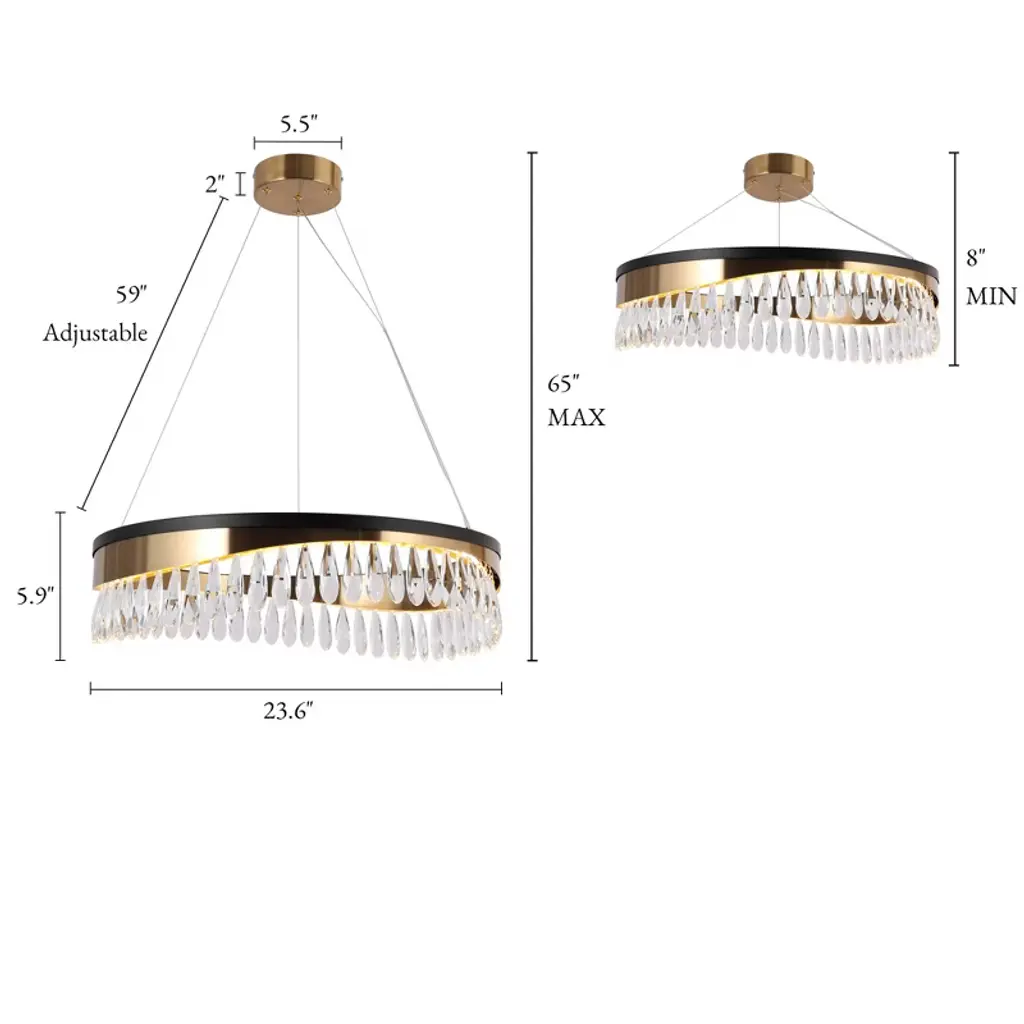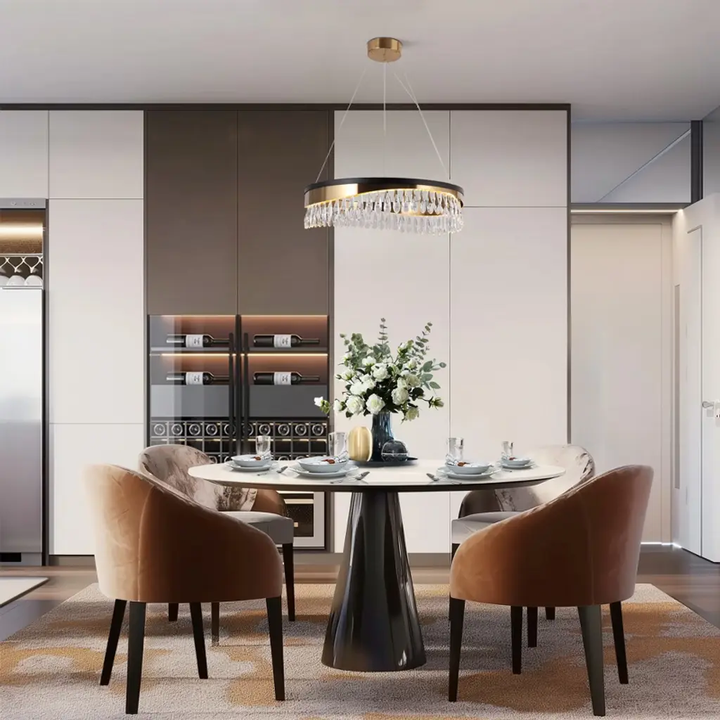 This light fixture is the epitome of bold luxury. Its embedded LED light strip not only provides brilliant illumination but also highlights its sophisticated design. The matte black finish paired with brass plating creates a striking contrast, while the crystal pendants add a touch of opulence. When switched on, it casts a romantic glow that gracefully transforms the space, much like a beautiful piano melody fills a grand concert hall. This light doesn’t just illuminate—it creates an atmosphere of elegance and serenity, offering a profound sense of freedom and relaxation.