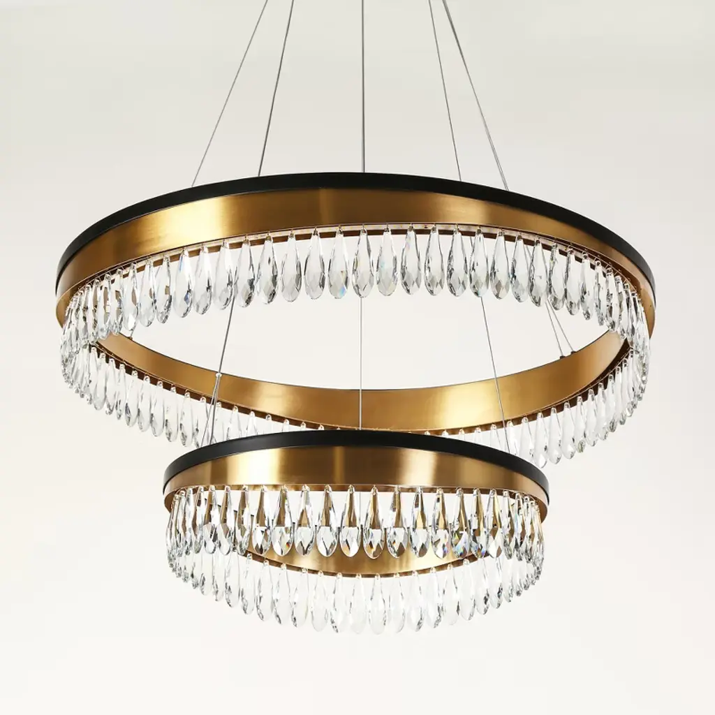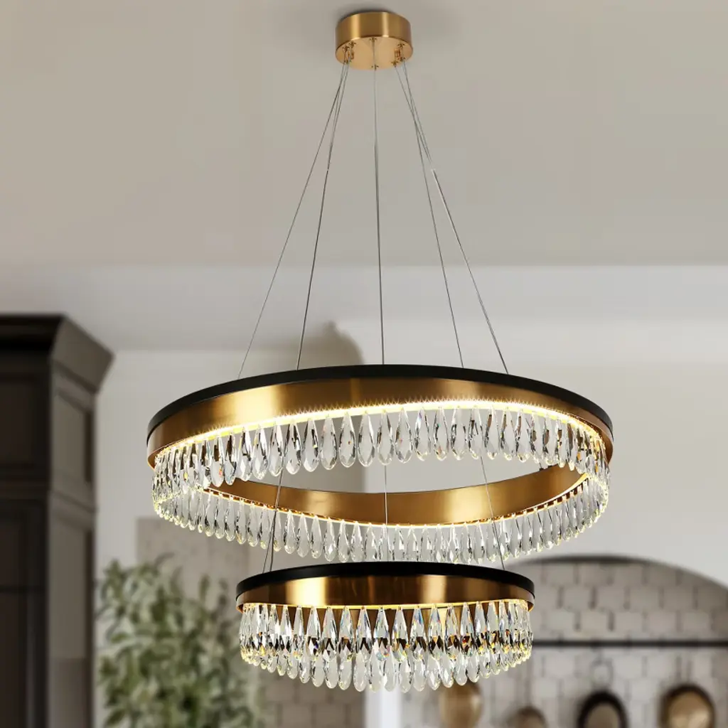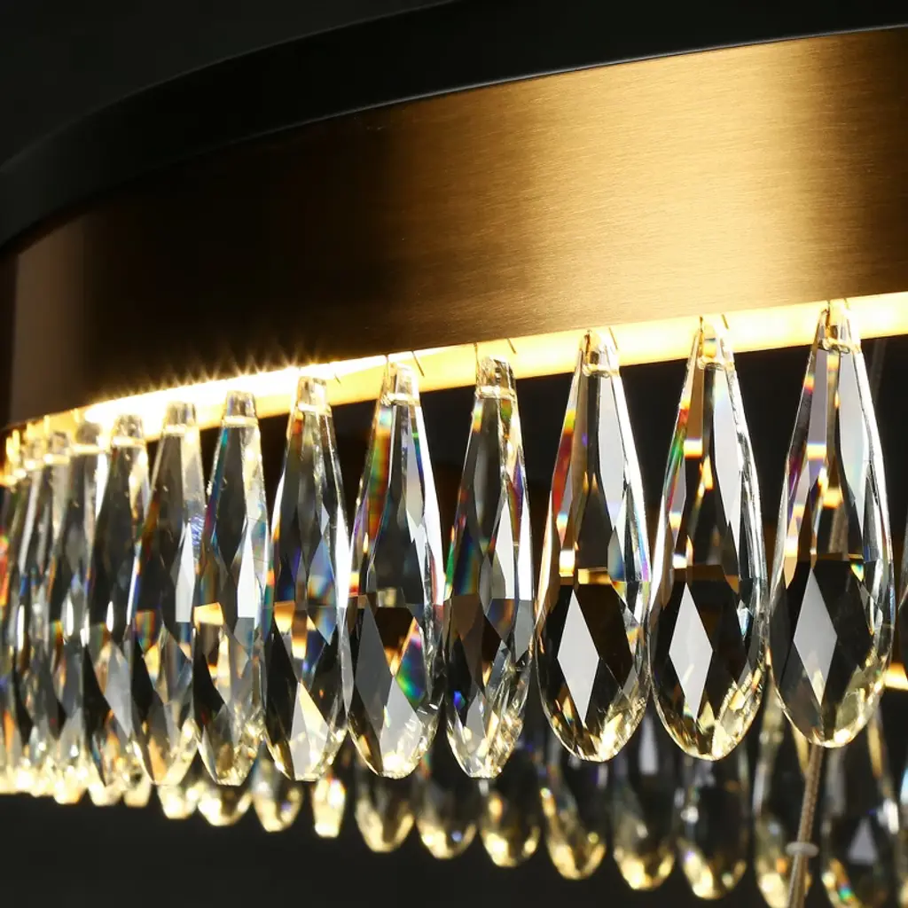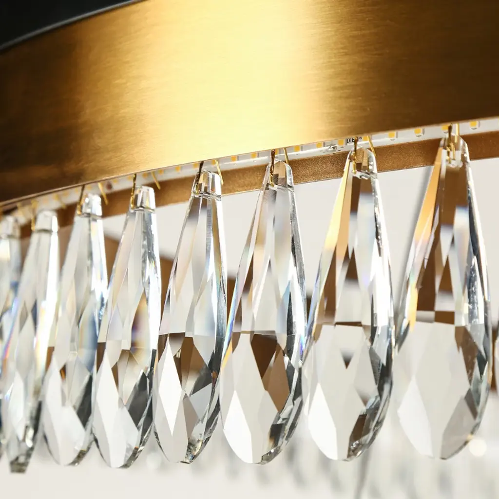 This light fixture captures the essence of bold luxury, seamlessly blending sophistication with elegance. The embedded LED light strip ensures brilliant and even illumination, while the matte black finish paired with brass plating creates a striking, modern contrast. Adorned with exquisite crystal pendants, it adds a layer of opulence, turning any space into a showcase of grandeur. When illuminated, it casts a romantic halo that transforms the room, reminiscent of a beautiful piano melody filling a grand concert hall. More than just a source of light, it fosters an atmosphere of refined serenity, offering a profound sense of freedom and relaxation.