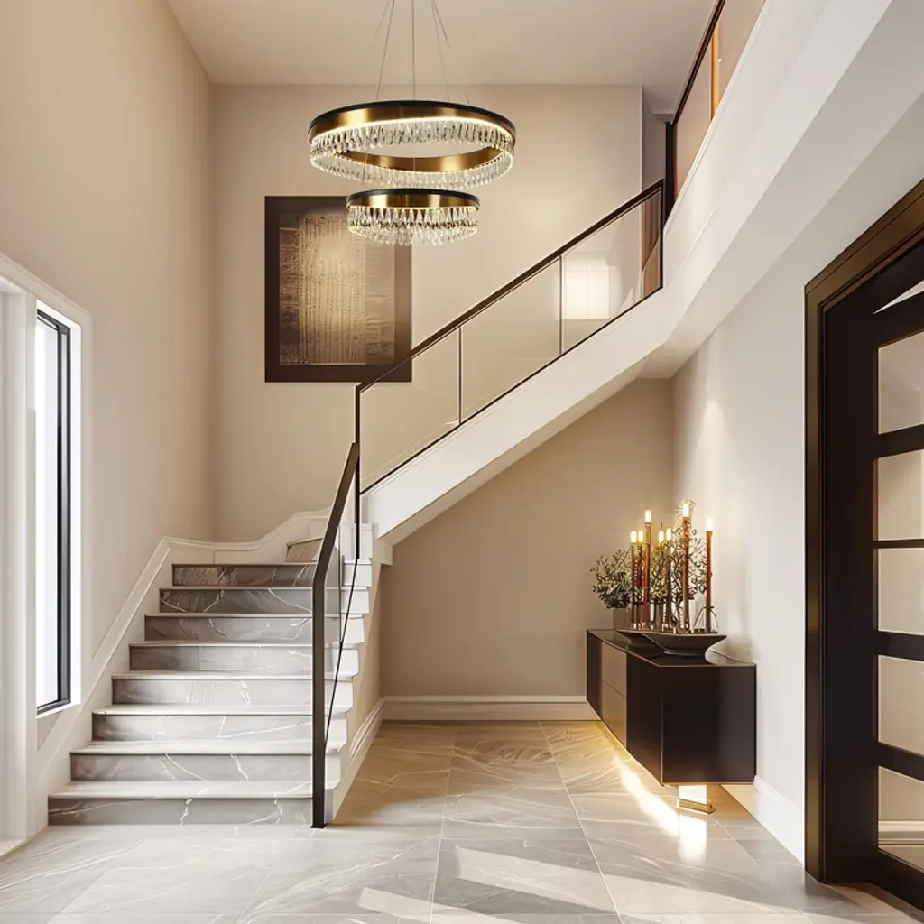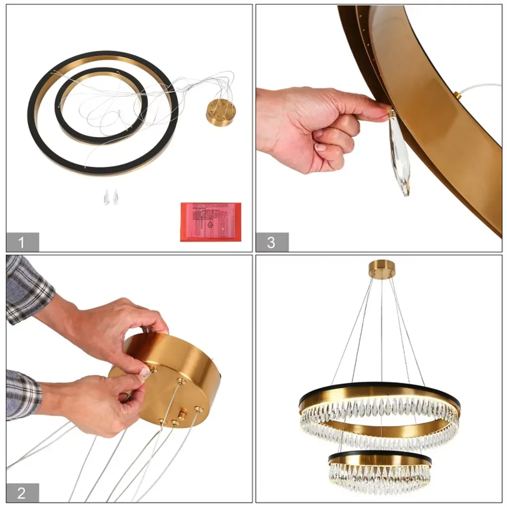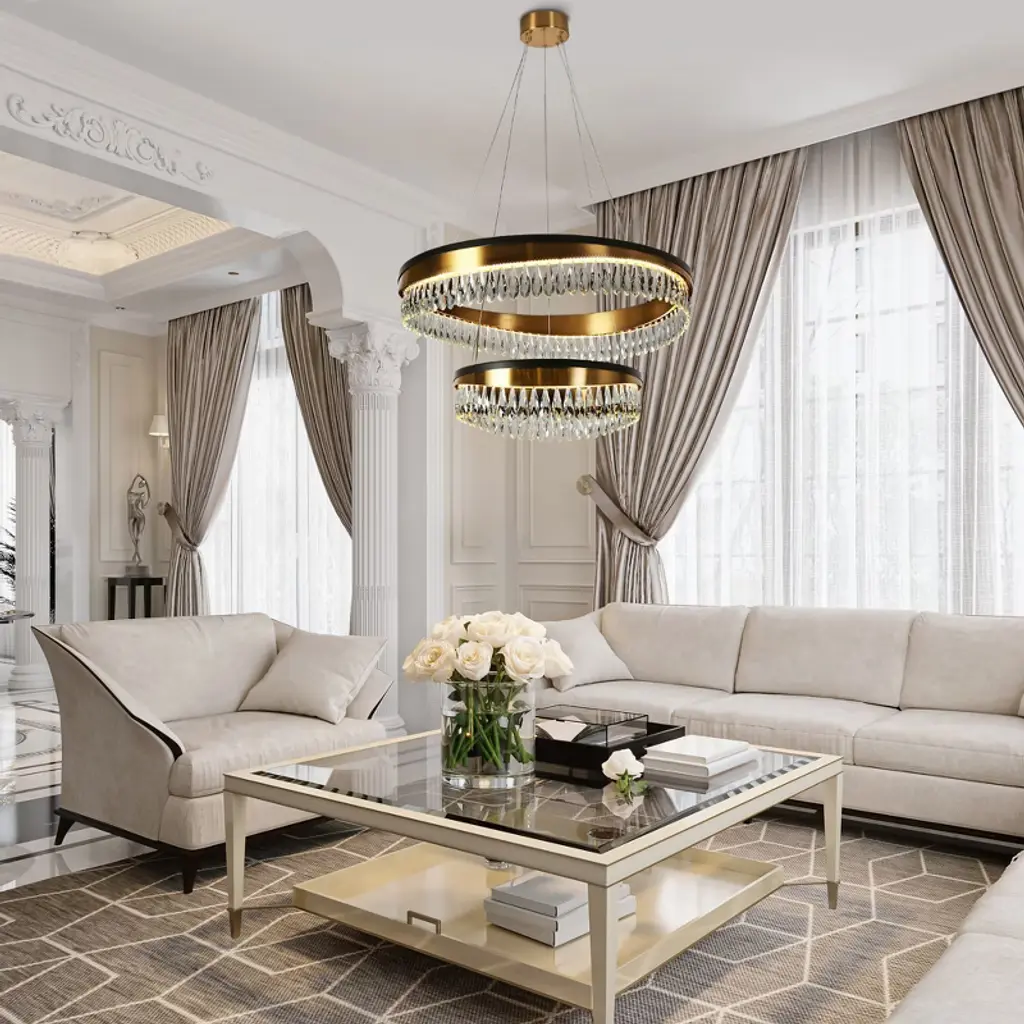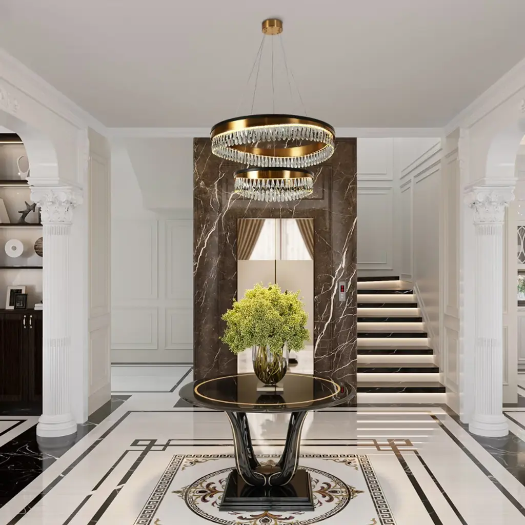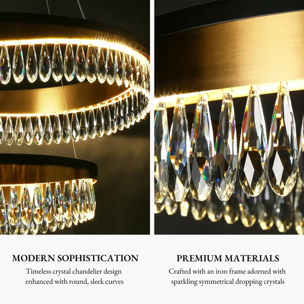 This light fixture captures the essence of bold luxury, seamlessly blending sophistication with elegance. The embedded LED light strip ensures brilliant and even illumination, while the matte black finish paired with brass plating creates a striking, modern contrast. Adorned with exquisite crystal pendants, it adds a layer of opulence, turning any space into a showcase of grandeur. When illuminated, it casts a romantic halo that transforms the room, reminiscent of a beautiful piano melody filling a grand concert hall. More than just a source of light, it fosters an atmosphere of refined serenity, offering a profound sense of freedom and relaxation.