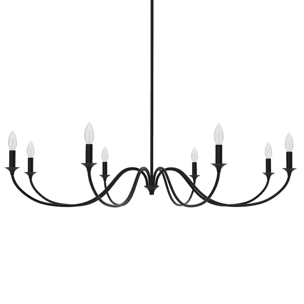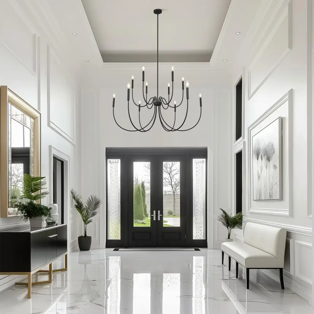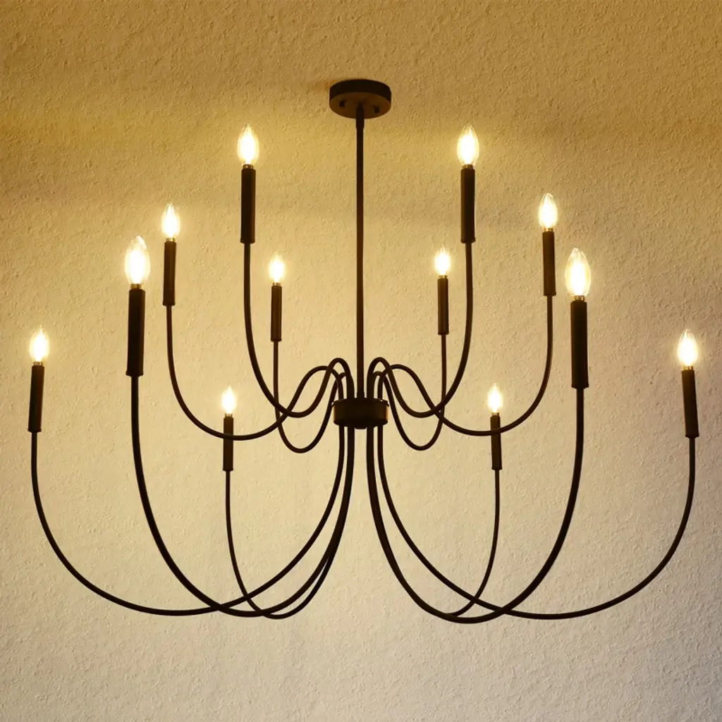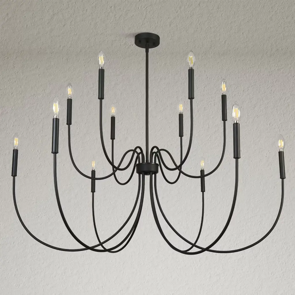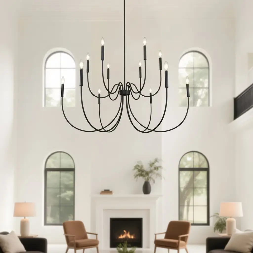 Bold yet effortlessly graceful, this oversized matte black chandelier reimagines the classic candle-style fixture with clean lines and flowing curves. Its sculptural silhouette makes a striking statement above dining tables, vaulted foyers, or living rooms with high ceilings. The crisp black finish and sturdy metal construction bring timeless sophistication, while its open frame lets light shine beautifully in all directions—perfect for creating a warm, inviting ambiance for gatherings, celebrations, and everyday moments alike.