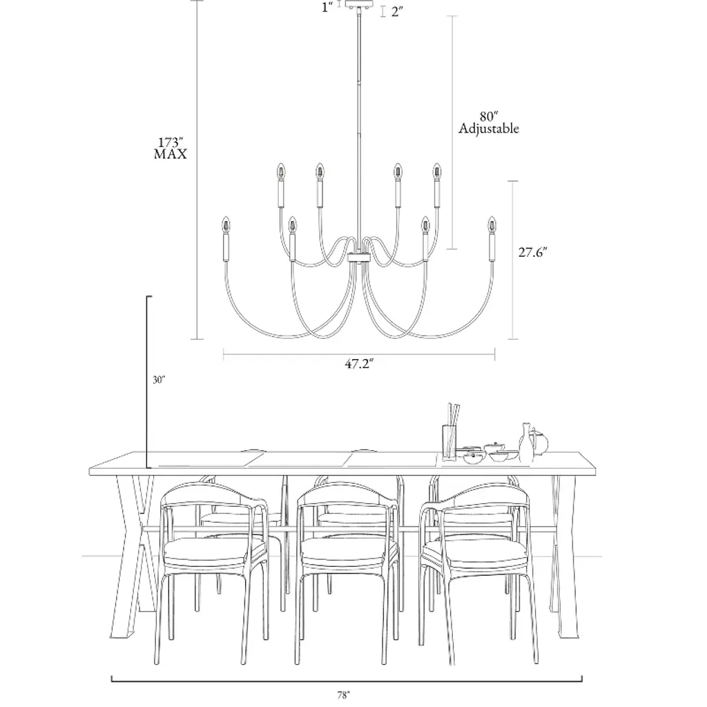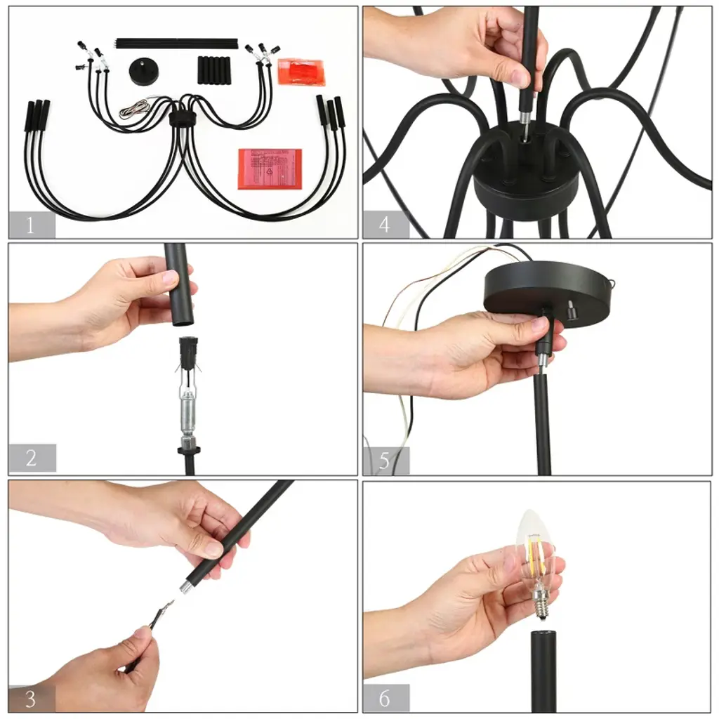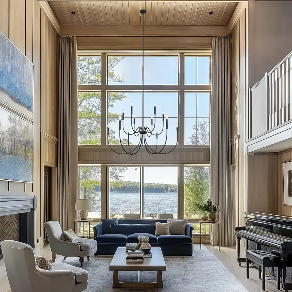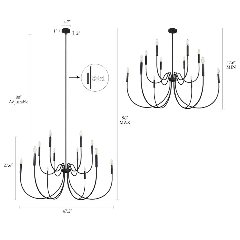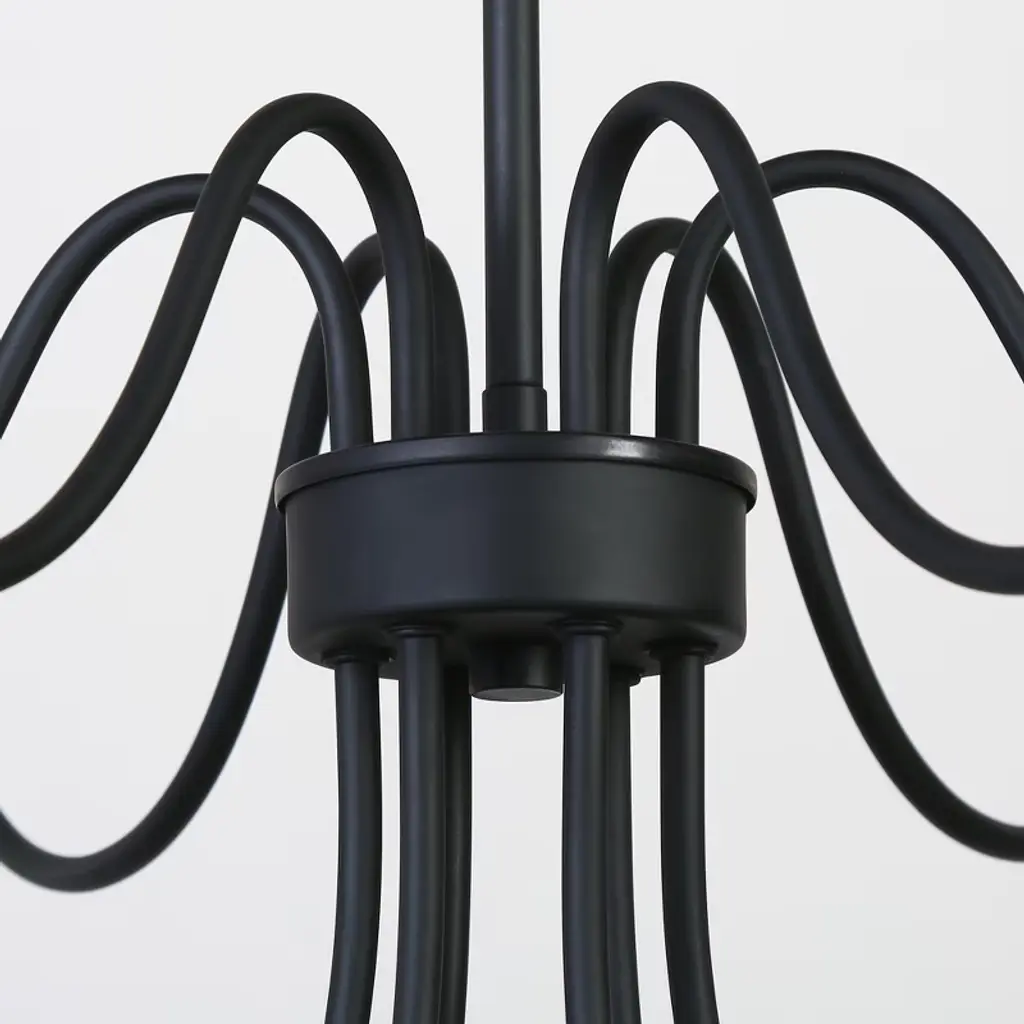 Bold yet effortlessly graceful, this oversized matte black chandelier reimagines the classic candle-style fixture with clean lines and flowing curves. Its sculptural silhouette makes a striking statement above dining tables, vaulted foyers, or living rooms with high ceilings. The crisp black finish and sturdy metal construction bring timeless sophistication, while its open frame lets light shine beautifully in all directions—perfect for creating a warm, inviting ambiance for gatherings, celebrations, and everyday moments alike.