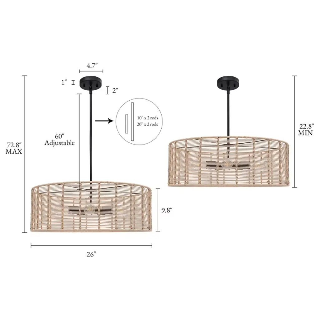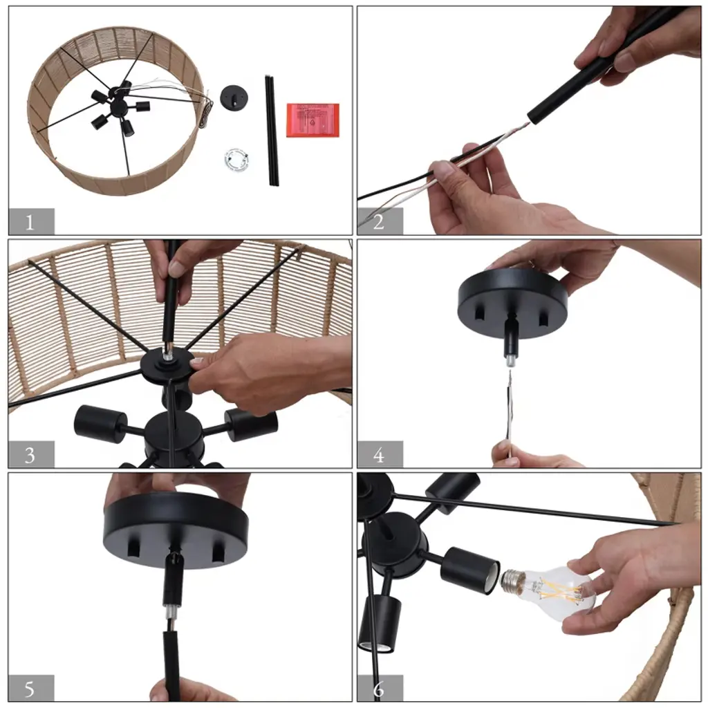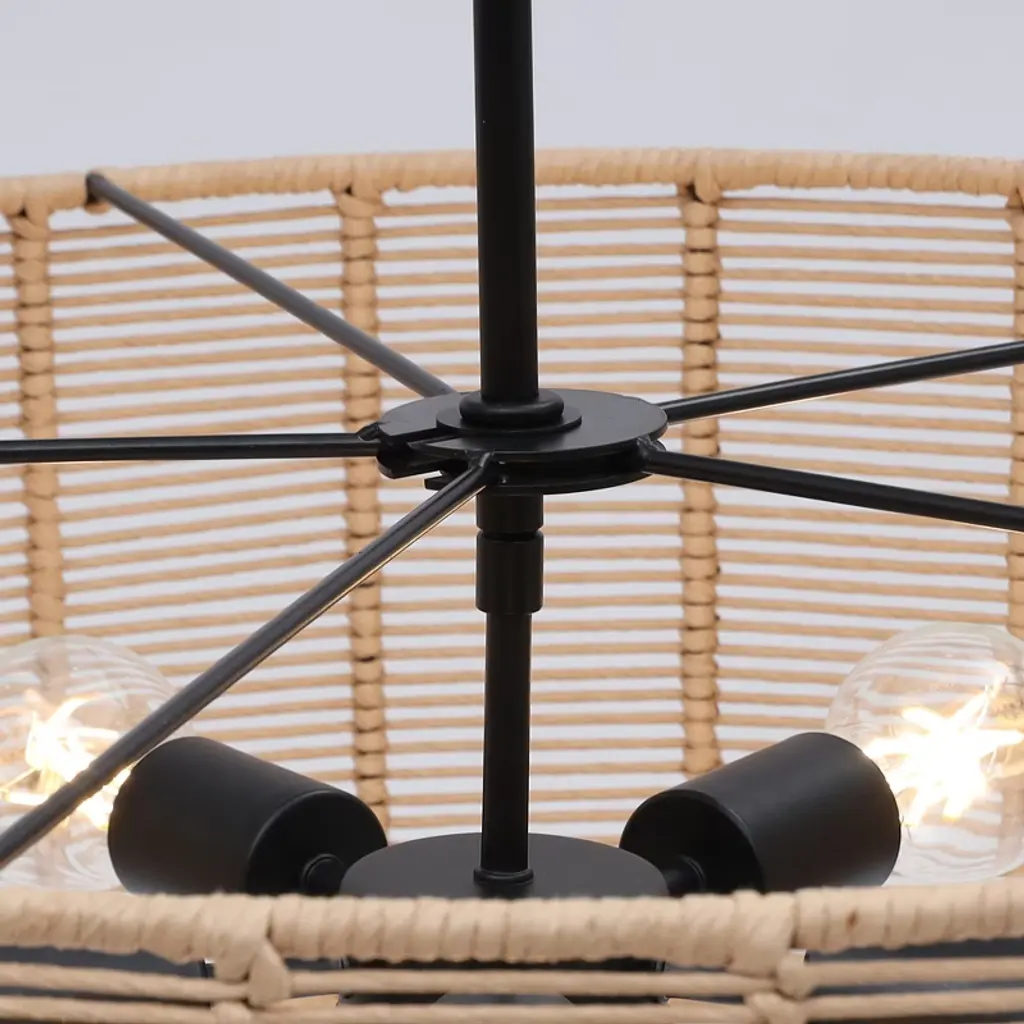 The LNC Eranthosys 5-light matte black traditional cage chandelier showcases a sophisticated blend of traditional, bohemian, coastal, and industrial design elements. This rattan chandelier features a sleek drum structure with natural rattan brown accents and a matte black chain and canopy, creating a harmonious balance between modernity and tradition. This versatile piece is well-suited for various settings including dining rooms, living rooms, entryways, and kitchens. It not only enhances the elegance of these spaces but also provides ample illumination for areas with high ceilings.