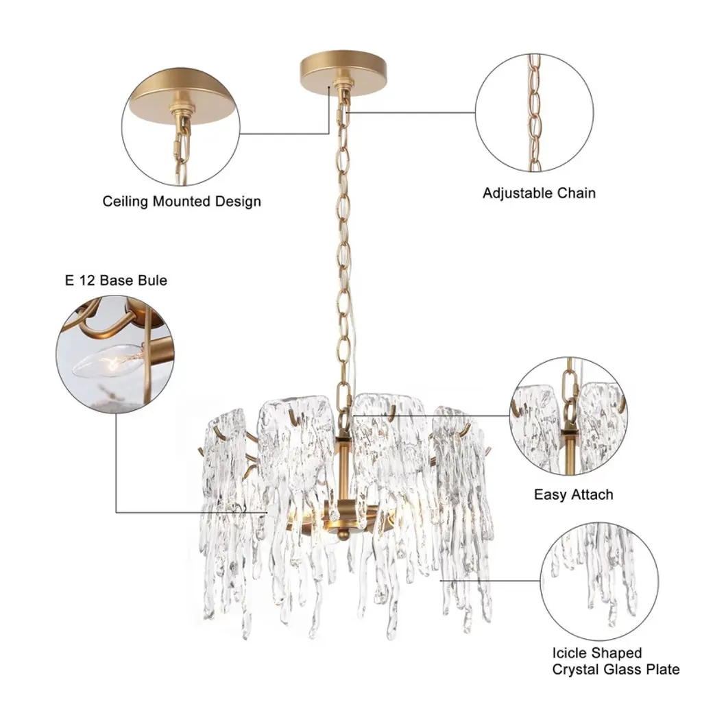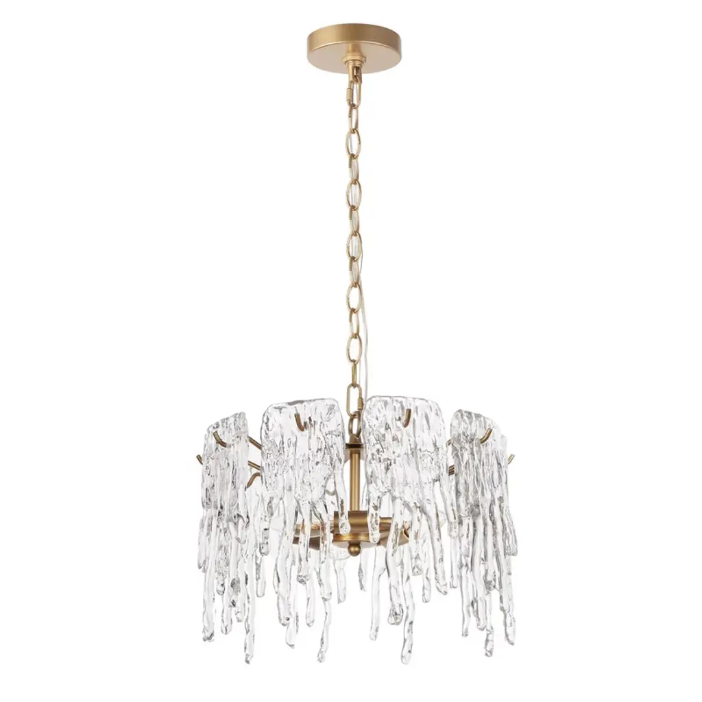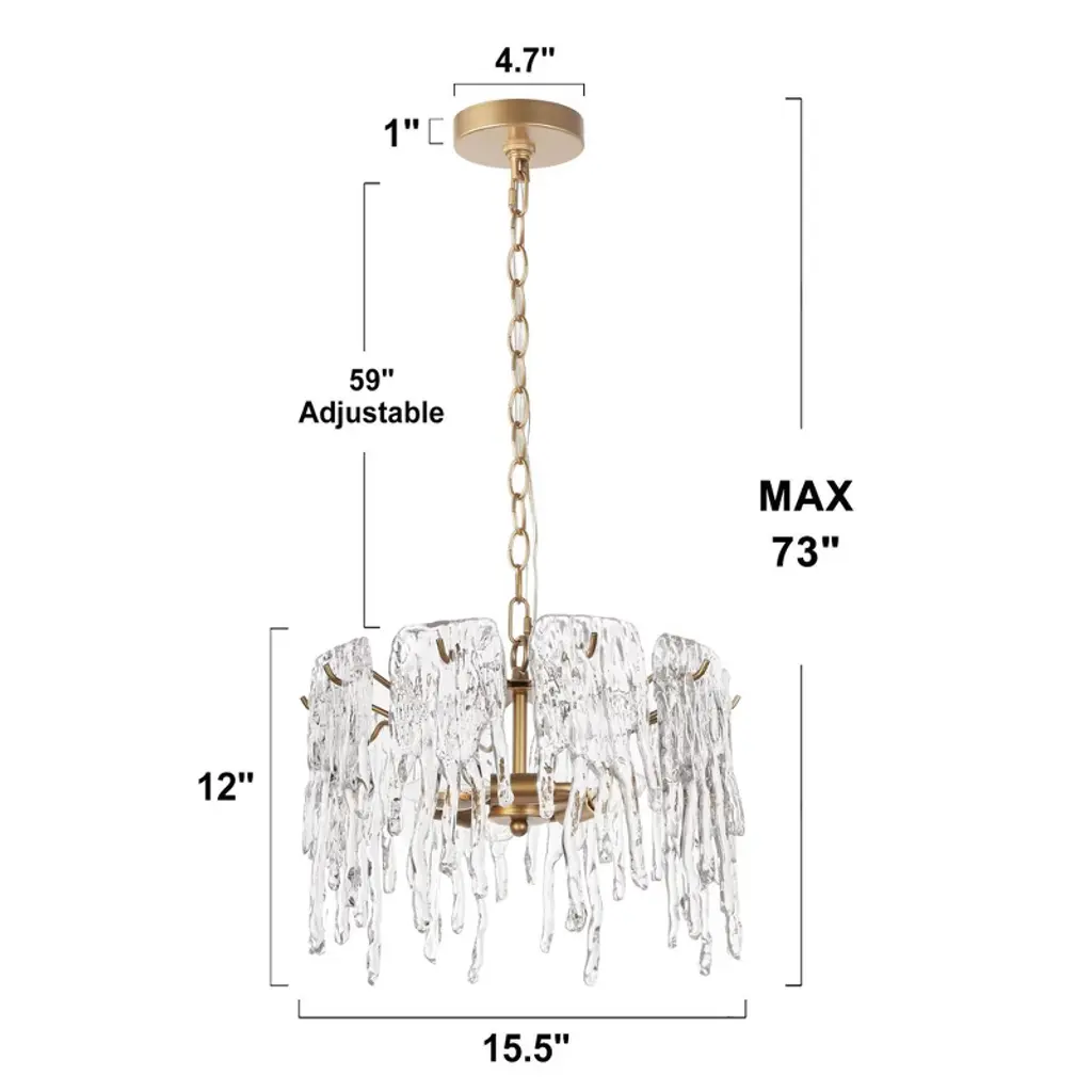 The LNC Eternal 15.5-in 3-Light Gold and Clear Glass Drum Modern Crystal Chandelier captures the fluid beauty of melting ice, creating a striking visual effect that blends modern sophistication with artistic charm. Featuring a luxurious gold finish and dazzling crystal drops, this chandelier captures the essence of fall with its radiant, golden glow, reminiscent of sunlight filtering through autumn leaves. The drum design adds a contemporary touch while the cascading crystals evoke the shimmer of morning frost. Ideal for dining rooms or entryways, this chandelier will transform your space into a cozy, yet sophisticated retreat for autumn gatherings and beyond.
