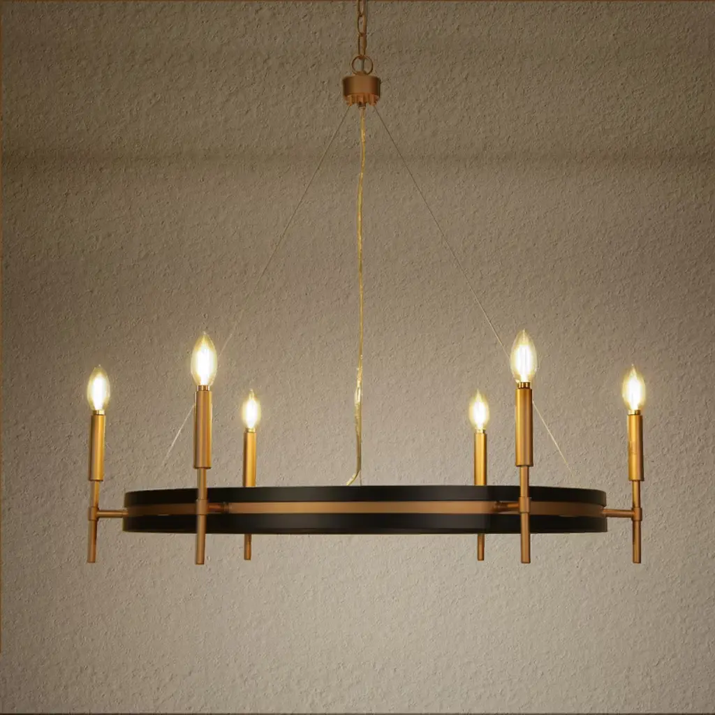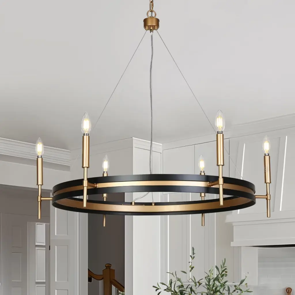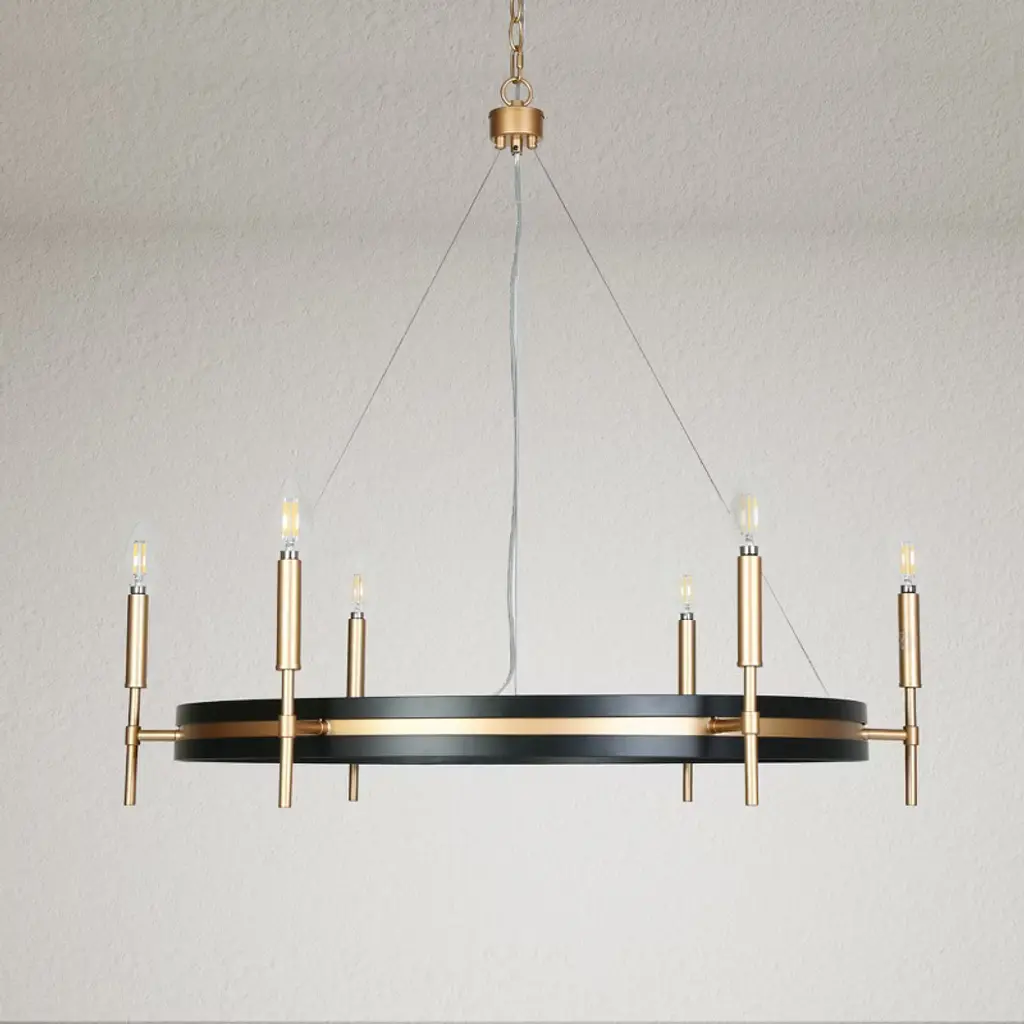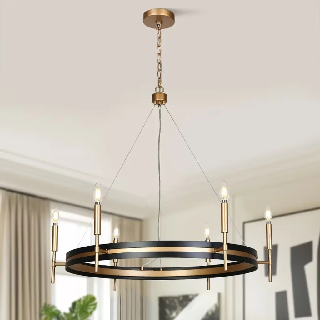 Inspired by minimalist modernism and industrial aesthetics, this black and gold wagon wheel chandelier adds contemporary elegance to your space. This black round chandelier is crafted from premium metal in matte black and dark gold finish, showcasing modern industrial style and mid-century modern elegance. Clean shapes complemented by exposed candelabra lamps make it a dramatic focal point of the space. It can be used in a wide variety of spaces, including but certainly not limited to dining rooms, living rooms, great rooms, bedrooms kitchens, offices, closets and entries. With six exposed lights, the chandelier offers ample illumination while maintaining a sleek, open design that enhances any space with its stylish presence and practical lighting function. This candle-style chandelier is chain-hung. You can adjust its height up to 59-in to fit your specific hanging needs.