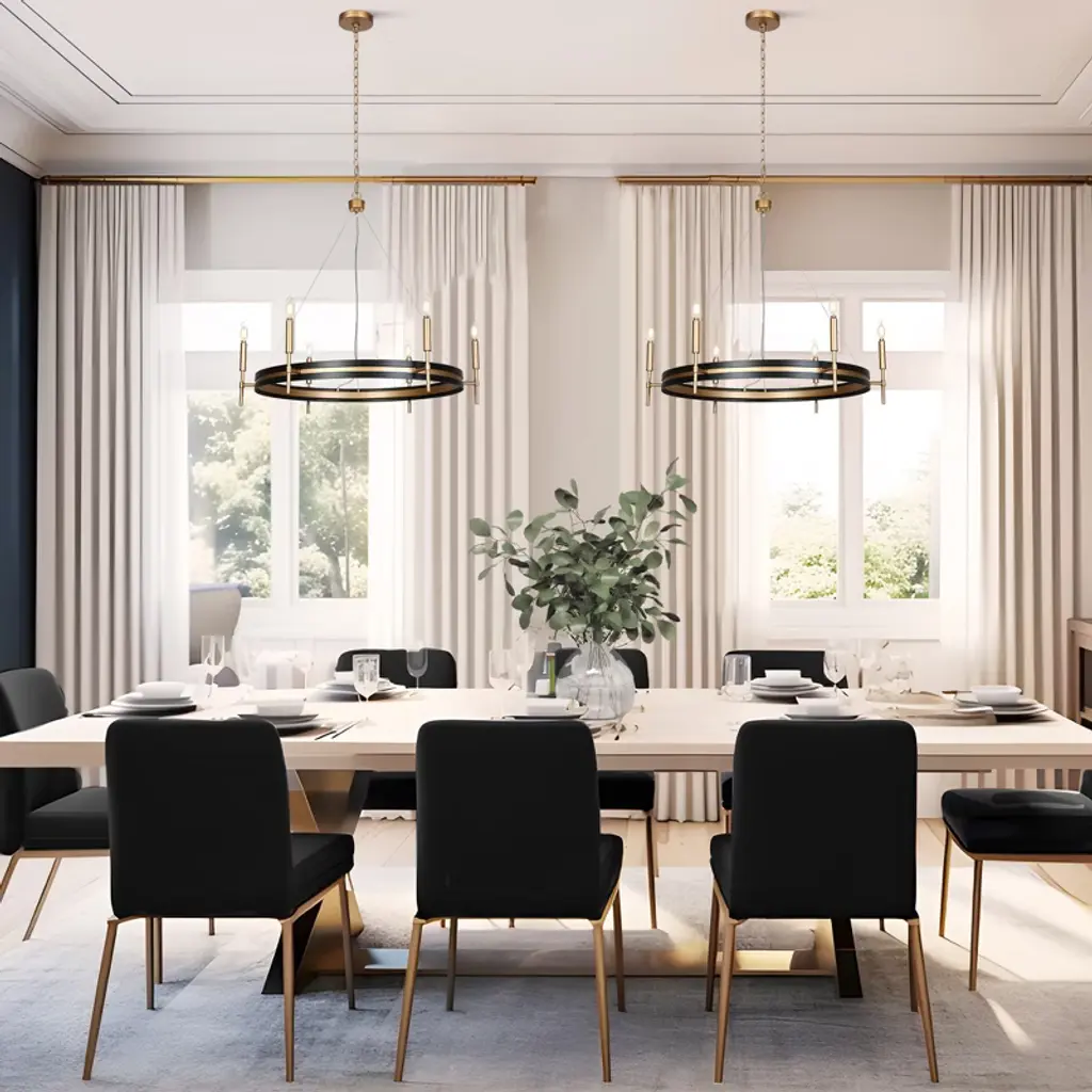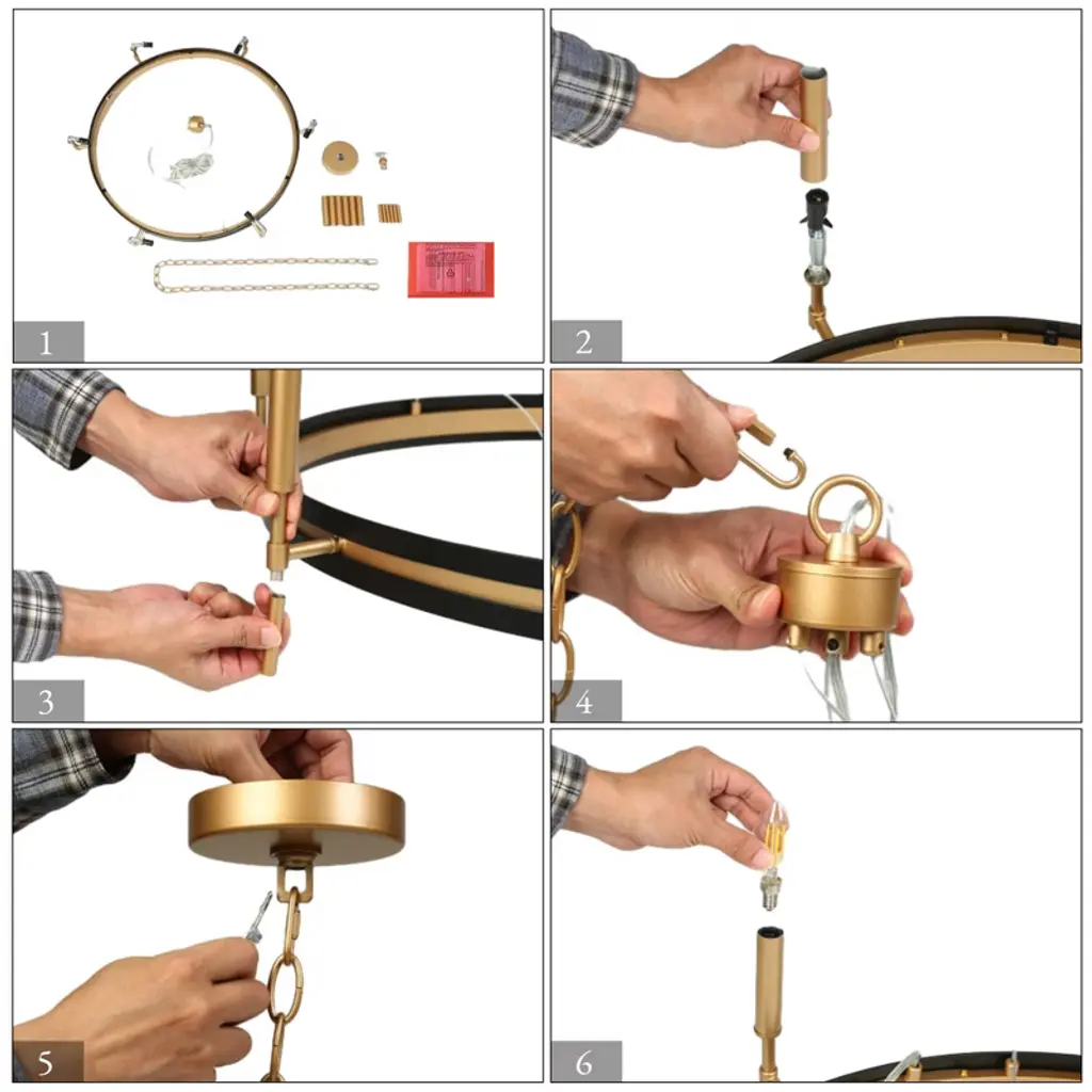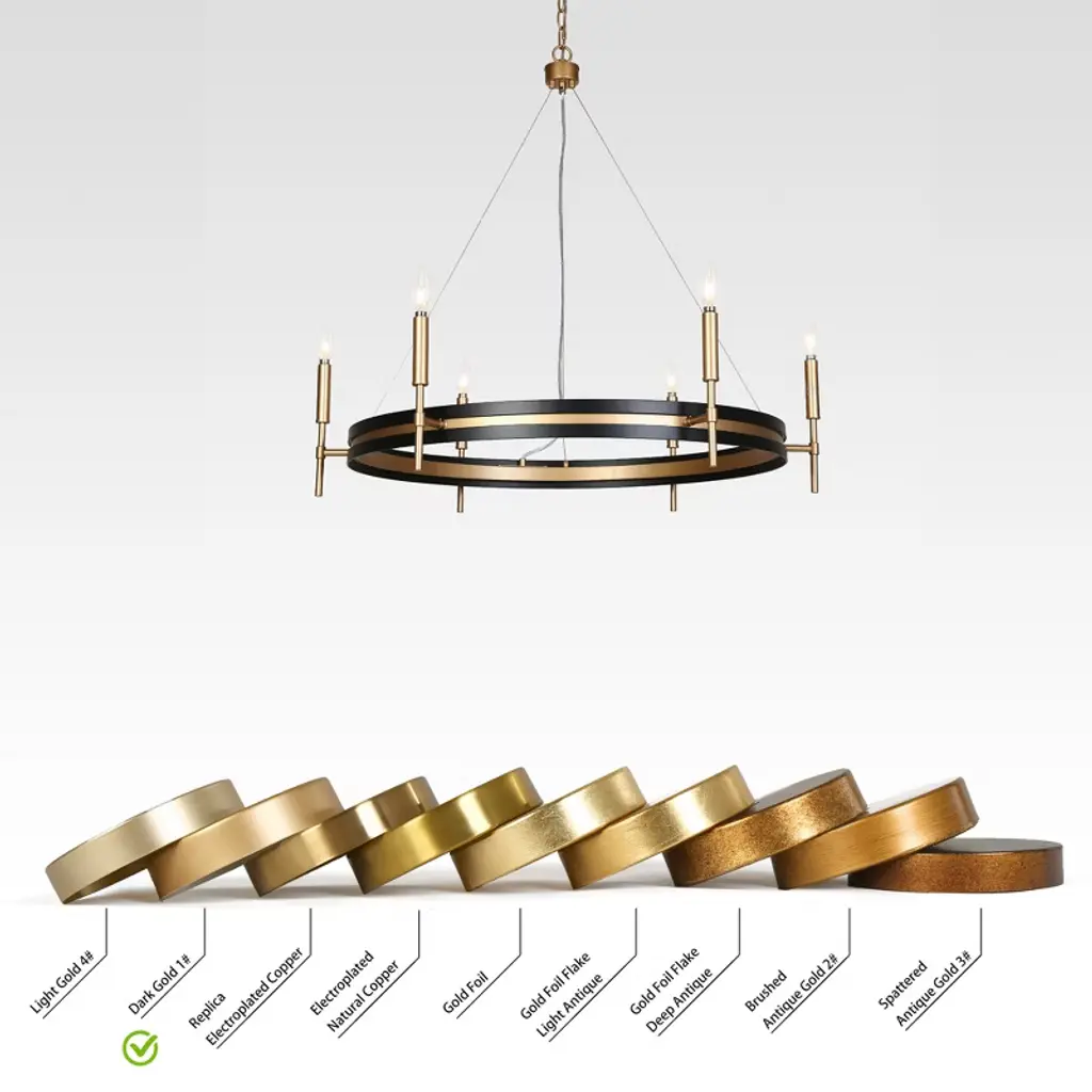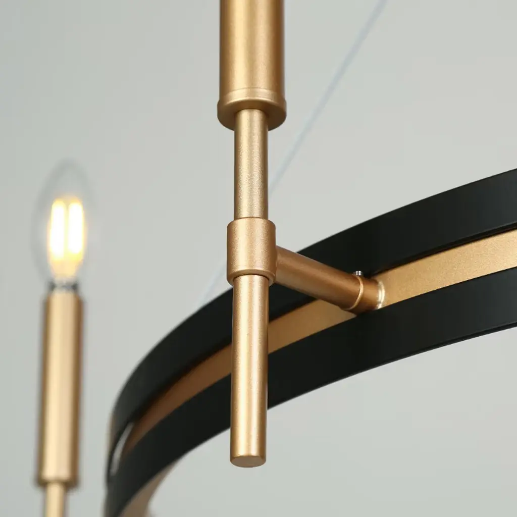 Inspired by minimalist modernism and industrial aesthetics, this black and gold wagon wheel chandelier adds contemporary elegance to your space. This black round chandelier is crafted from premium metal in matte black and dark gold finish, showcasing modern industrial style and mid-century modern elegance. Clean shapes complemented by exposed candelabra lamps make it a dramatic focal point of the space. It can be used in a wide variety of spaces, including but certainly not limited to dining rooms, living rooms, great rooms, bedrooms kitchens, offices, closets and entries. With six exposed lights, the chandelier offers ample illumination while maintaining a sleek, open design that enhances any space with its stylish presence and practical lighting function. This candle-style chandelier is chain-hung. You can adjust its height up to 59-in to fit your specific hanging needs.
