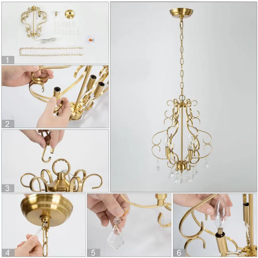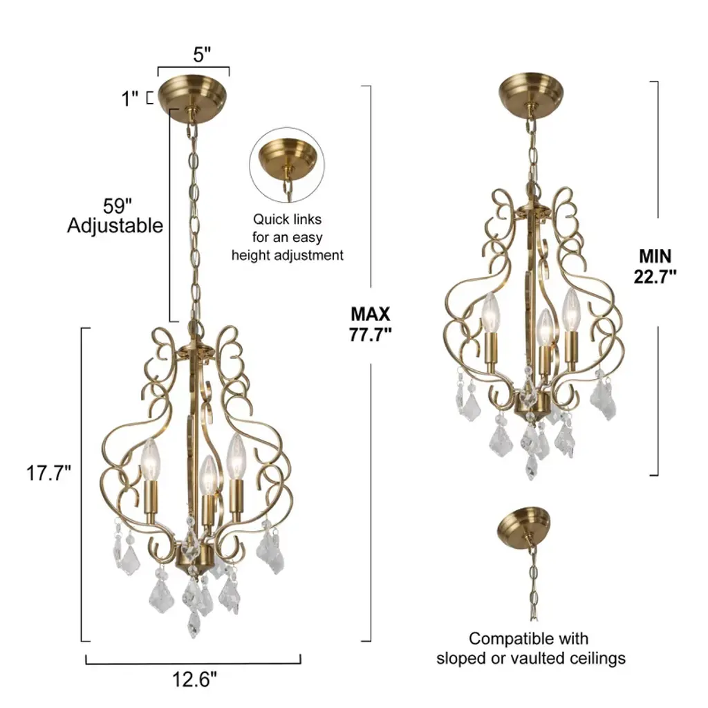 This 3-light classical traditional electroplating shiny gold candle chandelier with crystal drops and combines curved lines with sparkle. It is finished in a very charming high-end shiny gold metallic finish, creating warm light that will dazzle your eyes. Very exquisite gold chandelier, very suitable for luxurious decoration, creating a magnificent effect, whether it is installed in the dining room, kitchen island, living room, bedroom or the entrance hall, it is an eye-catching existence, and it will bring you many compliments.