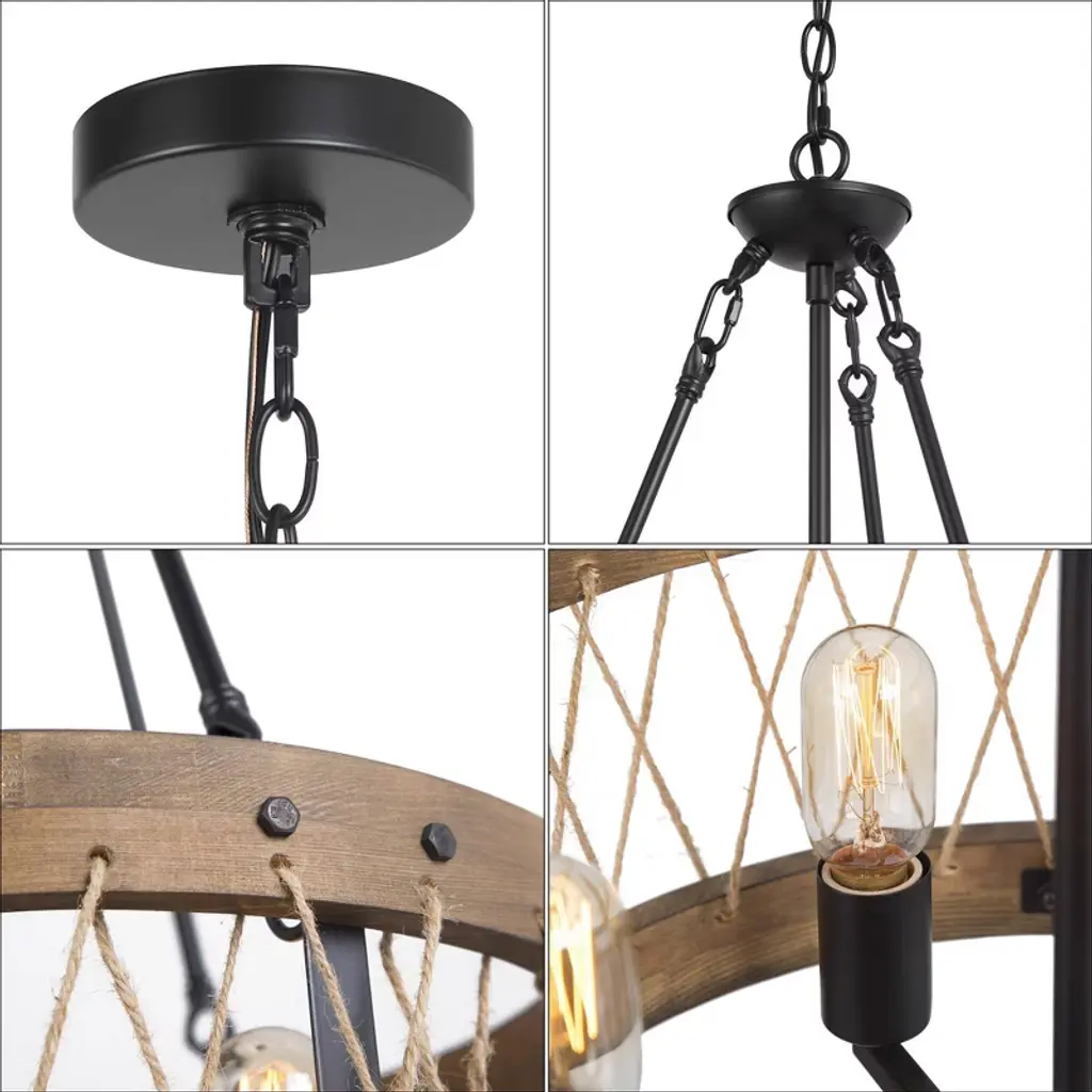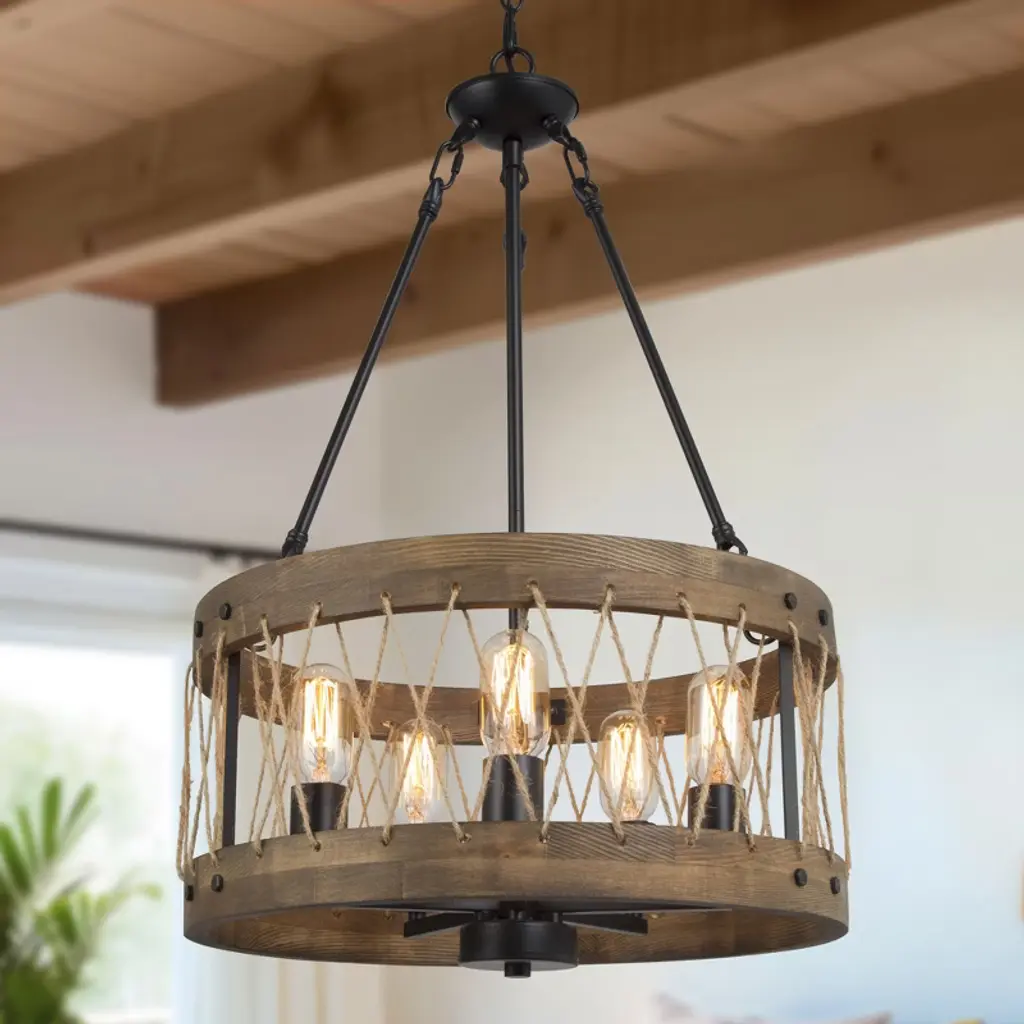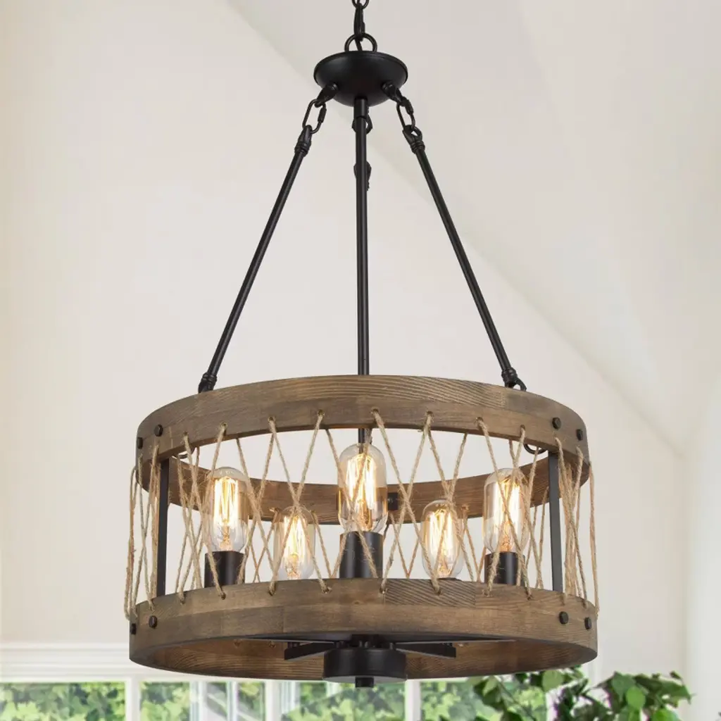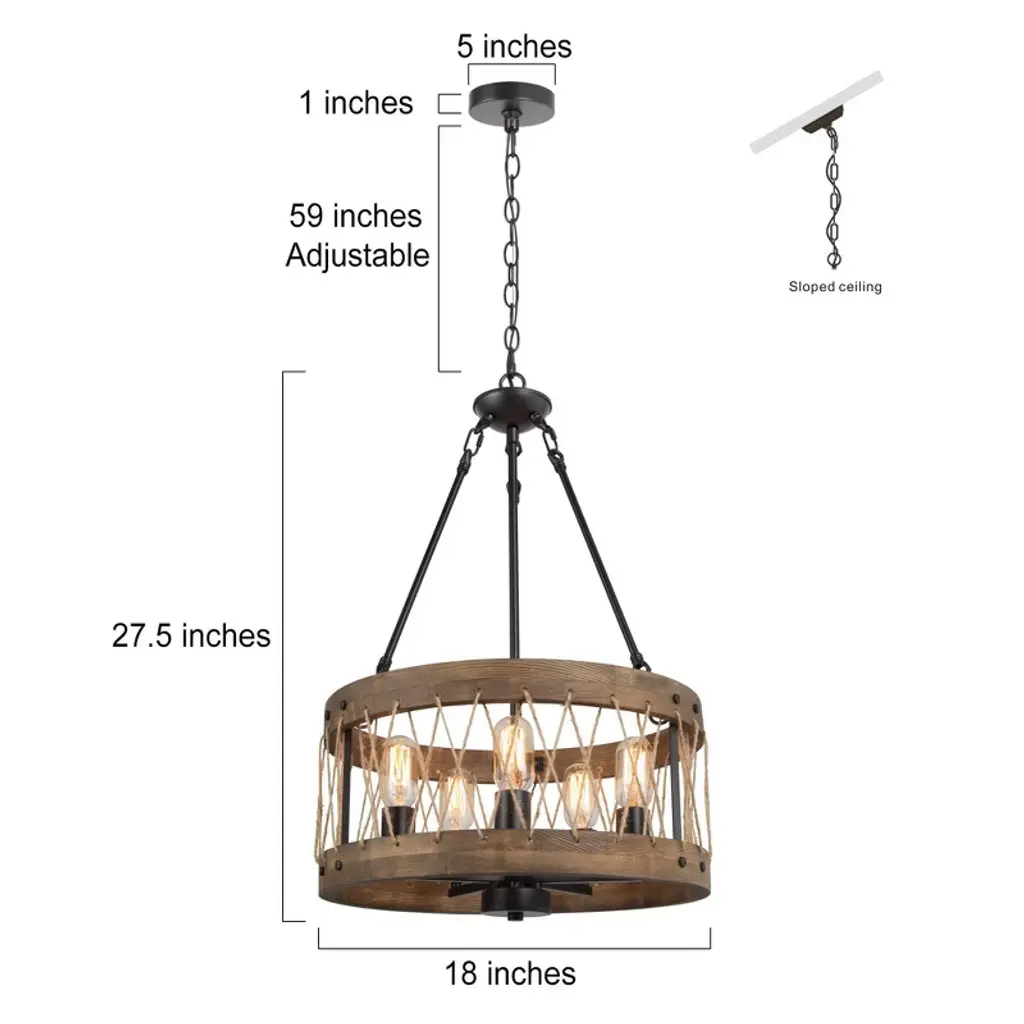 This 5-light chandelier from LNC Home pairs a distressed wooden frame with nature rope for a look that¡¯s both rustic and elegant. At 18" wide by 27.5" high with an adjustable chain (30.5" to 87.5"), it adapts to flat or sloped ceilings in dining rooms, foyers, or open living spaces. From the Laius collection, this design balances organic materials with timeless form, blending farmhouse warmth and classic appeal. It offers everyday function while transforming interiors with soft light and artisanal charm. Bulbs not included.