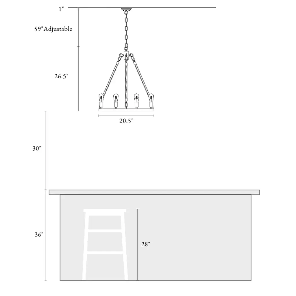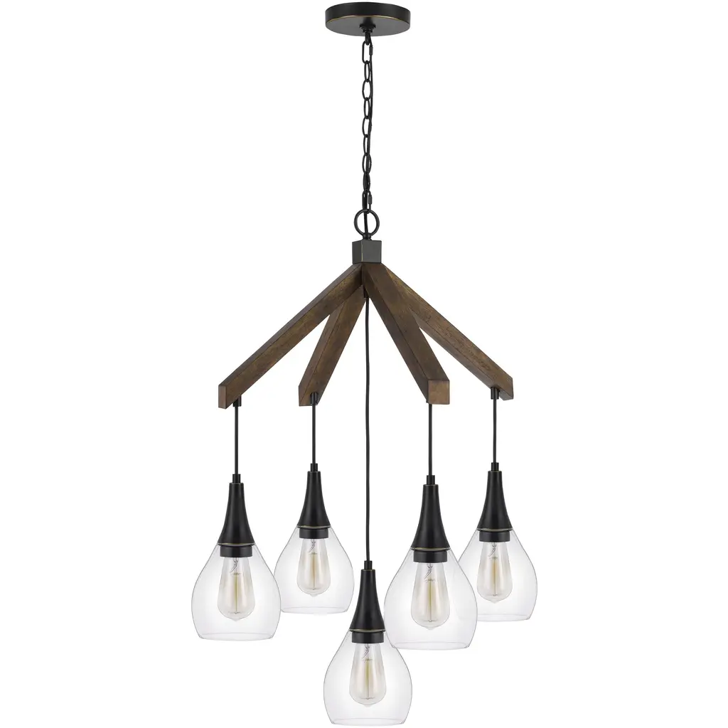 Rustic strength meets refined form in this 6-light chandelier from LNC Home. A matte black circular ring is supported by weathered wood beams, framing exposed bulbs that cast warm, open light. Measuring 20.5" wide by 26.5" high with an adjustable chain (29" to 86.5"), it adapts seamlessly to vaulted or flat ceilings in dining rooms, foyers, or great rooms. From the Laiuls Collection, this design merges rugged textures with bold geometry, offering a dramatic yet welcoming focal point. Perfect for modern farmhouse living, it adds both durability and charm. Bulbs not included.