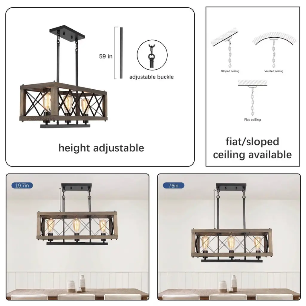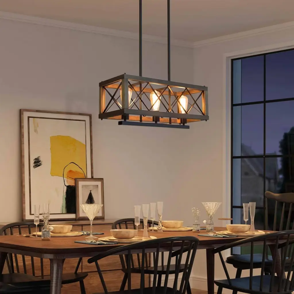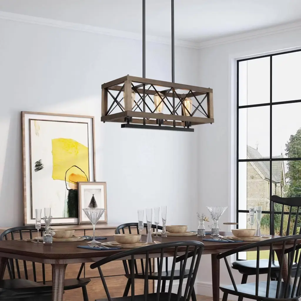 This modern farmhouse style pendant lighting is made of a combination of hollow wooden frame and iron, a natural wood grain shade like a rectangular cage, matte black design perfectly reflects the modern farmhouse style. The simple design is an excellent choice for your kitchen island, dining area, living room, or bedroom.