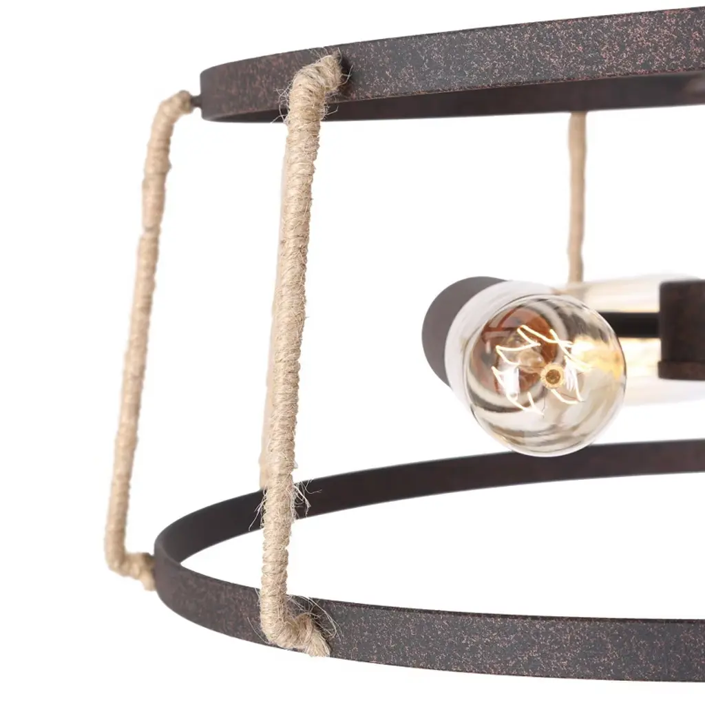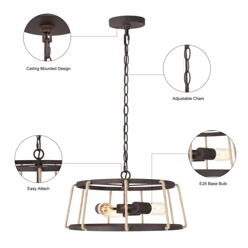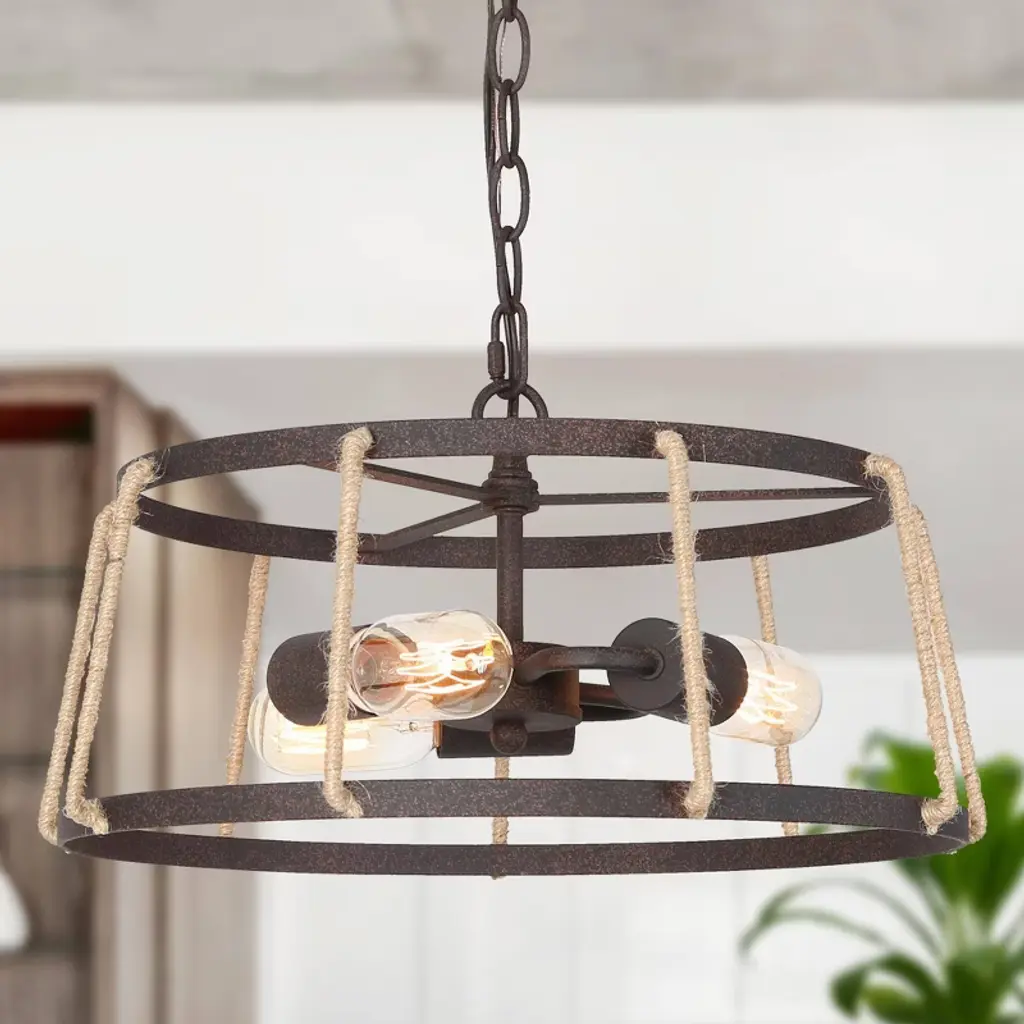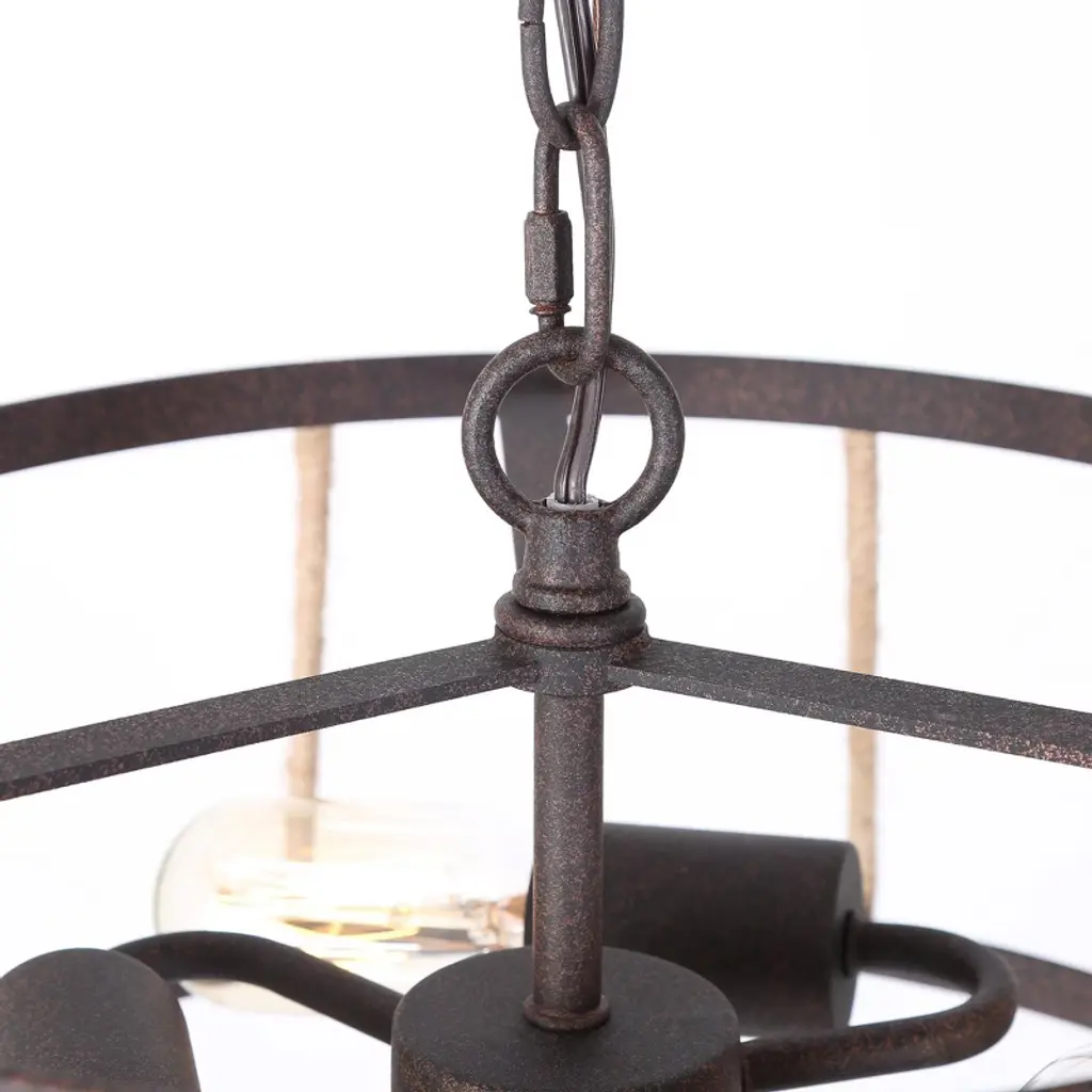 This farmhouse chandelier light is designed in finely mill work drum shape, constructed of durable wrought iron in rusty bronze finish, linen ropes to add much farmhouse retro and with three medium base design to boost maximum ambiance to your home place.
