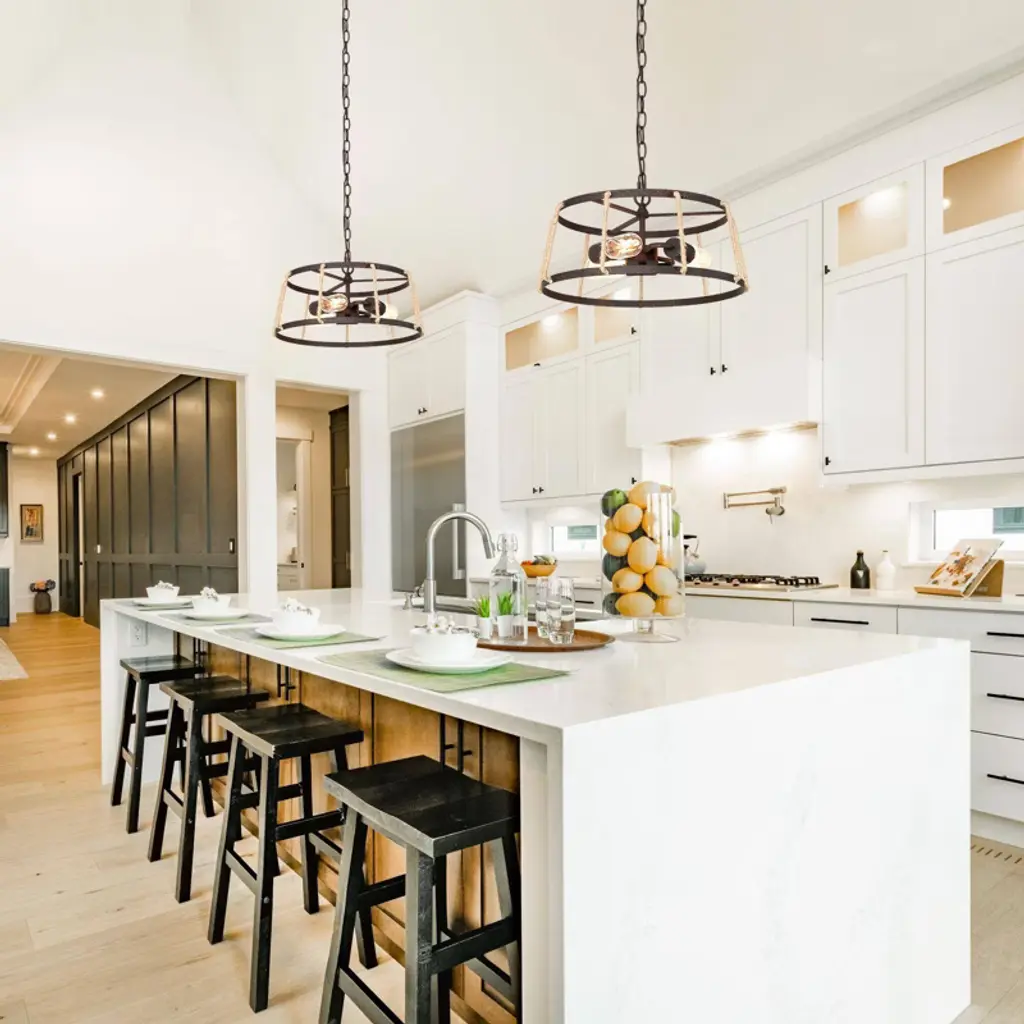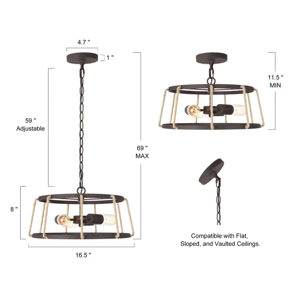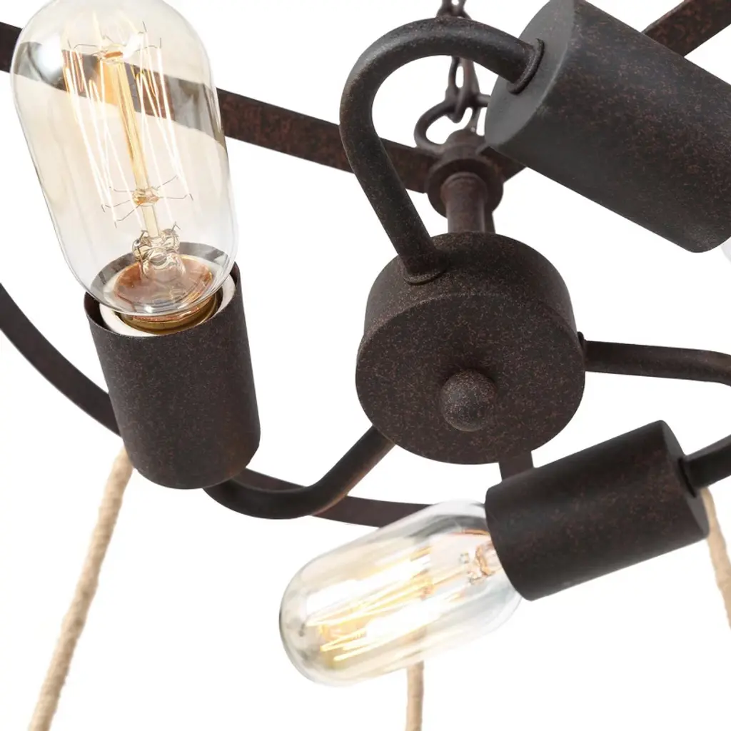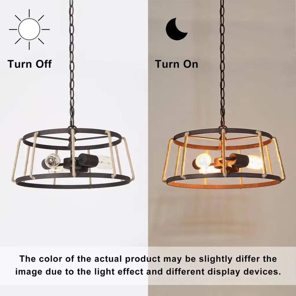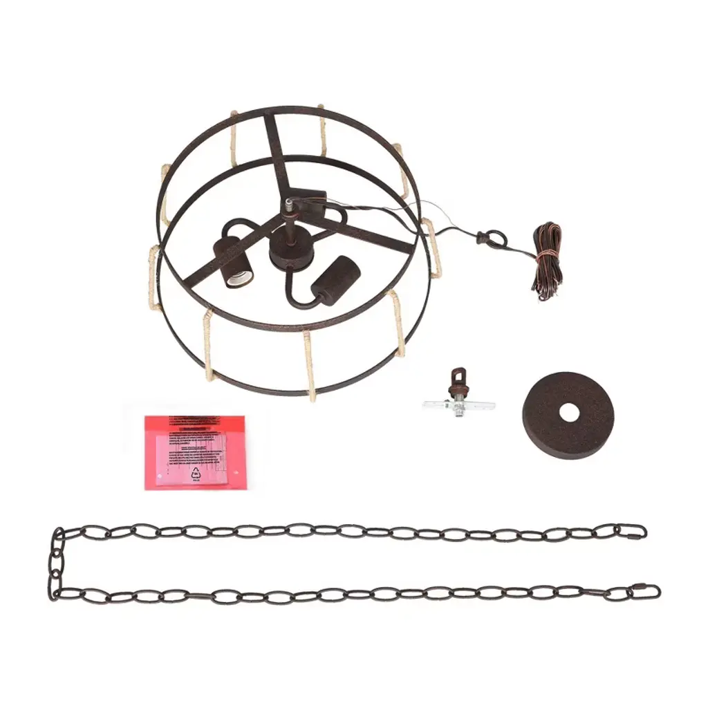 This farmhouse chandelier light is designed in finely mill work drum shape, constructed of durable wrought iron in rusty bronze finish, linen ropes to add much farmhouse retro and with three medium base design to boost maximum ambiance to your home place.