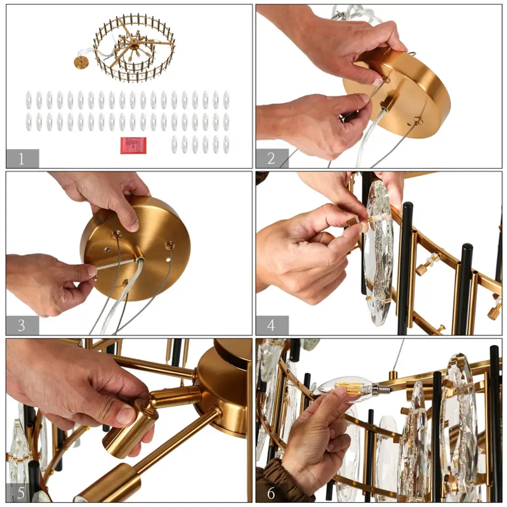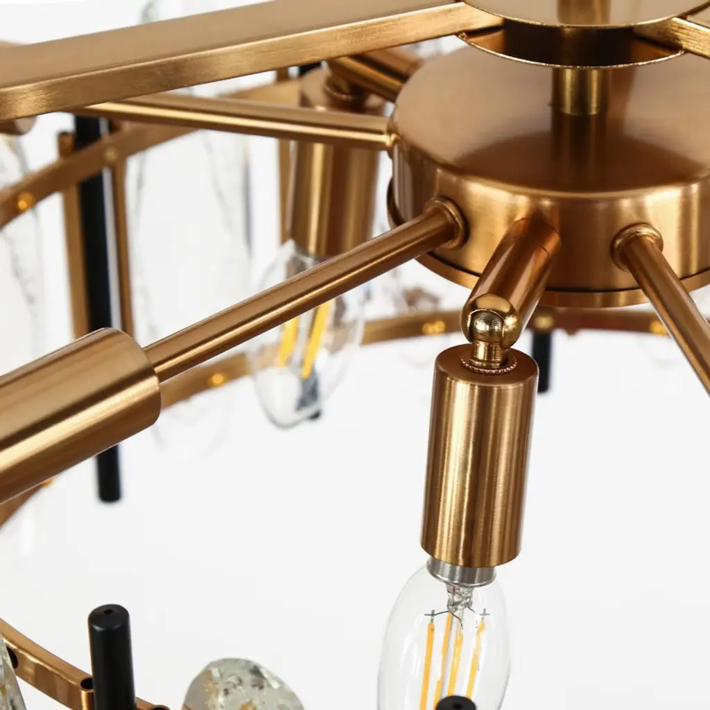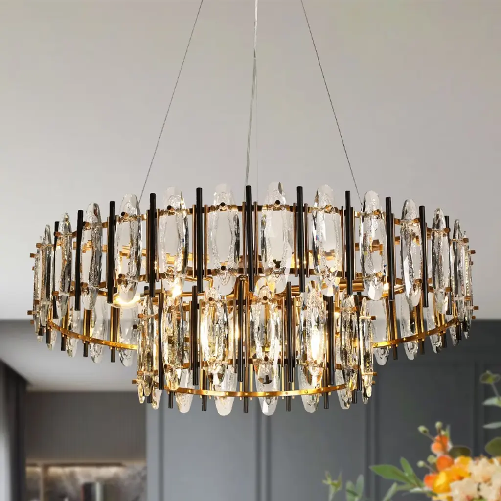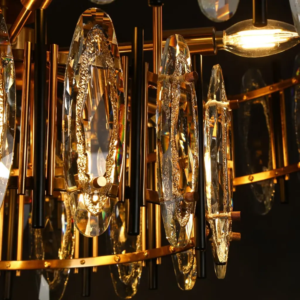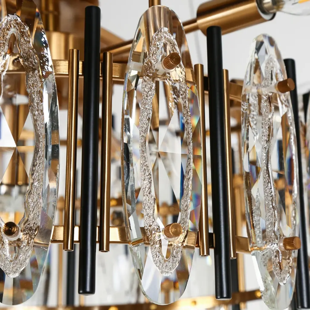 The LNC Noctiflorous 6-Light Polished Gold Chandelier represents an exquisite fusion of contemporary artistry and enduring elegance, meticulously designed to serve as the focal point of any refined setting. Its design is inspired by the intricate interplay of light and shadow, evoking the serene ambiance of moonlight filtering through a nocturnal garden. Precision-engineered, the drum chandelier showcases a polished gold frame embellished with clear oval K5 crystals, each carefully positioned to optimize the capture and refraction of light, thereby producing a captivating visual spectacle. The tiered-shaped structure, with dimensions of 32.3 inches in diameter and 11.2 inches in height, is enhanced by matte black accents, which provide a striking contrast and add depth to its radiant allure.