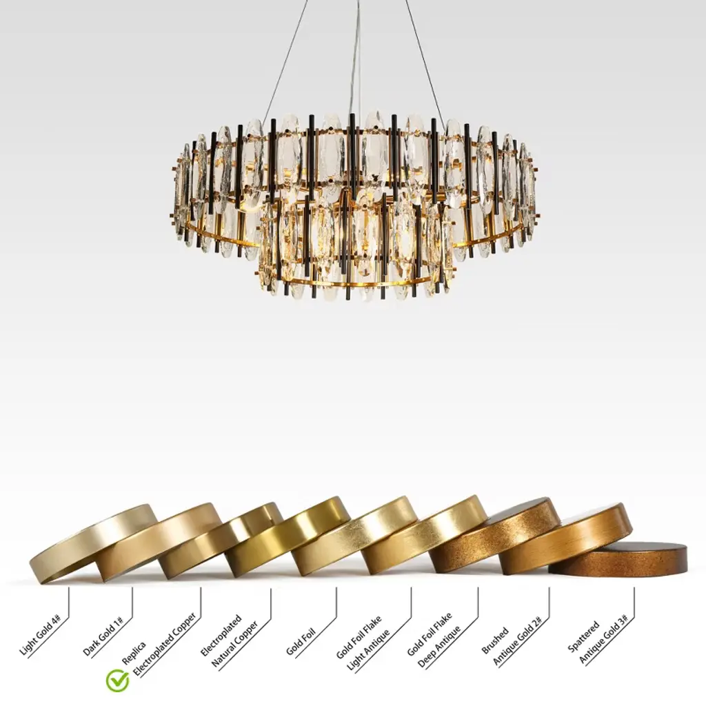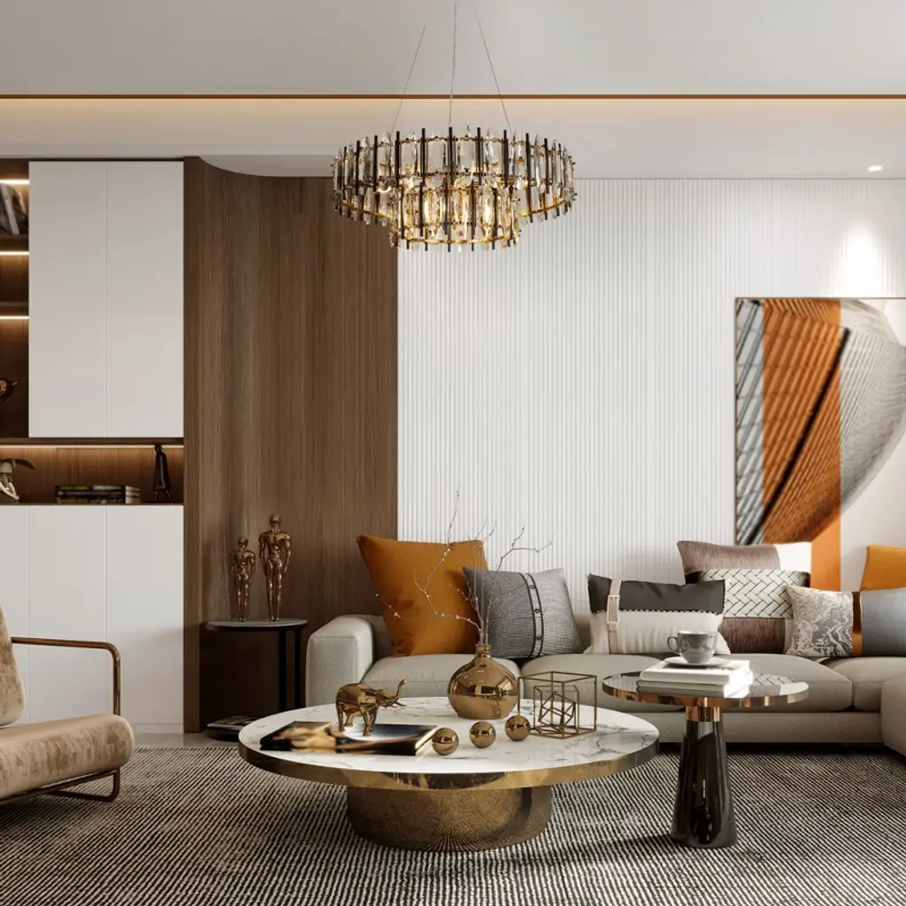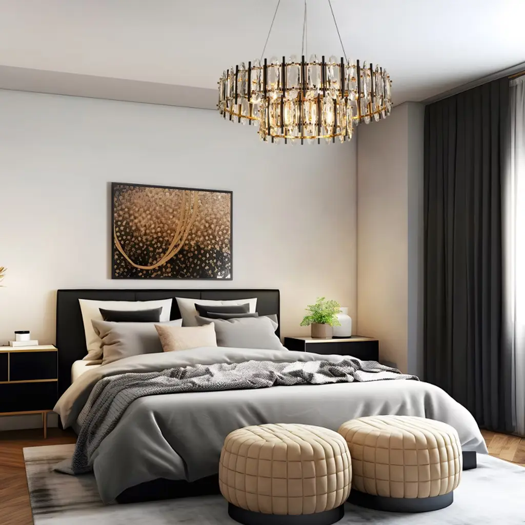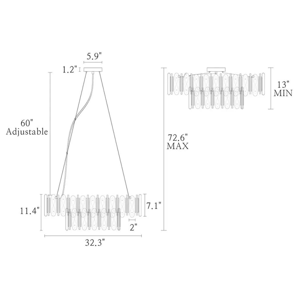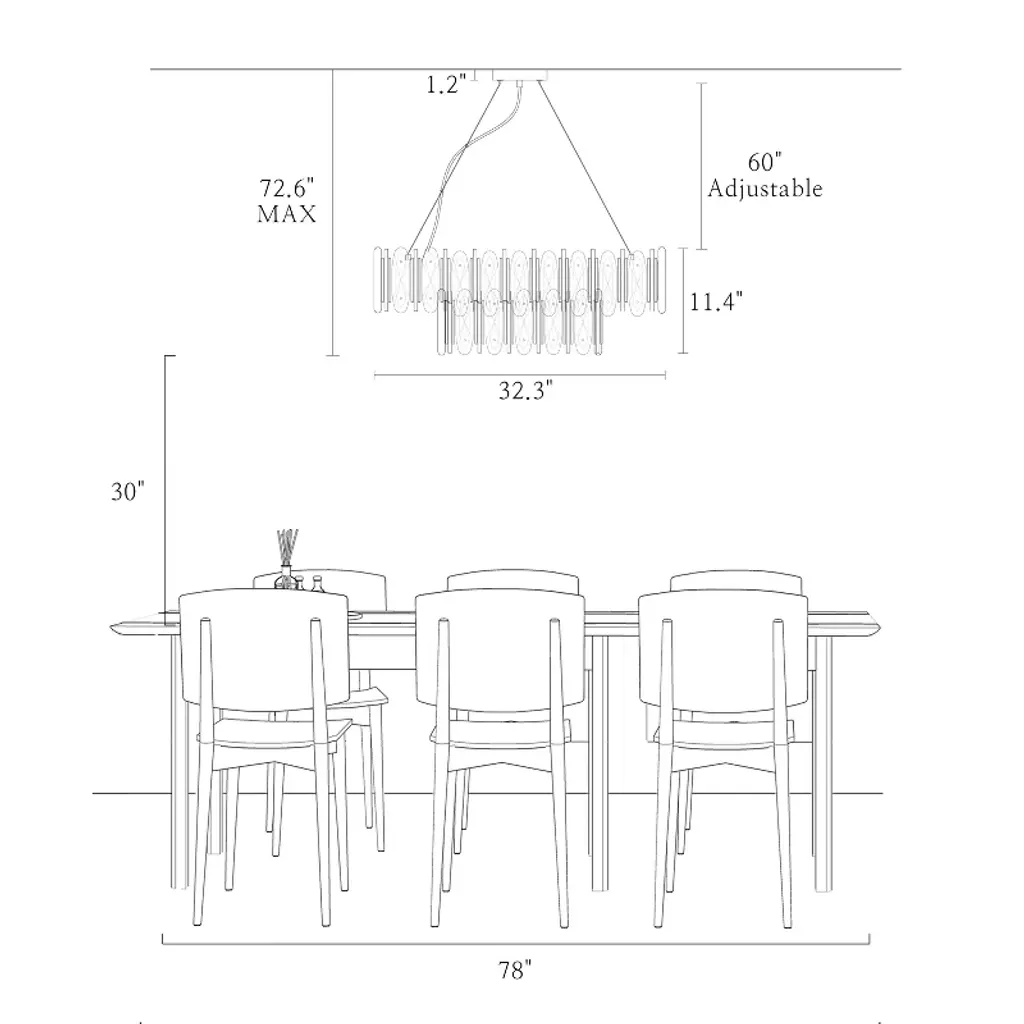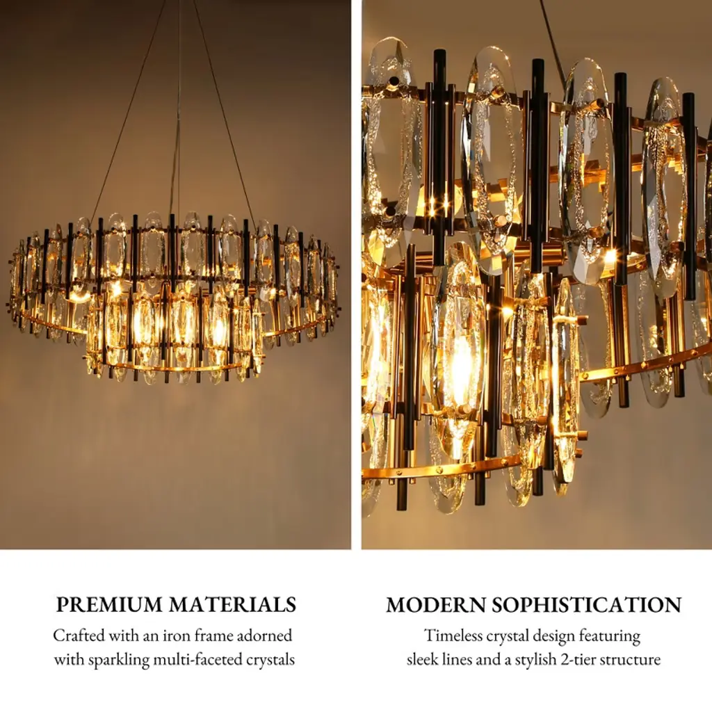 The LNC Noctiflorous 6-Light Polished Gold Chandelier represents an exquisite fusion of contemporary artistry and enduring elegance, meticulously designed to serve as the focal point of any refined setting. Its design is inspired by the intricate interplay of light and shadow, evoking the serene ambiance of moonlight filtering through a nocturnal garden. Precision-engineered, the drum chandelier showcases a polished gold frame embellished with clear oval K5 crystals, each carefully positioned to optimize the capture and refraction of light, thereby producing a captivating visual spectacle. The tiered-shaped structure, with dimensions of 32.3 inches in diameter and 11.2 inches in height, is enhanced by matte black accents, which provide a striking contrast and add depth to its radiant allure.