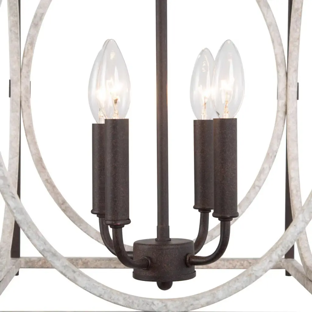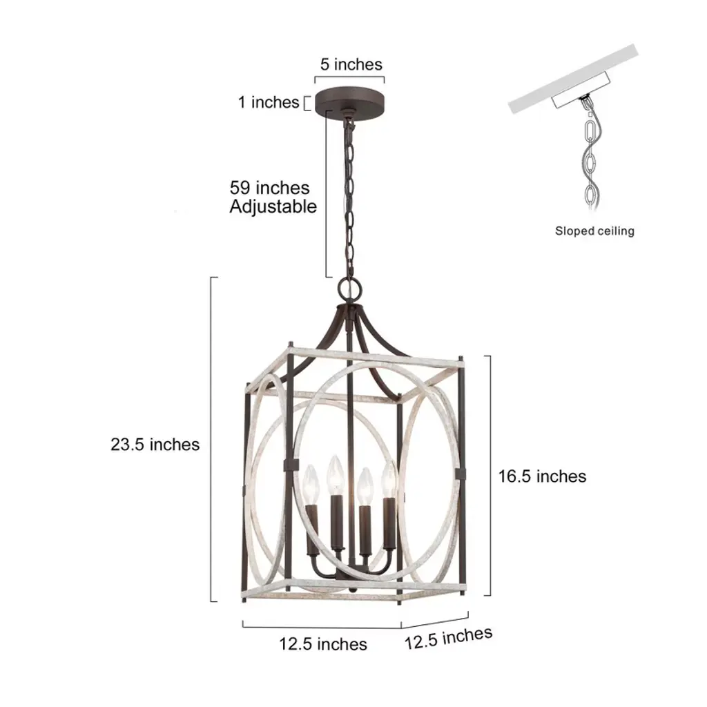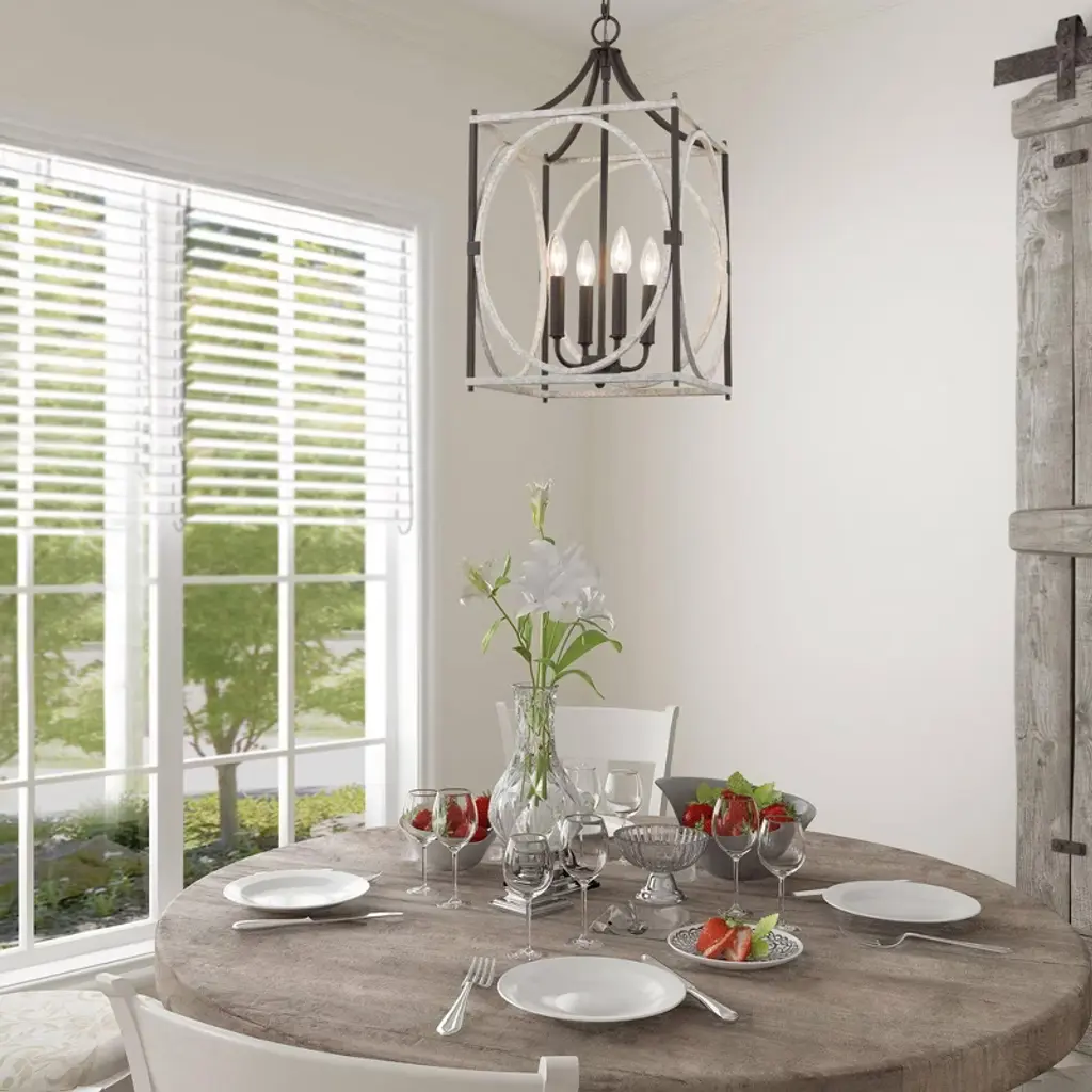New world decor distressed gray cage farmhouse style chandelier. This dining room chandelier is made of metal with a weathered white and rustic bronze finish. The square cage frame and its distressed finish could enhance the farmhouse or traditional home decor style. This foyer chandelier creates a stunning display of light and shadow on the ceiling, casting an elegant pattern that adds warmth and sophistication to any space when the lights are on. Recommend using decor lighting in the foyer, kitchen island, dining area, and bedroom to create a stunning look and comfortable atmosphere.