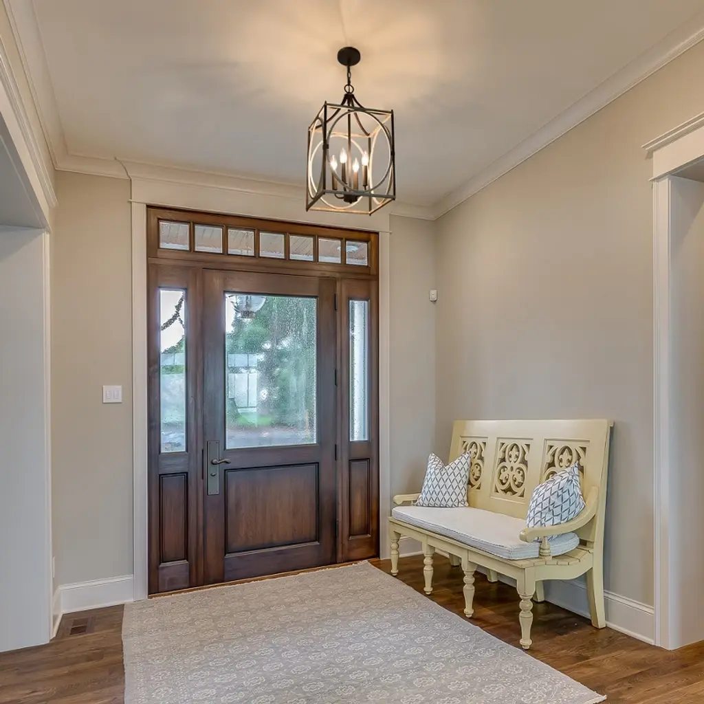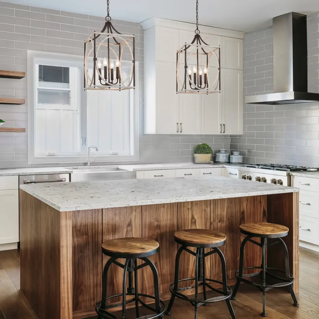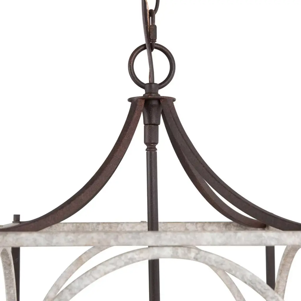 New world decor distressed gray cage farmhouse style chandelier. This dining room chandelier is made of metal with a weathered white and rustic bronze finish. The square cage frame and its distressed finish could enhance the farmhouse or traditional home decor style. This foyer chandelier creates a stunning display of light and shadow on the ceiling, casting an elegant pattern that adds warmth and sophistication to any space when the lights are on. Recommend using decor lighting in the foyer, kitchen island, dining area, and bedroom to create a stunning look and comfortable atmosphere.