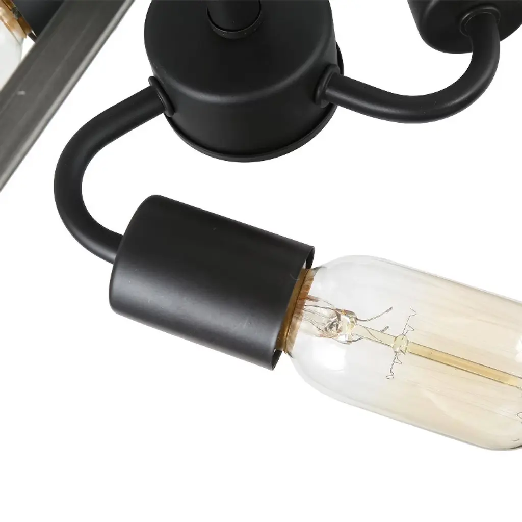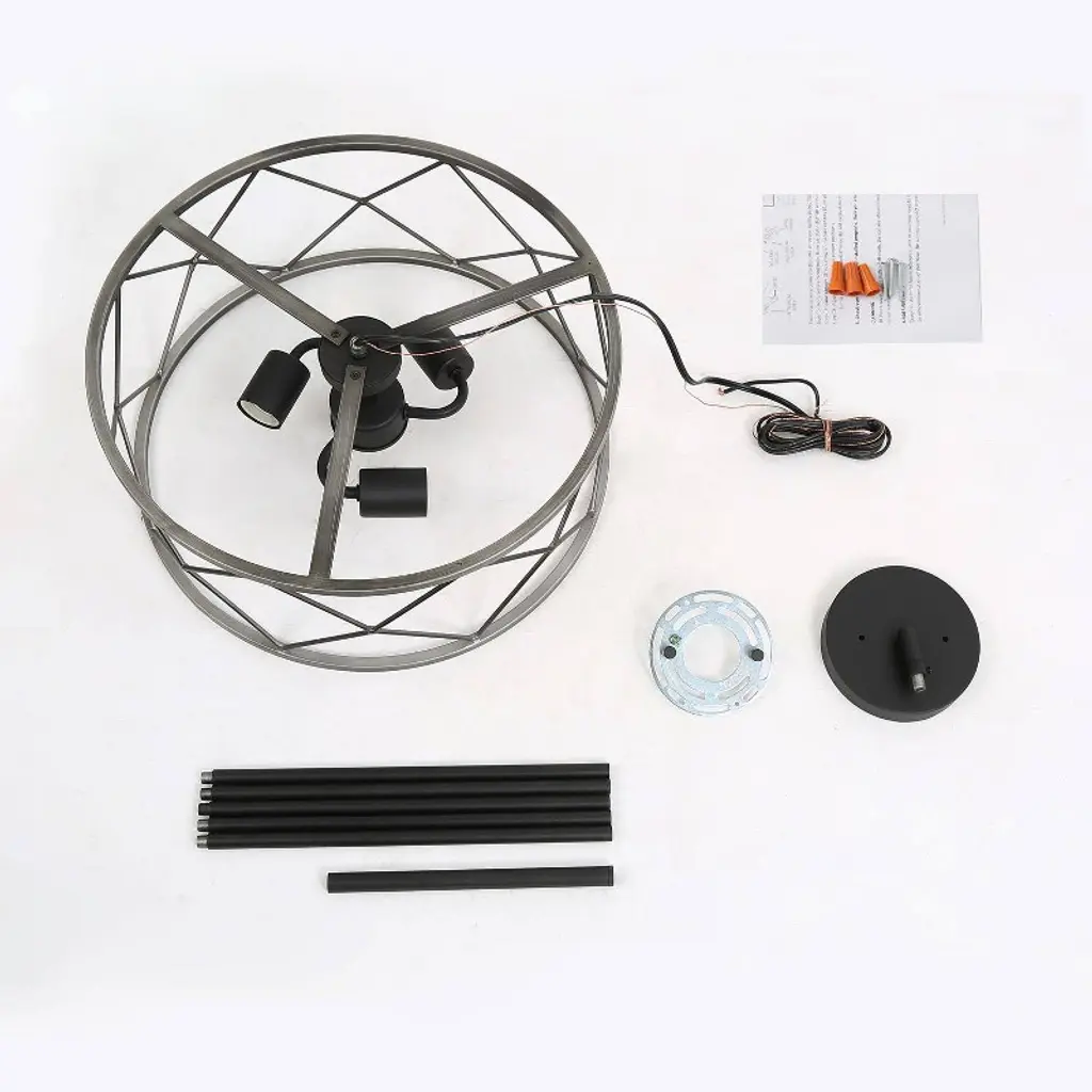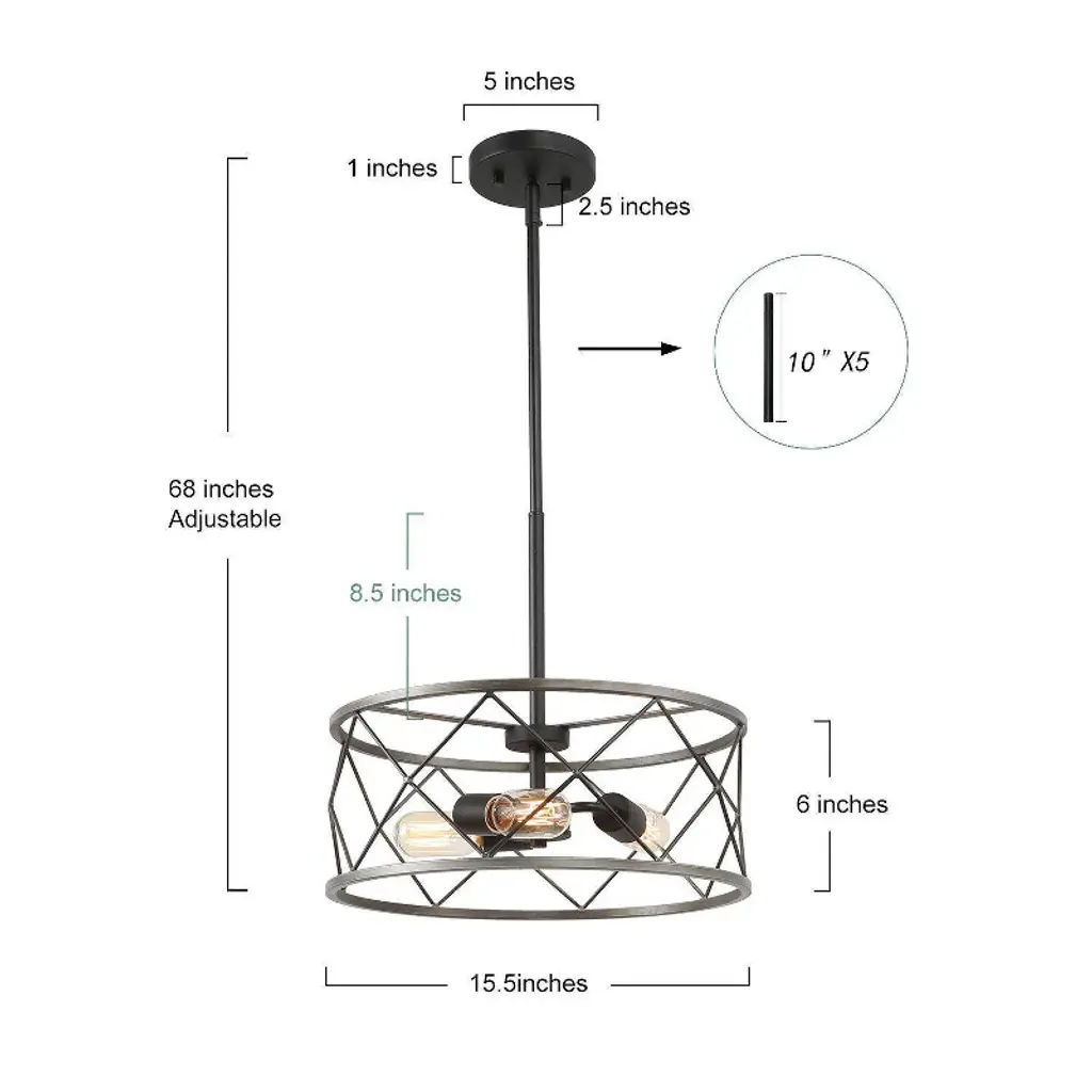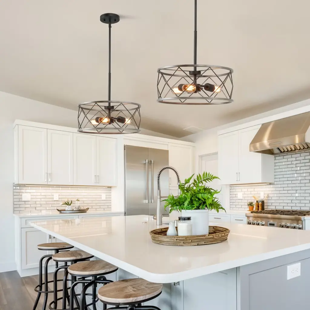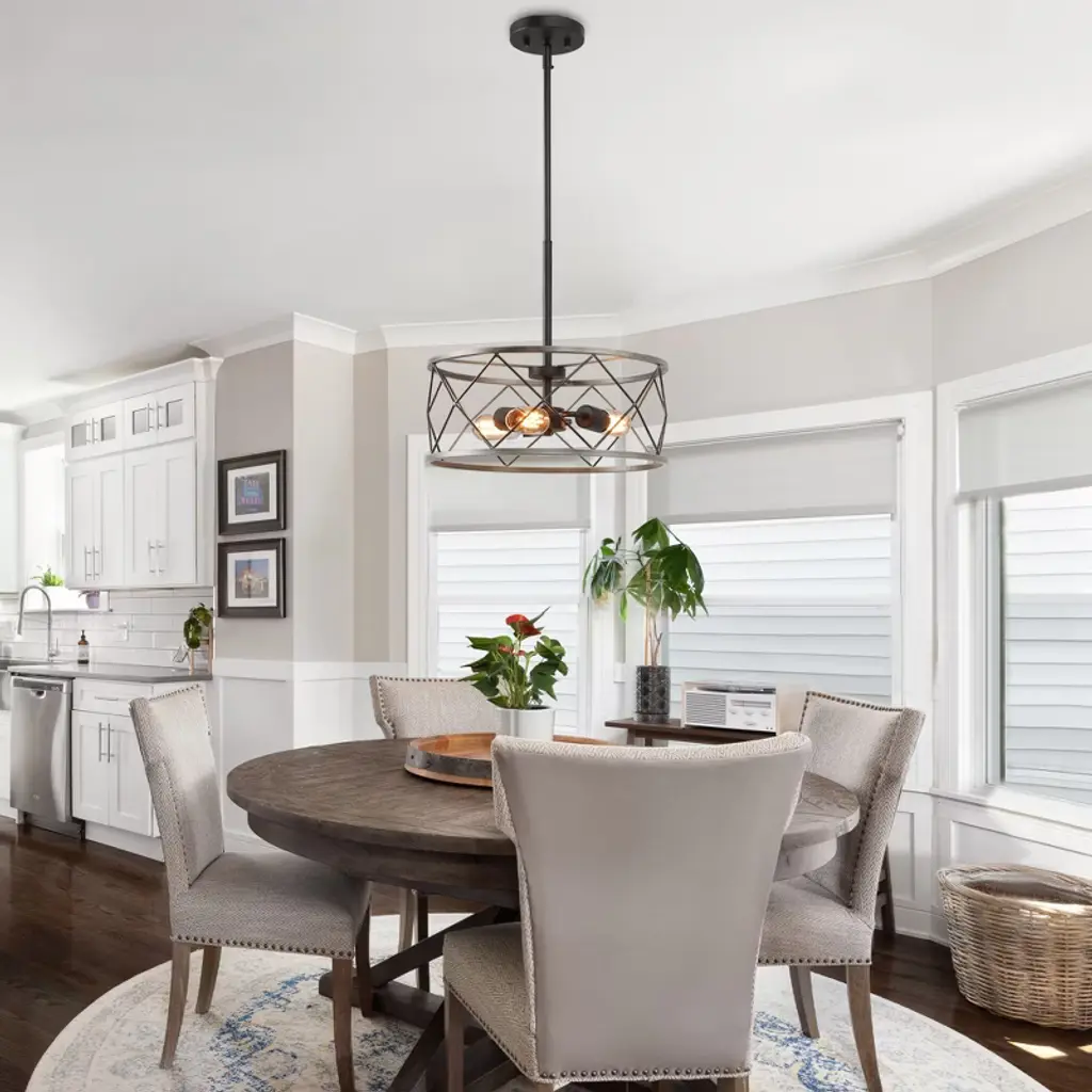 Add industrial flair to your home with this modern 4-light drum chandelier. Featuring a brushed gray and black finish, the open metal shade showcases a geometric crisscross design that brings a bold, modern edge to any space. Whether hung over a kitchen island, in a foyer, or above a staircase, this versatile fixture provides stylish illumination with its exposed bulb design. The height-adjustable downrod ensures a custom fit for ceilings of all types, including sloped or vaulted.