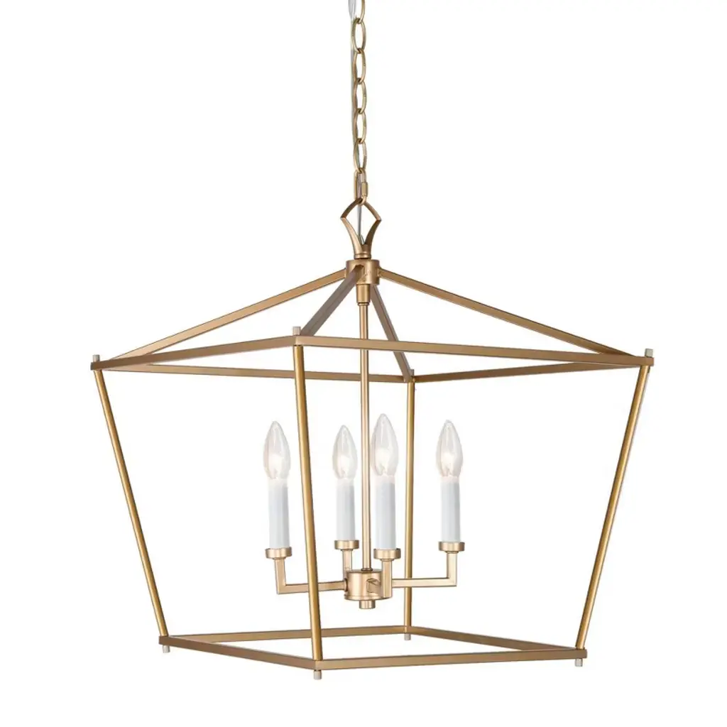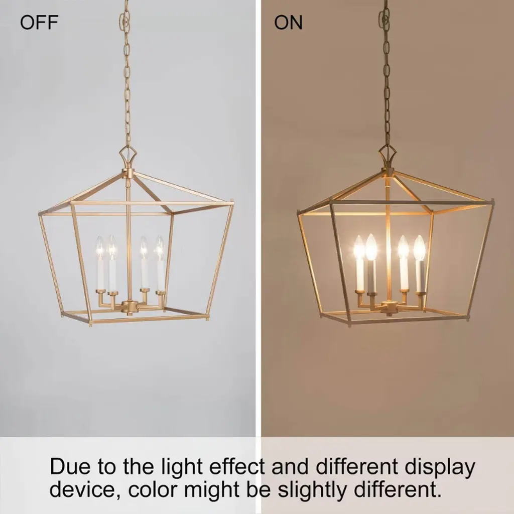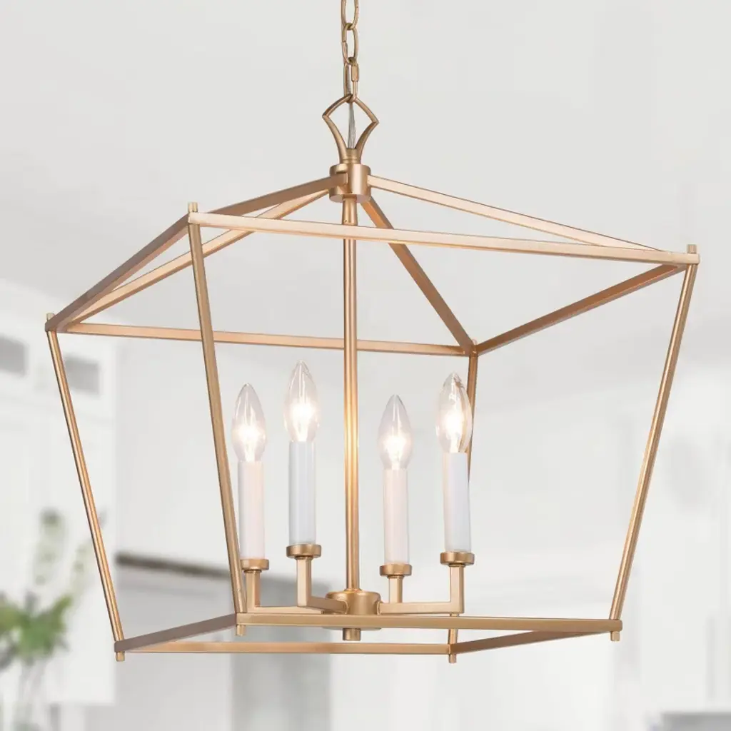 Inspired by a transitional multi-candle hanging lantern pendant light, this LNC Tabla 4-light gold geometric caged modern/contemporary candle chandelier is made of a sturdy steel frame. A high-end matte gold finish gives it a mysterious, inviting look that is special in such a minimalist design. Four white candles that look and feel like real wax provide a stylish contrast to the darker gold frame. Classic square shapes blend well with any decor from traditional to contemporary minimalist. This lantern pendant light is ideal for hanging in the living room, dining room, and kitchen island, adding style and simplicity vibe to your home.