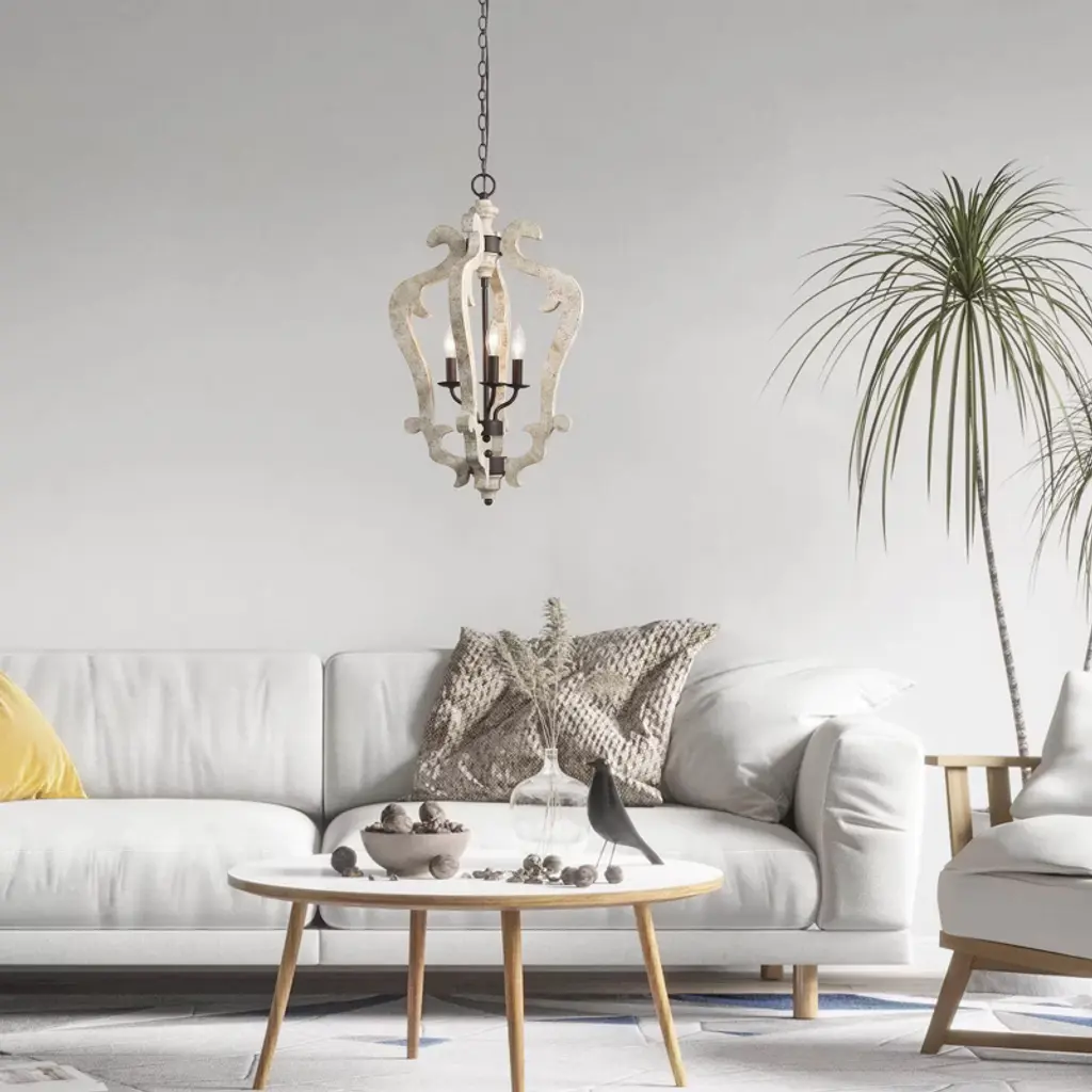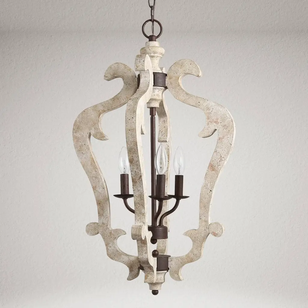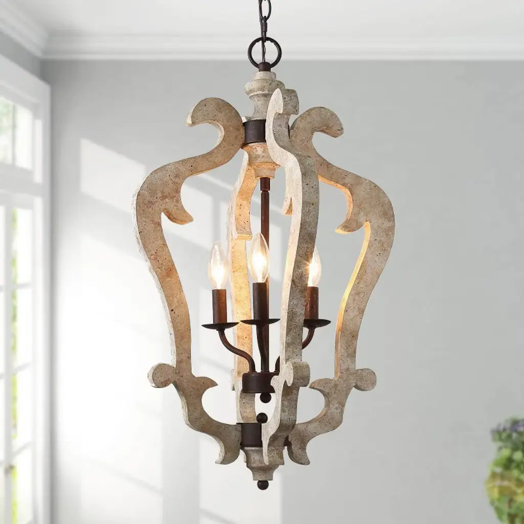 Bring classic elegance to your home with this sculptural 3-light lantern pendant chandelier. Featuring gracefully carved wood-inspired curves in a distressed beige finish, this statement piece draws from vintage French country design. The candelabra-style lights add a warm, timeless glow, perfect for entryways, stairwells, or dining rooms. Pair it with sloped or flat ceilings using the adjustable chain for a flexible, upscale look.