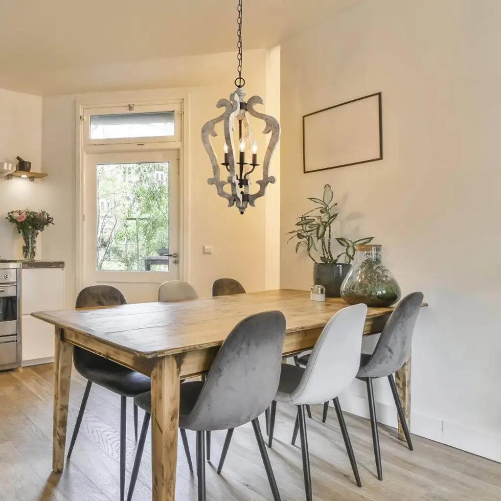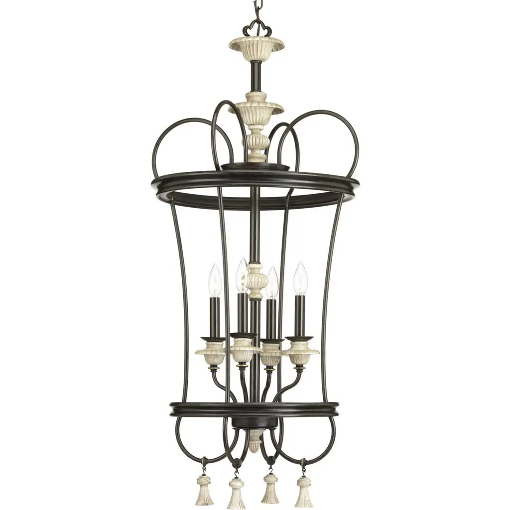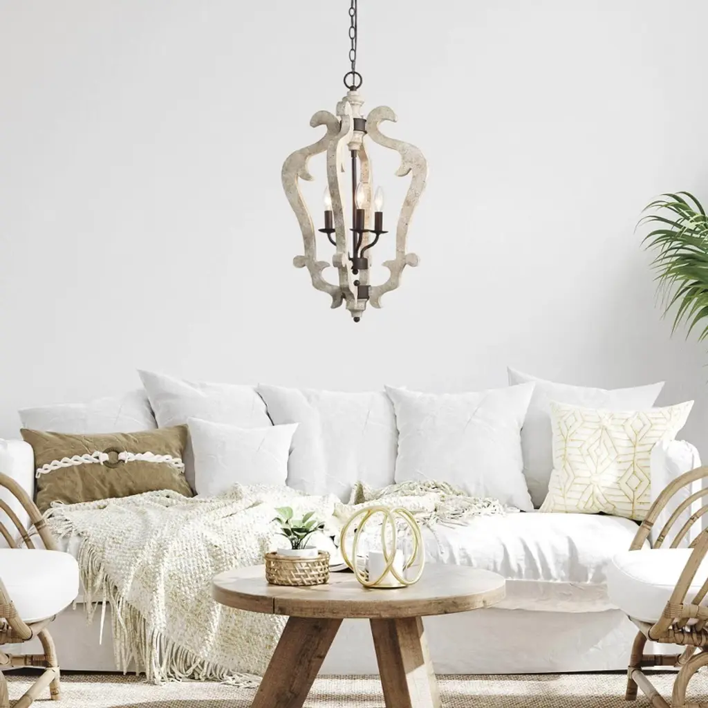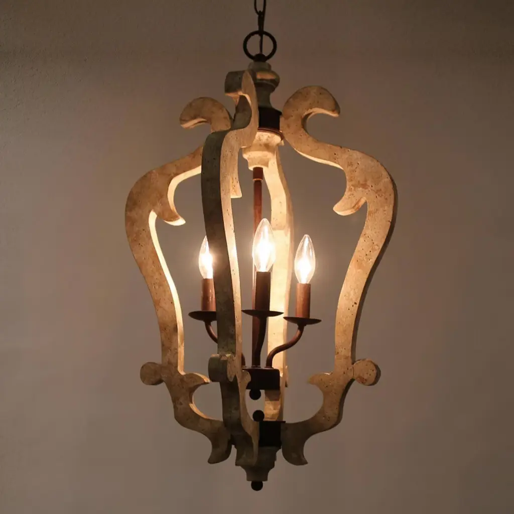 Bring classic elegance to your home with this sculptural 3-light lantern pendant chandelier. Featuring gracefully carved wood-inspired curves in a distressed beige finish, this statement piece draws from vintage French country design. The candelabra-style lights add a warm, timeless glow, perfect for entryways, stairwells, or dining rooms. Pair it with sloped or flat ceilings using the adjustable chain for a flexible, upscale look.