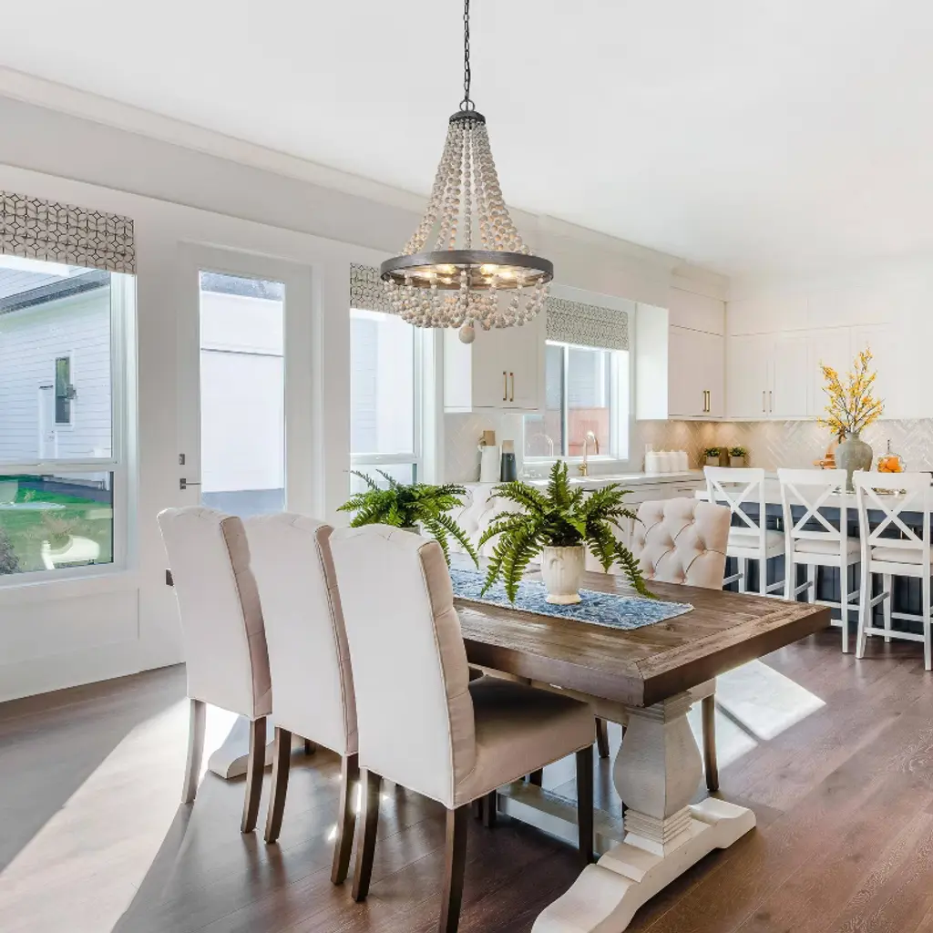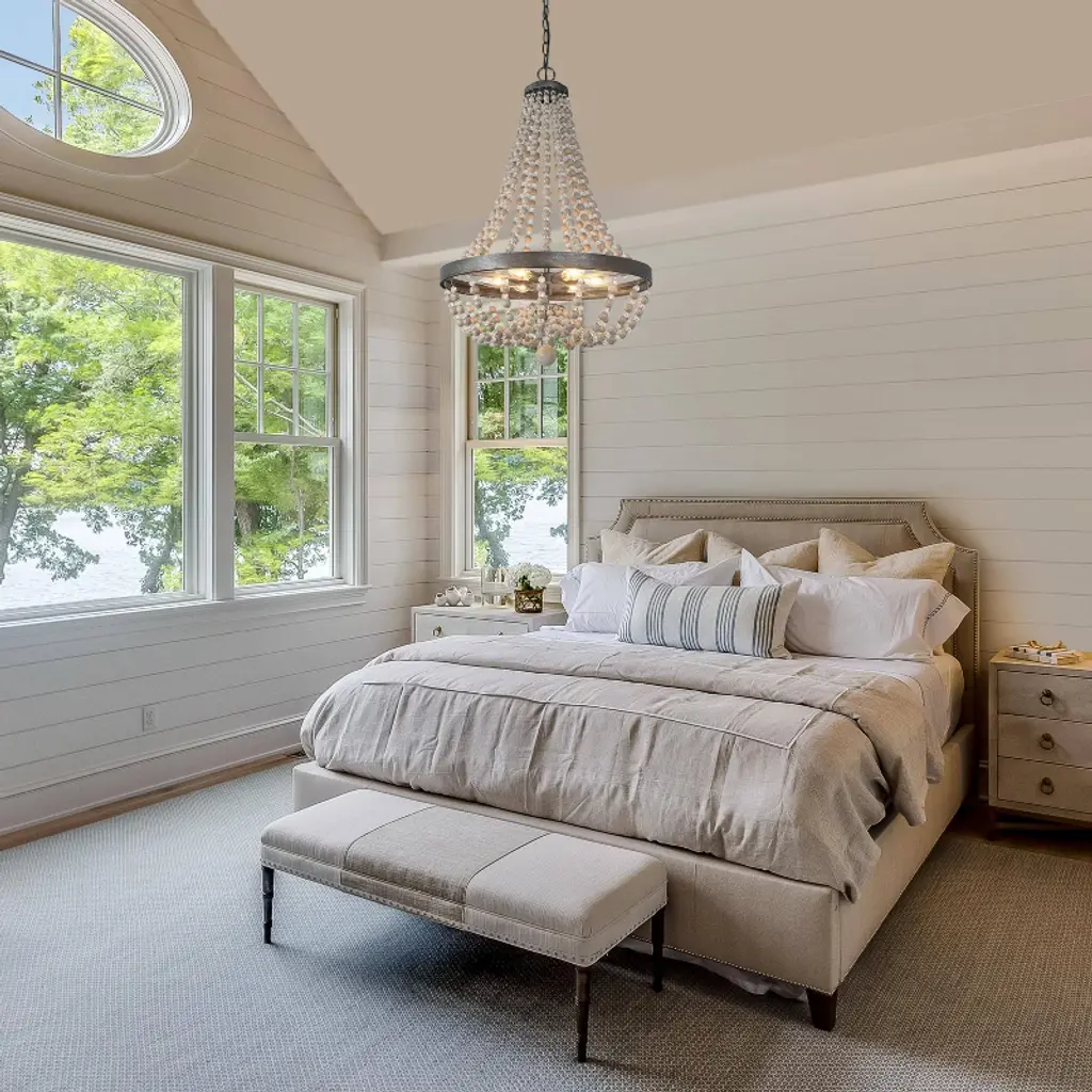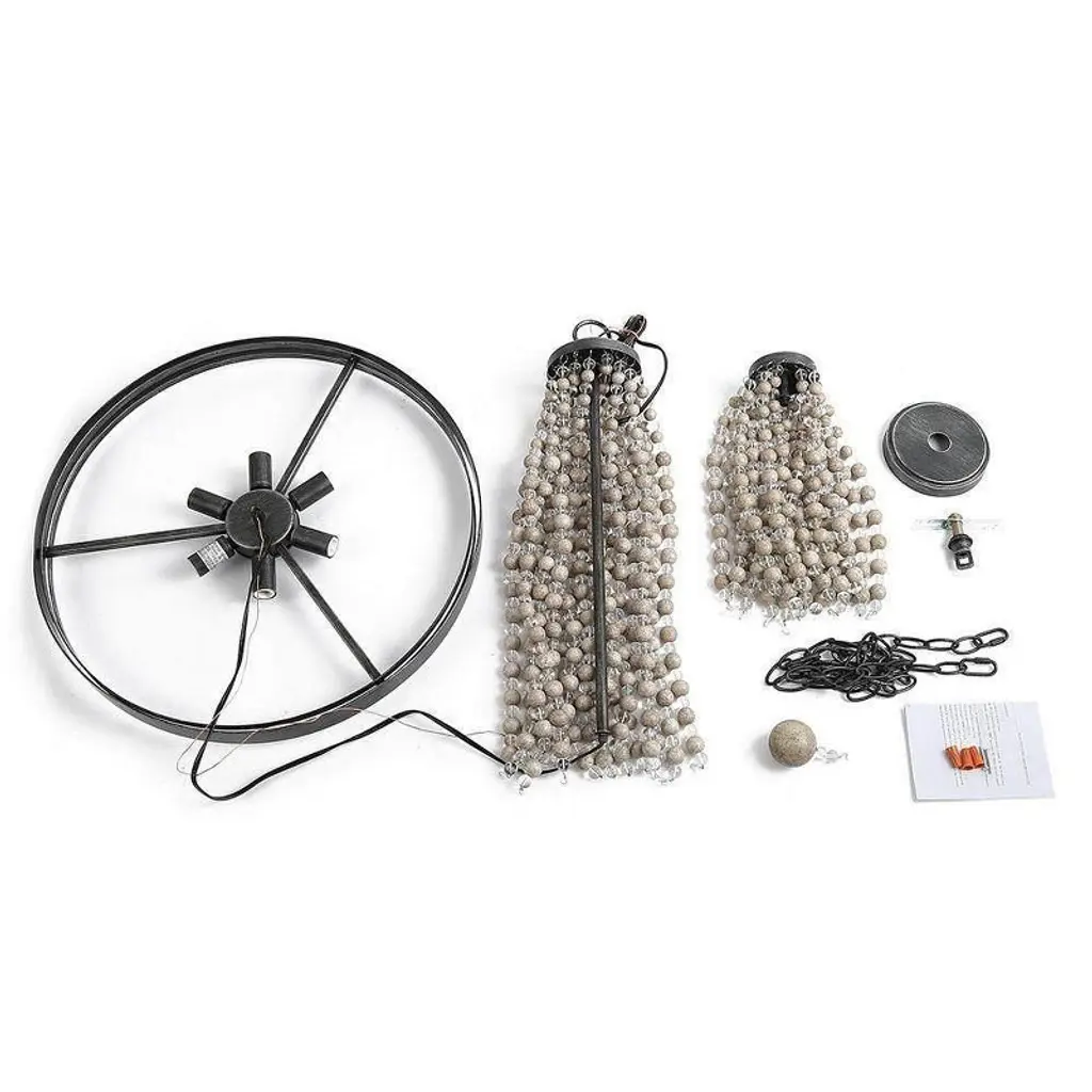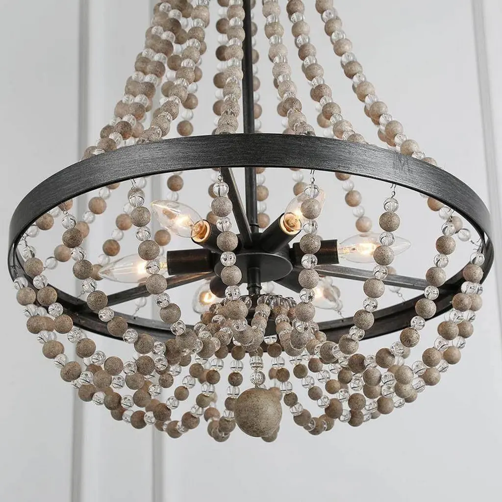 This elegant Bohemian dining room chandelier features a classic touch, with distressed wood beads and clear crystal beads. The beads come in gradient colors for added visual interest, creating an eye-catching look that adds a bohemian vibe to your home, and the charming 6 candelabra bulbs cast a warm glow throughout your space. Furthermore, it has diverse and extensive applications: this farmhouse chandelier dresses up any space, such as the entrance, living room, dining room, bedrooms and closet, especially with light-colored and wood-furniture home decor styles. This chandelier is perfect for upgrading your home's aesthetic.