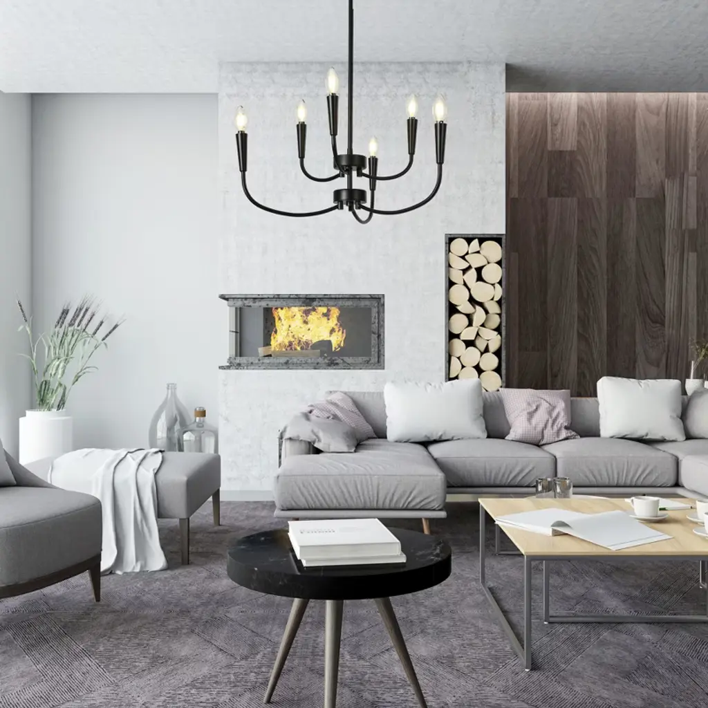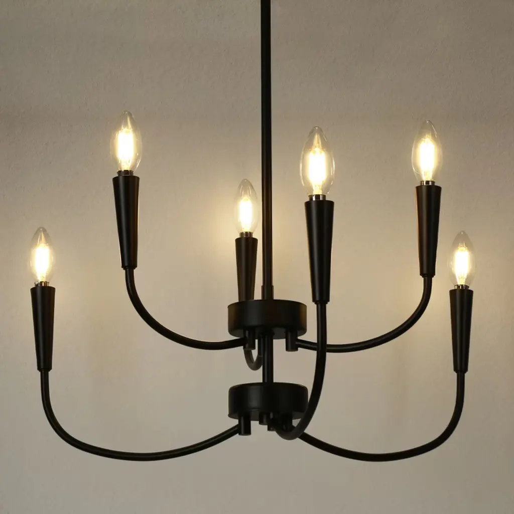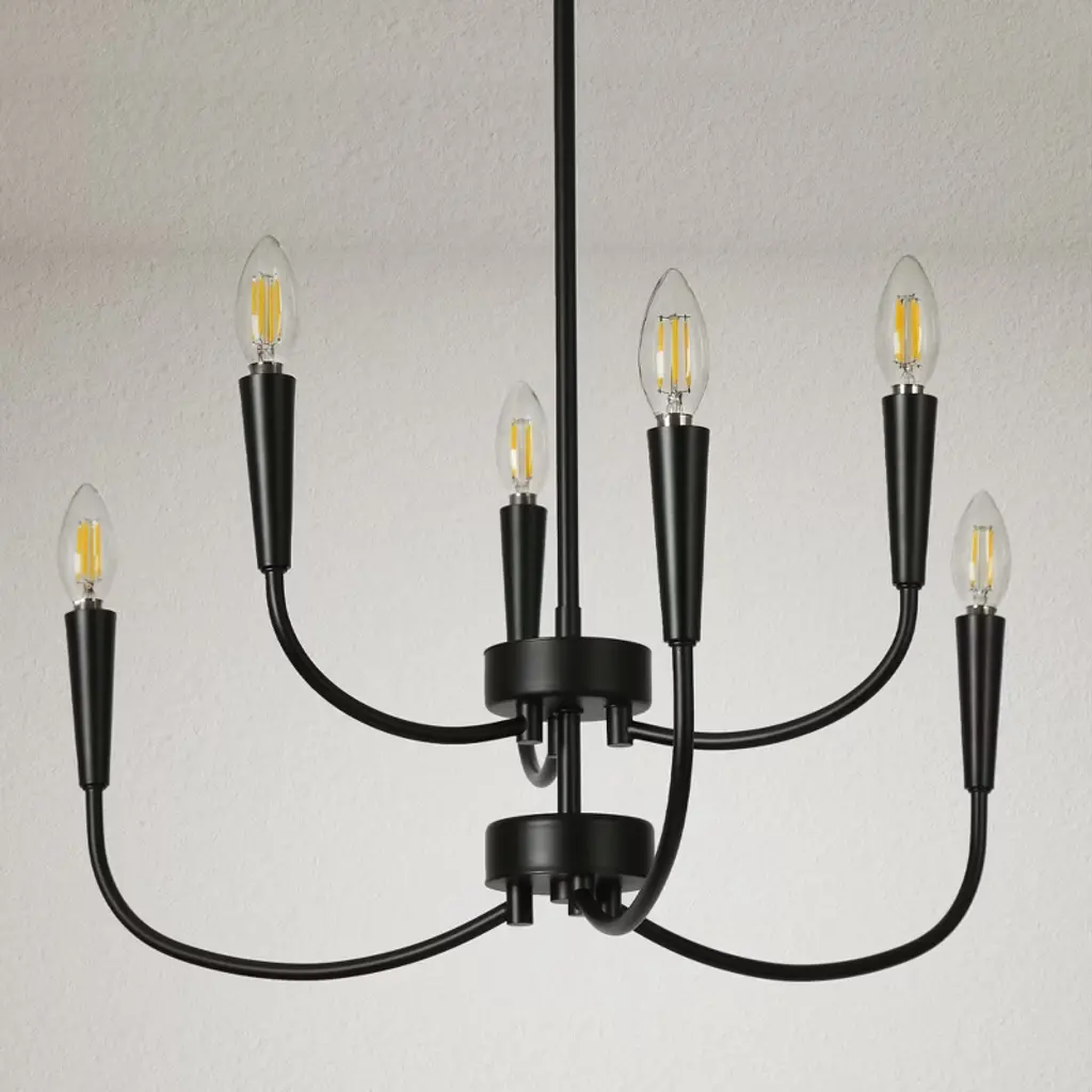 Inspired by the candelabra chandeliers that were once prevalent in the great rooms and dining halls of America's historic lodges, this chandelier collection brings a grand statement to the modern home without being overwhelming. The linear matte black chandelier embodies an unconventional modern style, showcasing six upright lights arranged on two tiers for a distinctive sprawling effect. The dimmable candle-style lights emit a warm, inviting glow, while sleek angles harmonize to form a captivating focal point. This chandelier is an ideal addition to your modern family dining room, kitchen, living room, bedroom, staircase or foyer, infusing it with contemporary elegance.