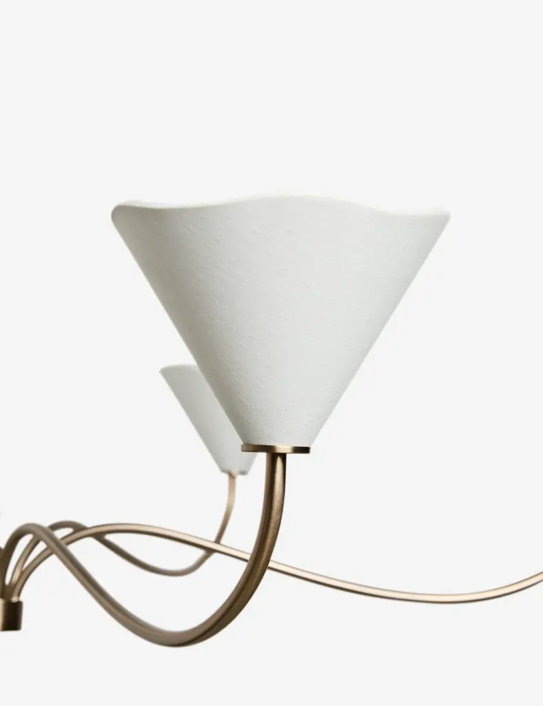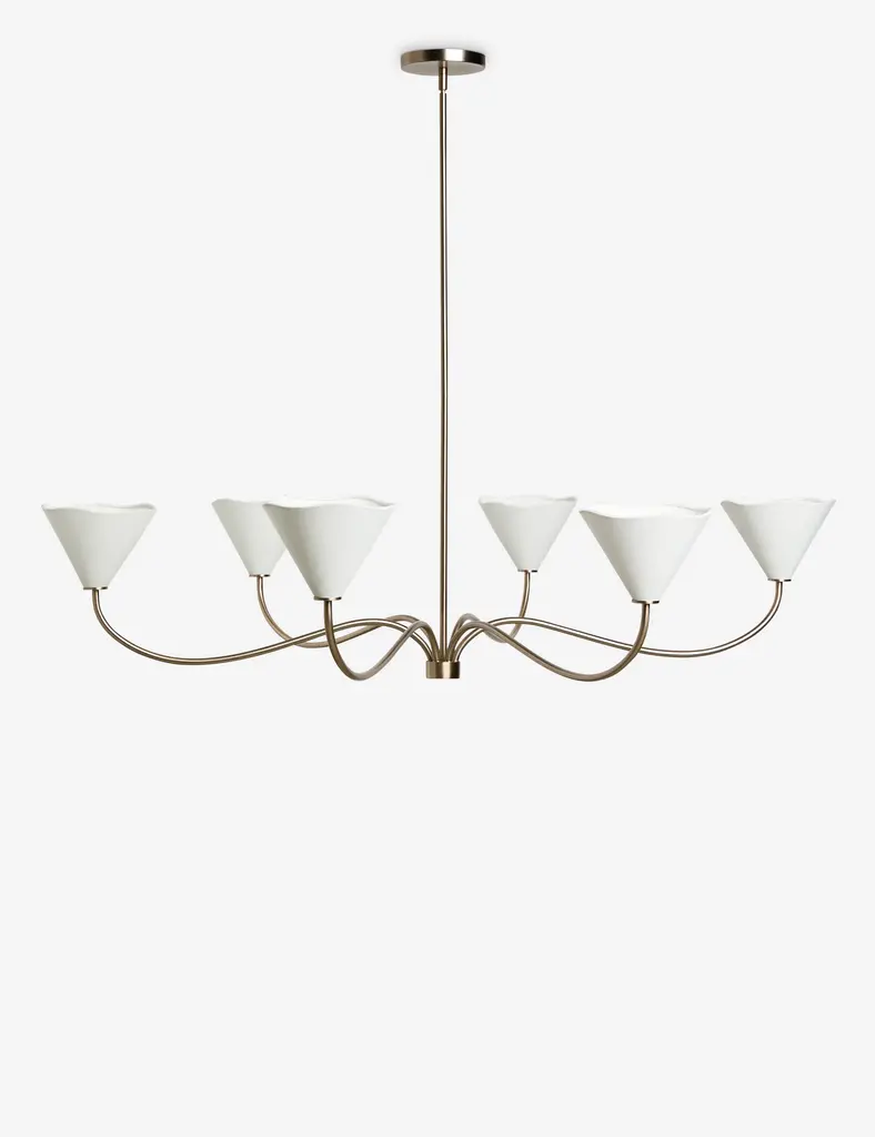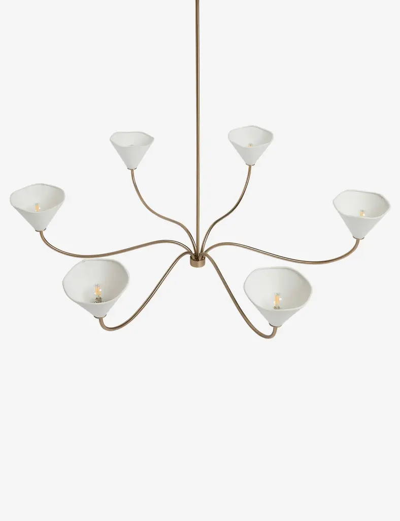 With slender lines and subtle floral form, our Loana chandelier is poised for effortless sophistication. This large chandelier features six curvilinear arms to create a brilliant pool of ambient light overhead. The brass finish and linen shades set the tone for warmth and elegance.