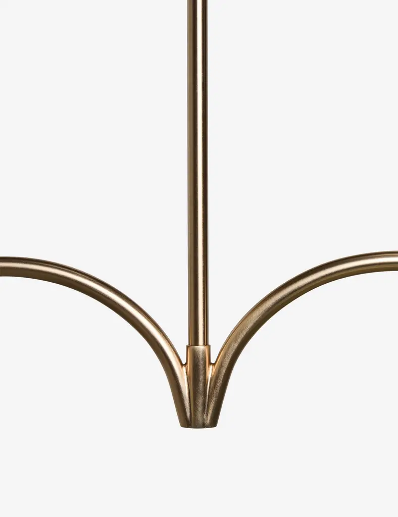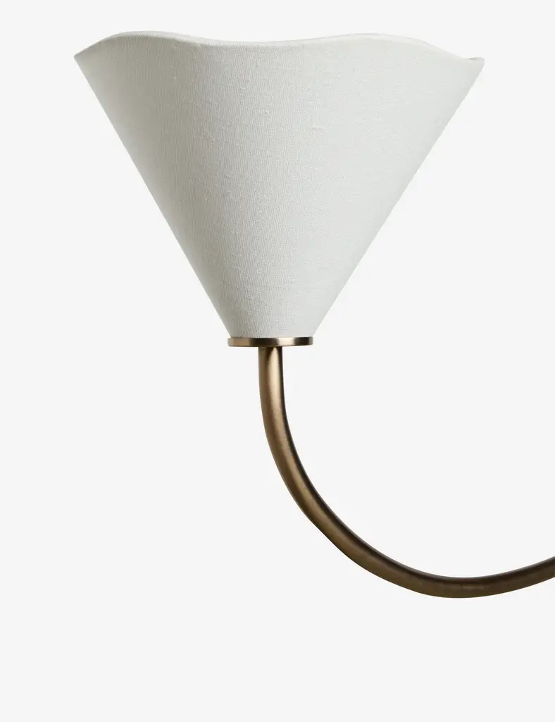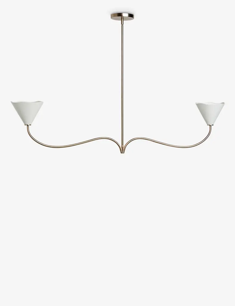 With slender lines and subtle floral forms, our Loana chandelier is poised for effortless sophistication. This linear chandelier features two curvilinear arms with a long reach that is perfect for a large dining table or entry hall statement piece. The brass finish and linen shades set the tone for warmth and elegance.