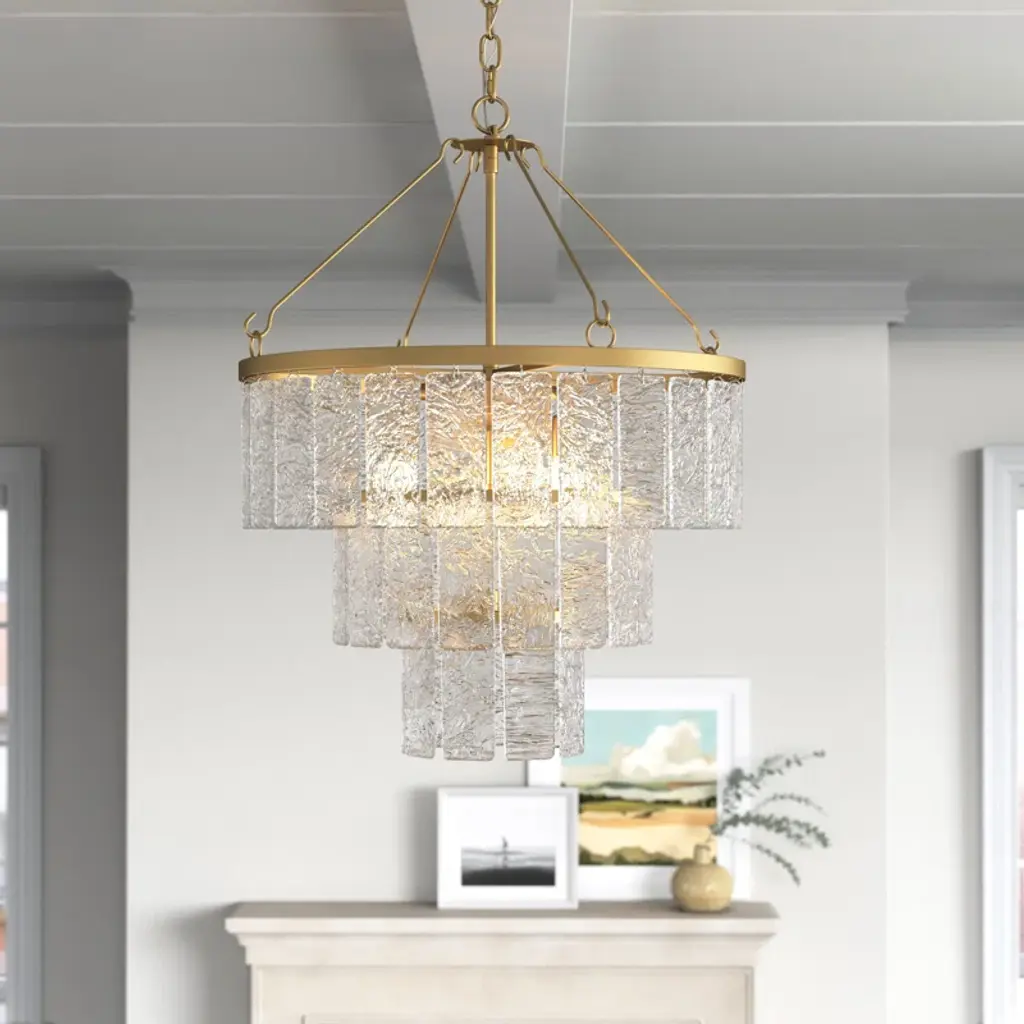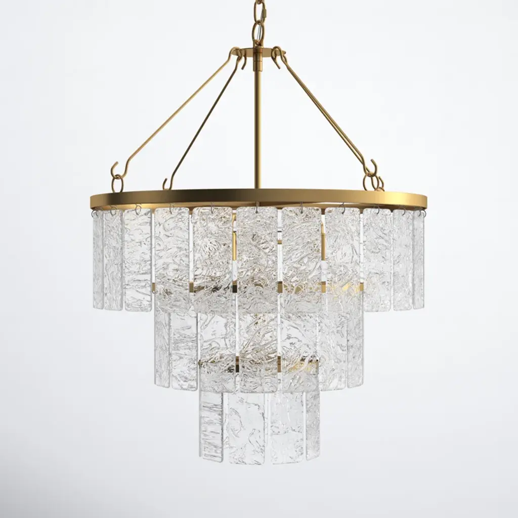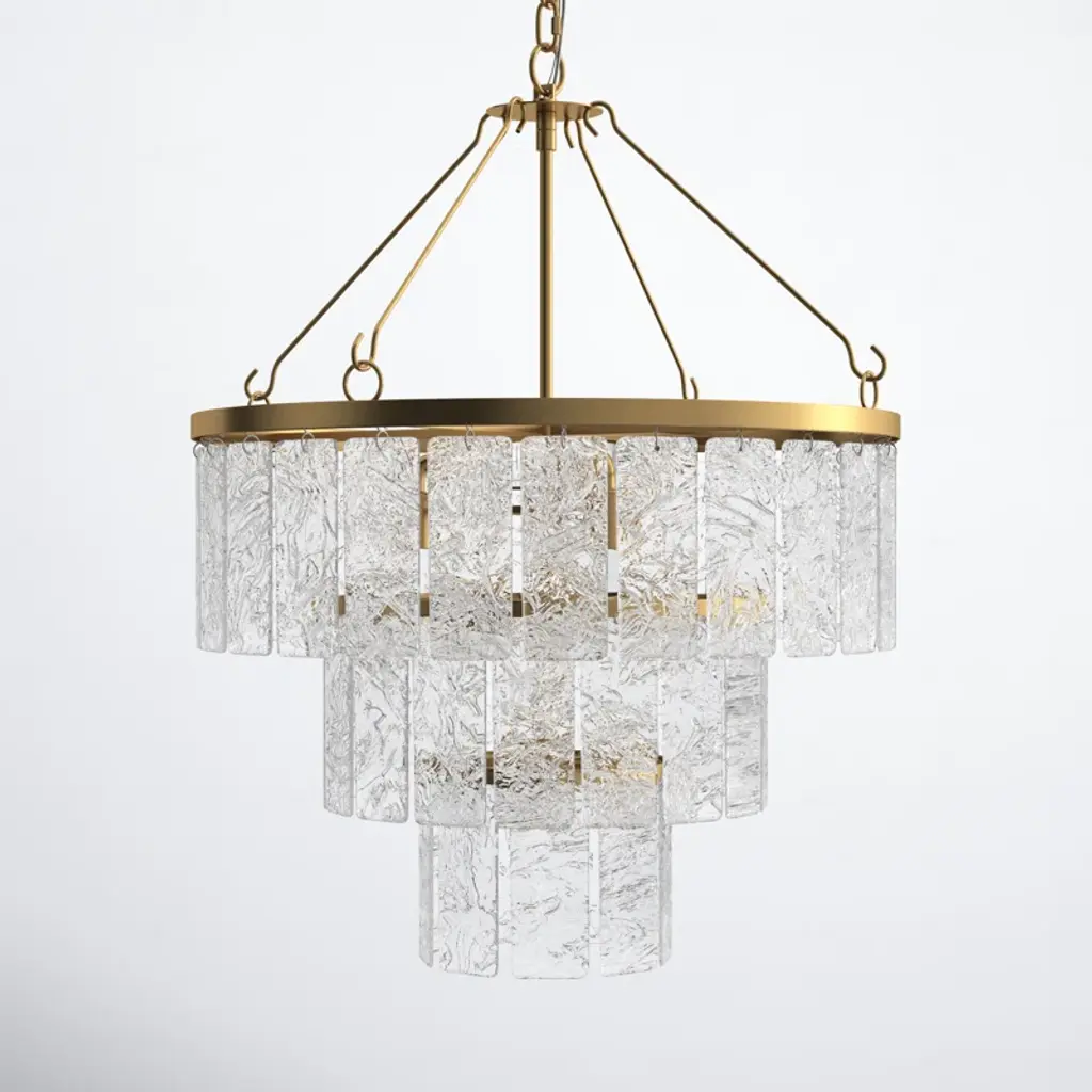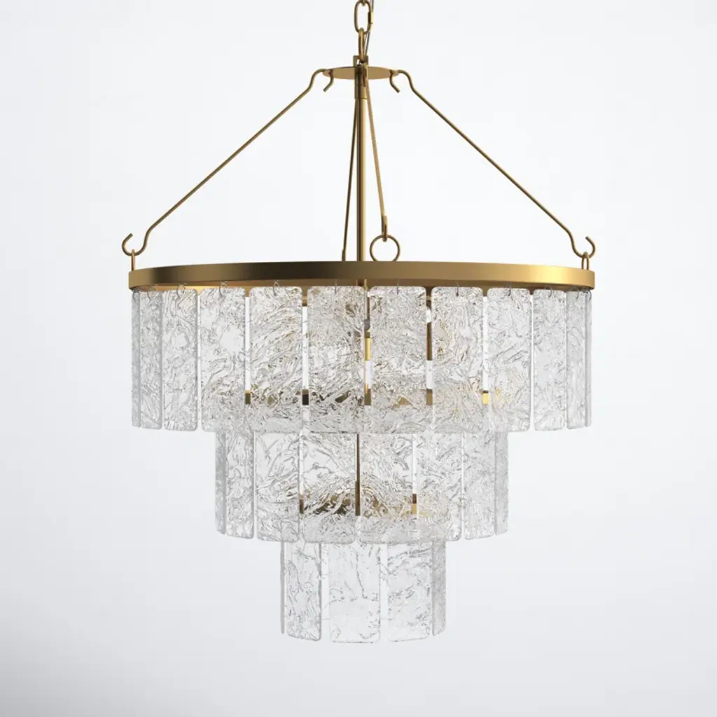 Artistically alluring, this Lockeford chandelier blends all the best of classic elegance and modern glamour. Three tiers of clear textured glass panels create a stunning visual display when lit, and its glimmering gold metal frame elevates the look.