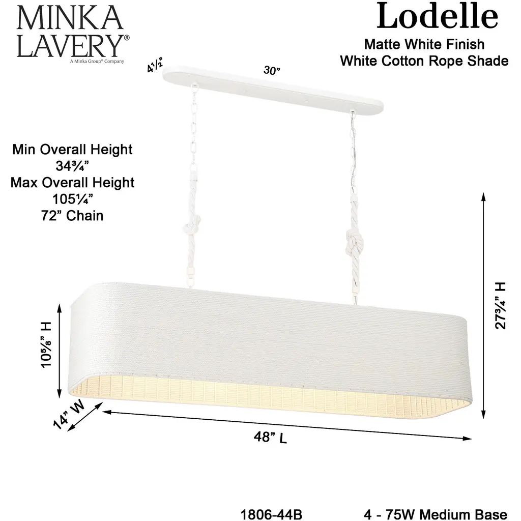 This 4 light Island Chandelier from the Lodelle collection by Minka-Lavery will enhance your home with a perfect mix of form and function. The features include a Matte White finish applied by experts. This item qualifies for free shipping!