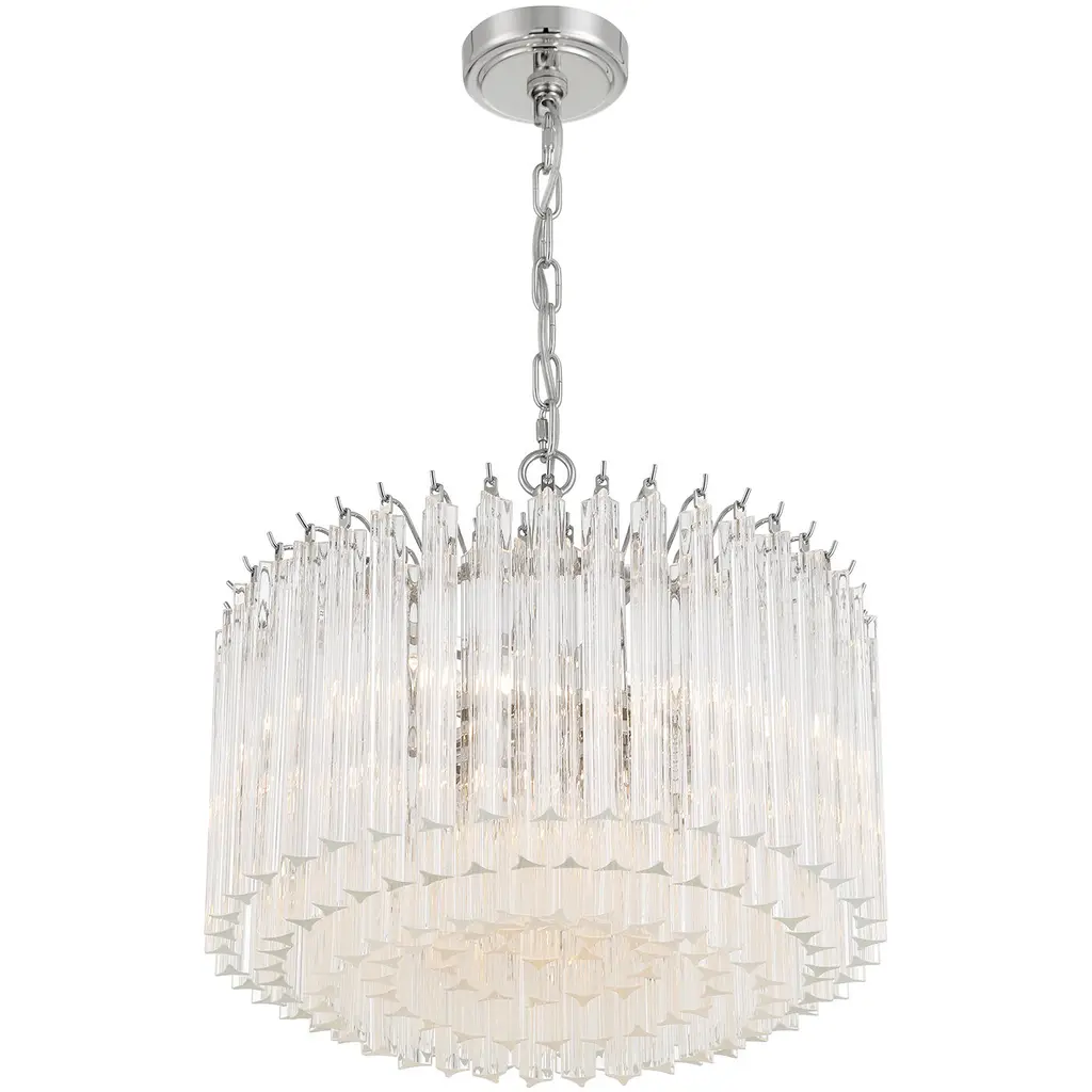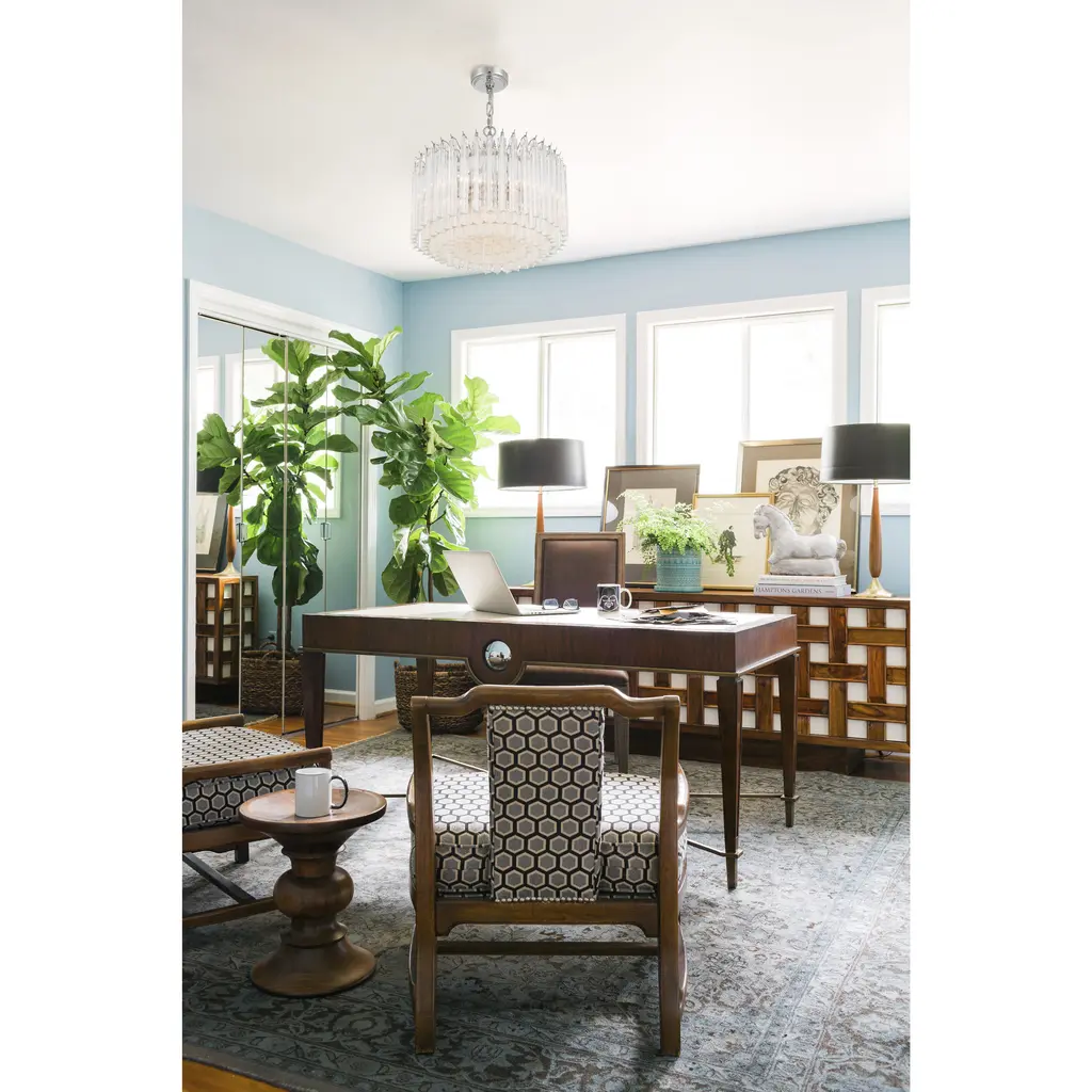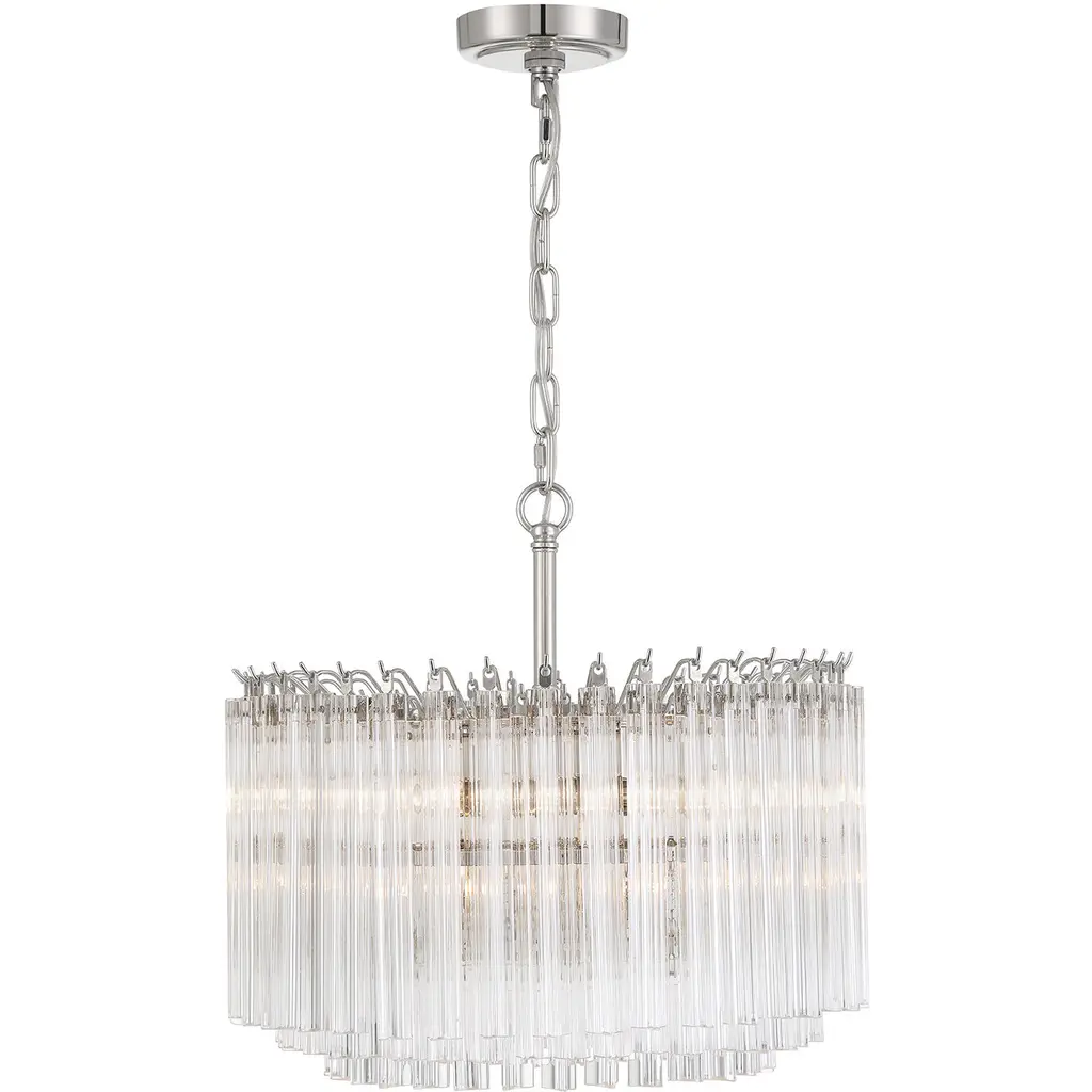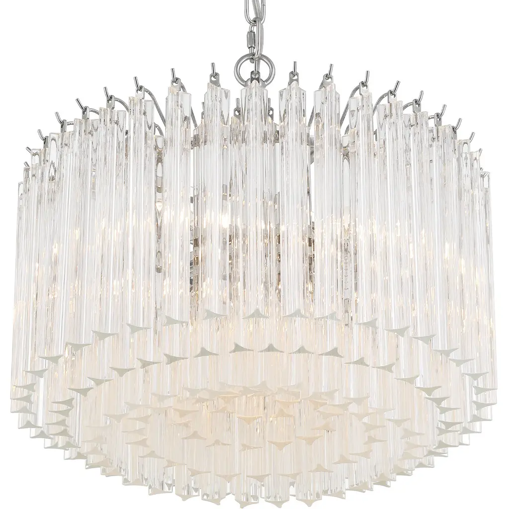 The Lofton Collection showcases mid-century sophistication with its stepped, tiered design and distinctive Triedri glass rods. Created using a technique that involves making triangular cuts on the glass, the Triedri method results in a faceted, crystal-like appearance that enhances sparkle and depth. The glass gracefully cascades downward and inward, framed in polished nickel or aged brass. This dynamic design ensures that the Lofton Collection remains a luxurious and visually striking centerpiece, with its facets reflecting light in captivating ways from any angle.