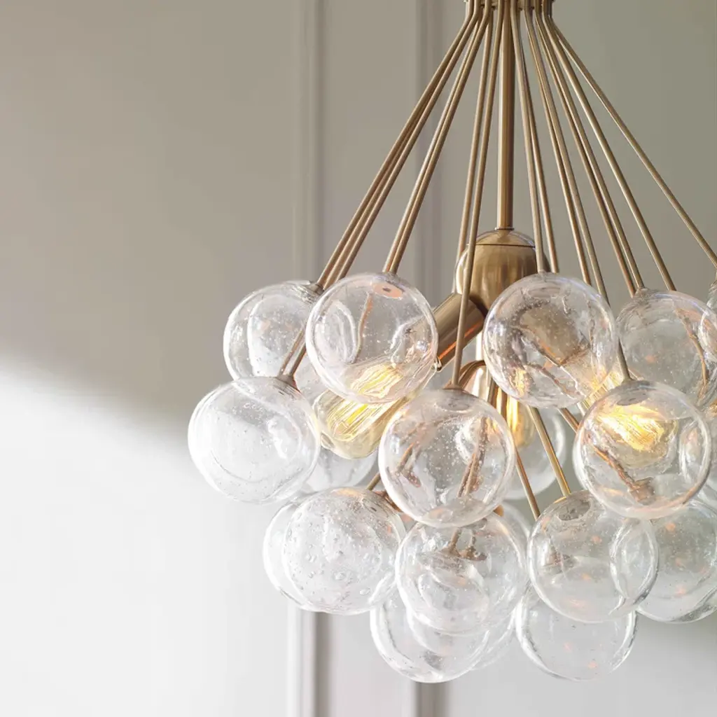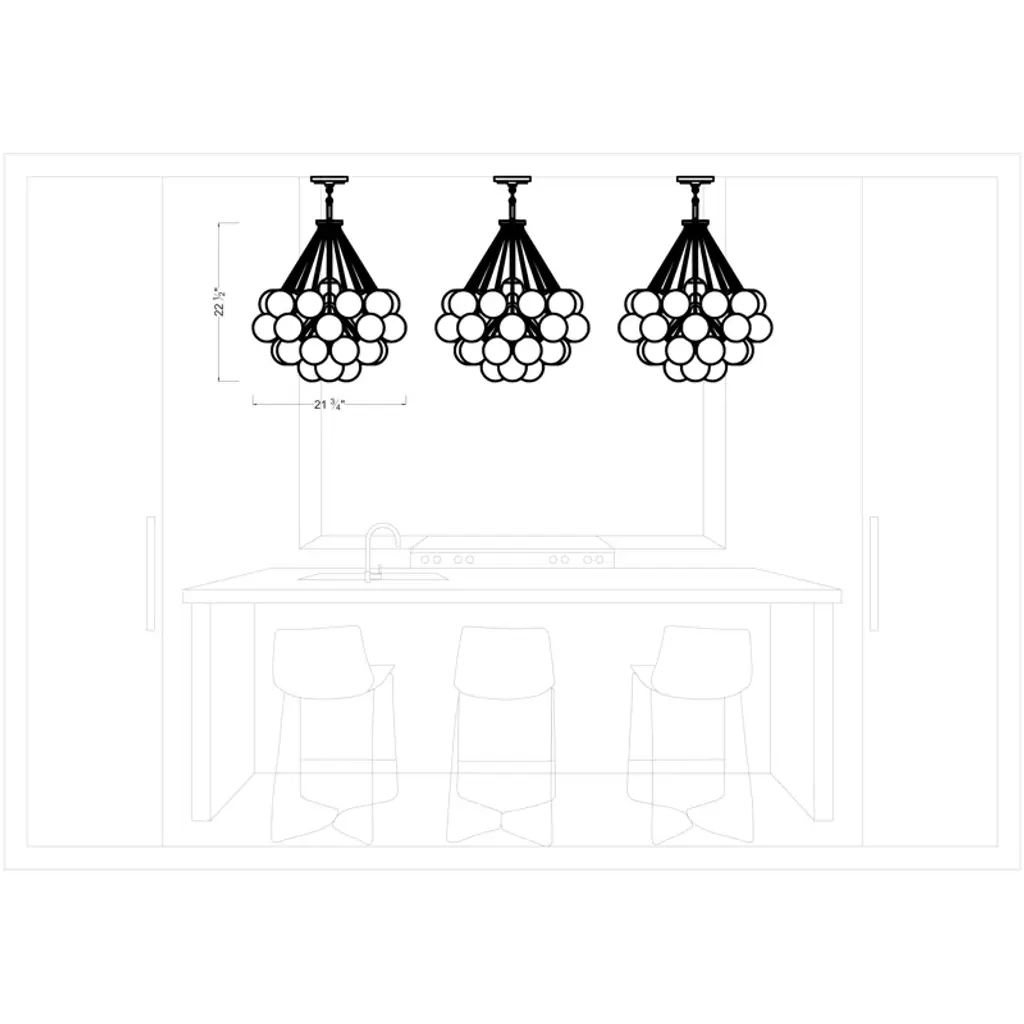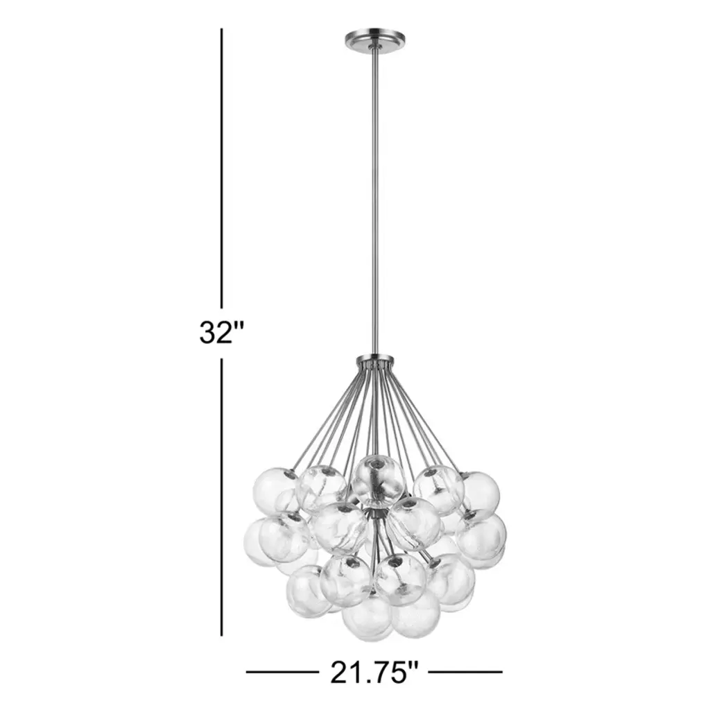 Play up your space with this 3-light cluster pendant that adds a sleek, mid-century aesthetic to your space. Made of steel, it includes an adjustable downrod and is sloped-ceiling compatible. The bubble-like design features three bulbs (sold separately) encased in seeded glass globe shades, surrounded by two tiers of additional glass spheres that artfully reflect the ambient light. Safe for damp areas like bathrooms or covered patios. Install with a dimmer switch to adjust brightness.