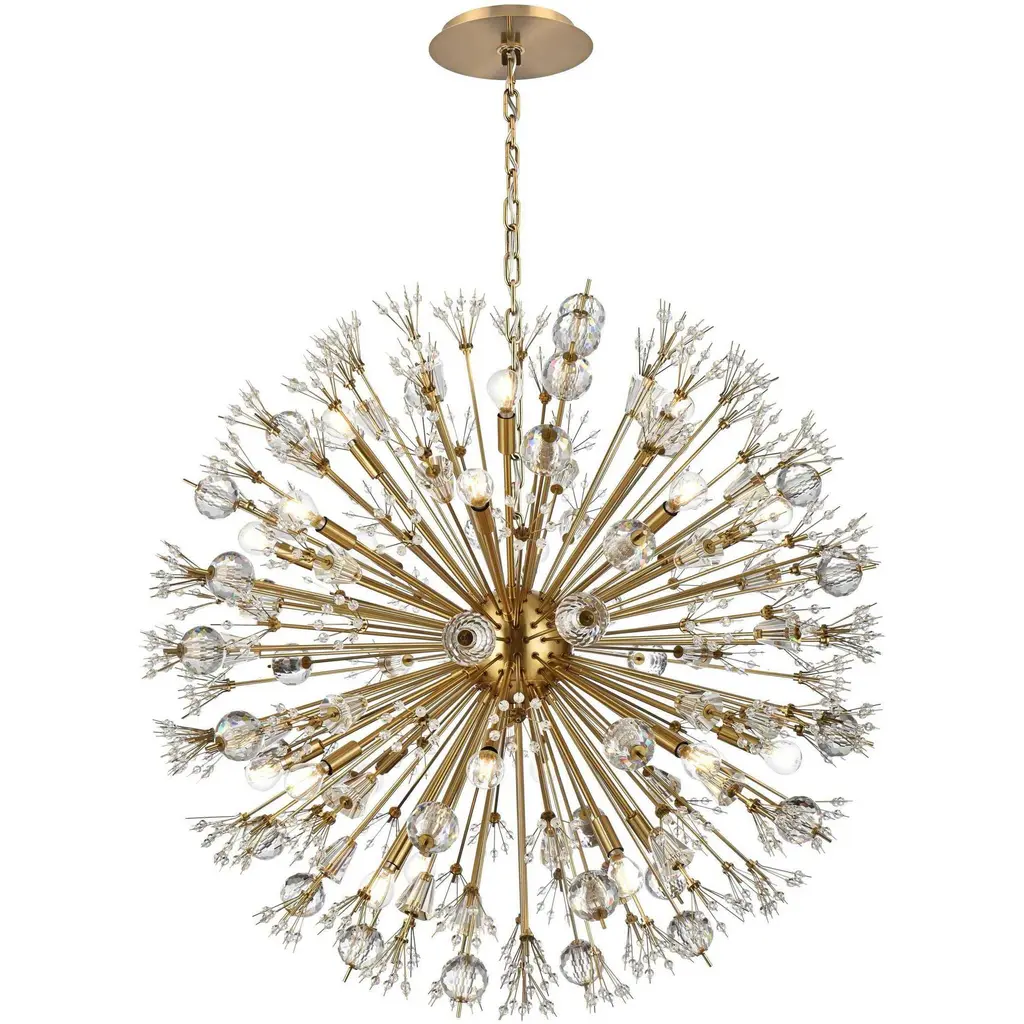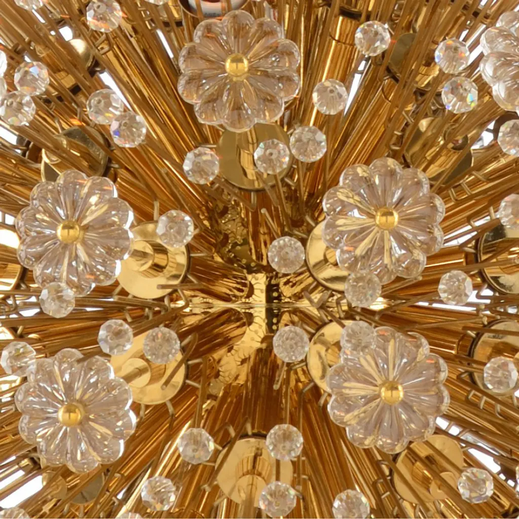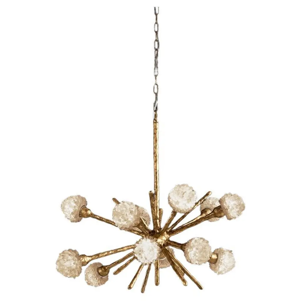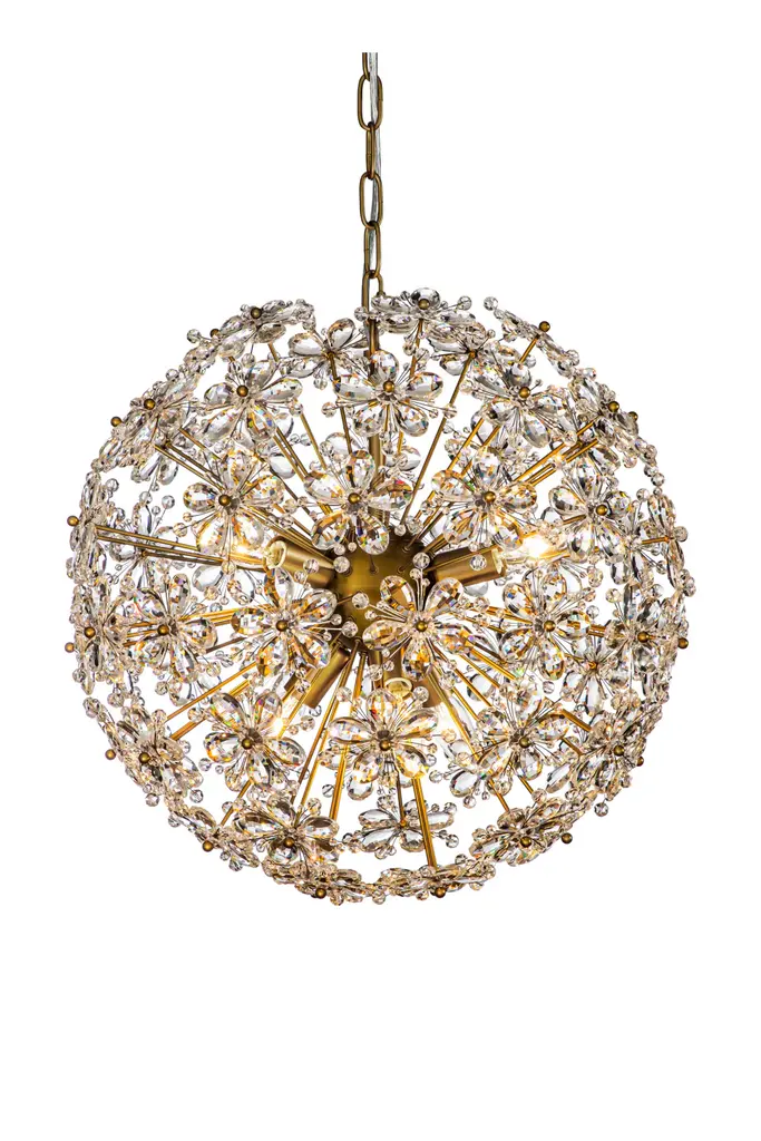 1930's Hollywood Glamour Inspired Our in. Lolita in. modern Regency Chandelier, Sparkling Crystal Flowers And Faceted Beads Burst From The Center Orb. Polished Brass Plated Frame, Ten Lights.