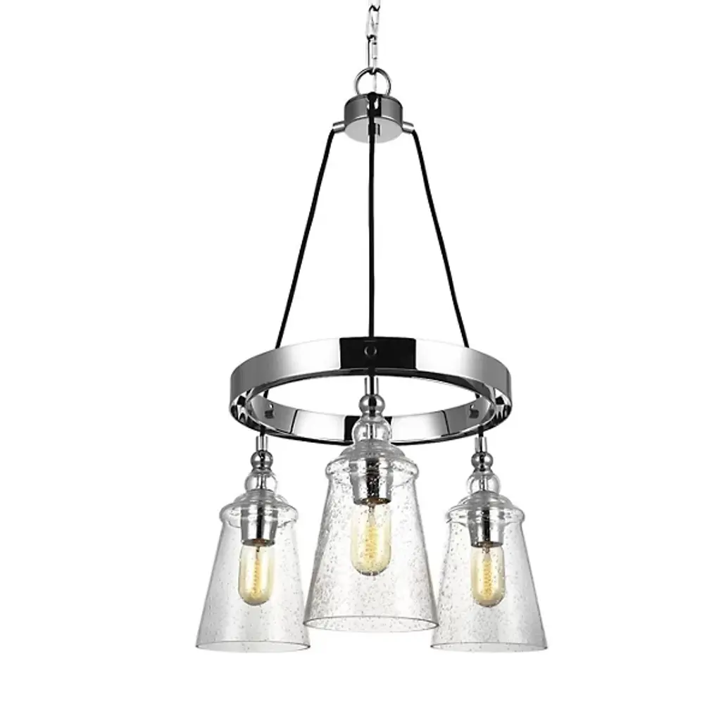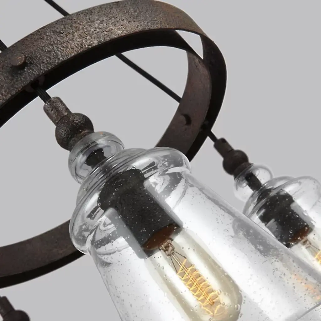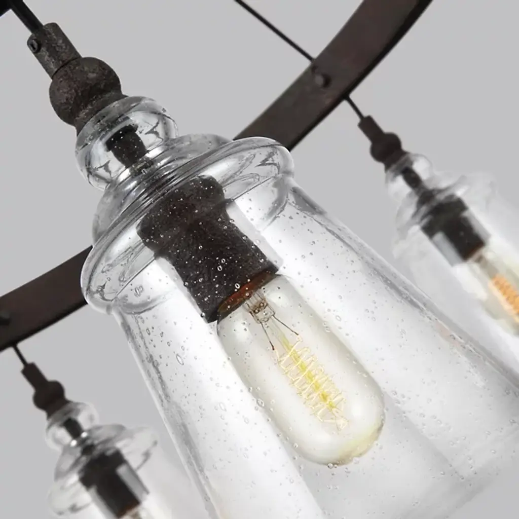 Inspired by historic, industrial design, the Loras Chandelier by Generation Lighting, formerly known as Feiss, brings a strong, traditional aesthetic to your interior décor. Its body consists of a ringed Dark Weathered Iron-finished frame from which several hand-crafted Clear Seeded glass shades suspend. Each shade contains a vintage Edison bulb, adding to the rugged motif while providing a warm ambiance that is both pleasant and useful.