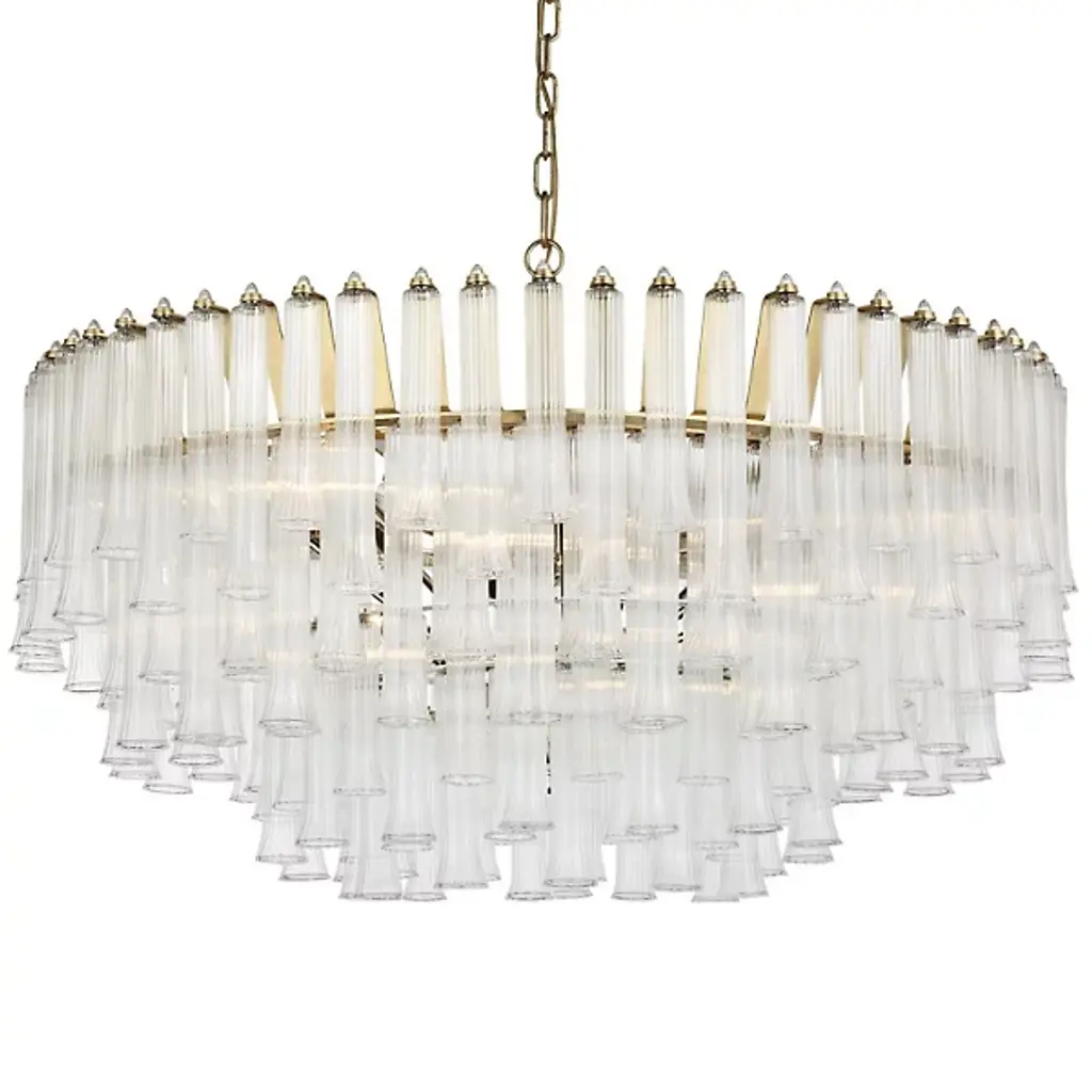 The Lorelei Chandelier from Visual Comfort Signature, formerly known as Visual Comfort, fills out the space overhead with an arresting composition of sculptural glass and a shimmering light. This grand piece proves ideal in open spaces like the foyer or living room. Its sense of scale grabs one’s attention. Crafted from metal, the chandelier’s framework cascades in elegant tiers. The fluted glass forms fix to the framework with a floating visual. The long striations and the flared curves of the glass forms lead the eyes down. Golden light textures up the glass with highlights, translating to a radiant, surrounding glow.